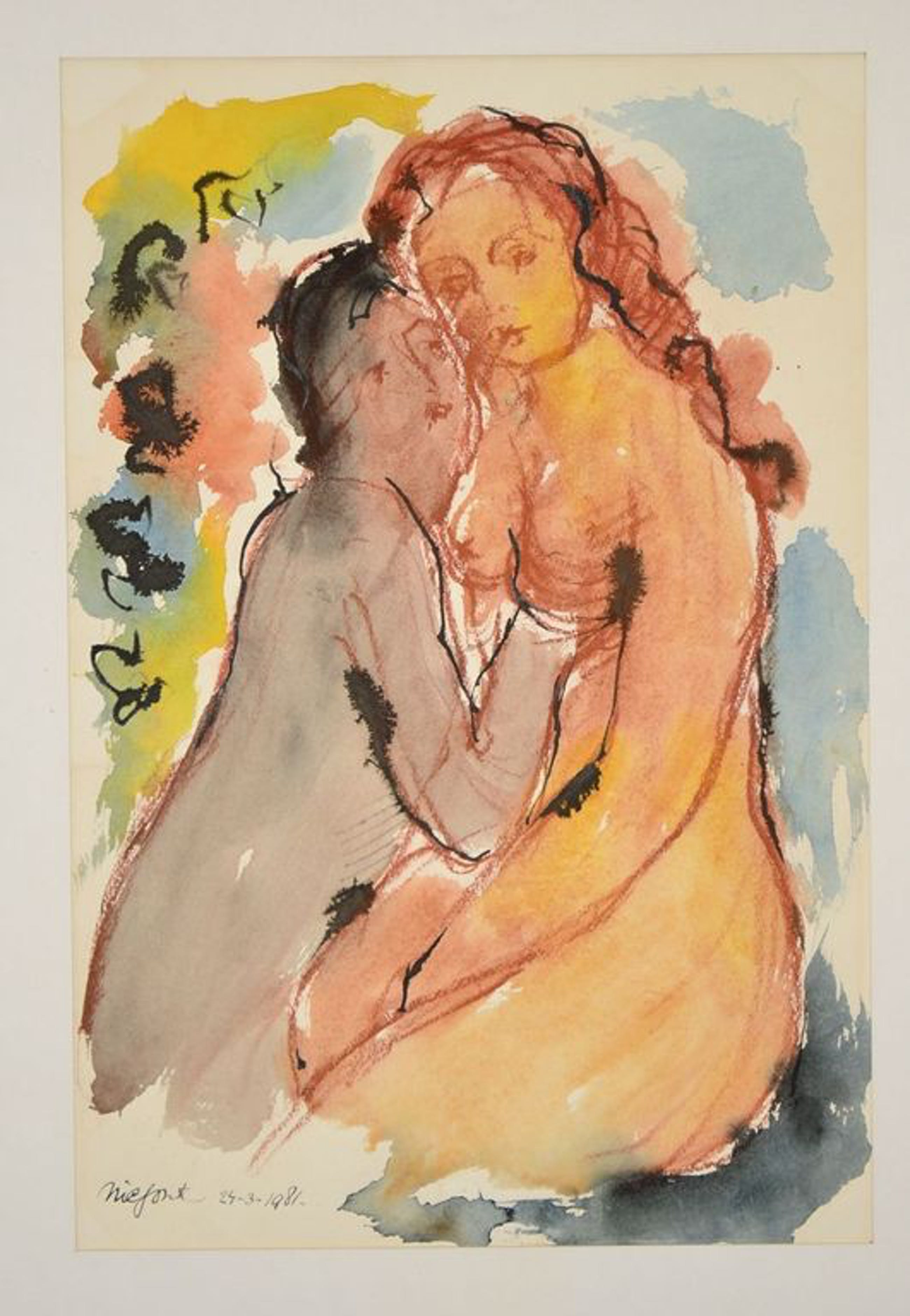 Mooie grote aquarel van Nic Jonk. Jonk’s monumentale beeldhouwwerken staan op verschillende, vaak prominente plekken op de wereld. Ook zijn schilderijen worden zeer goed gewaardeerd en hebben doorgaans dezelfde thema’s als zijn beelden.