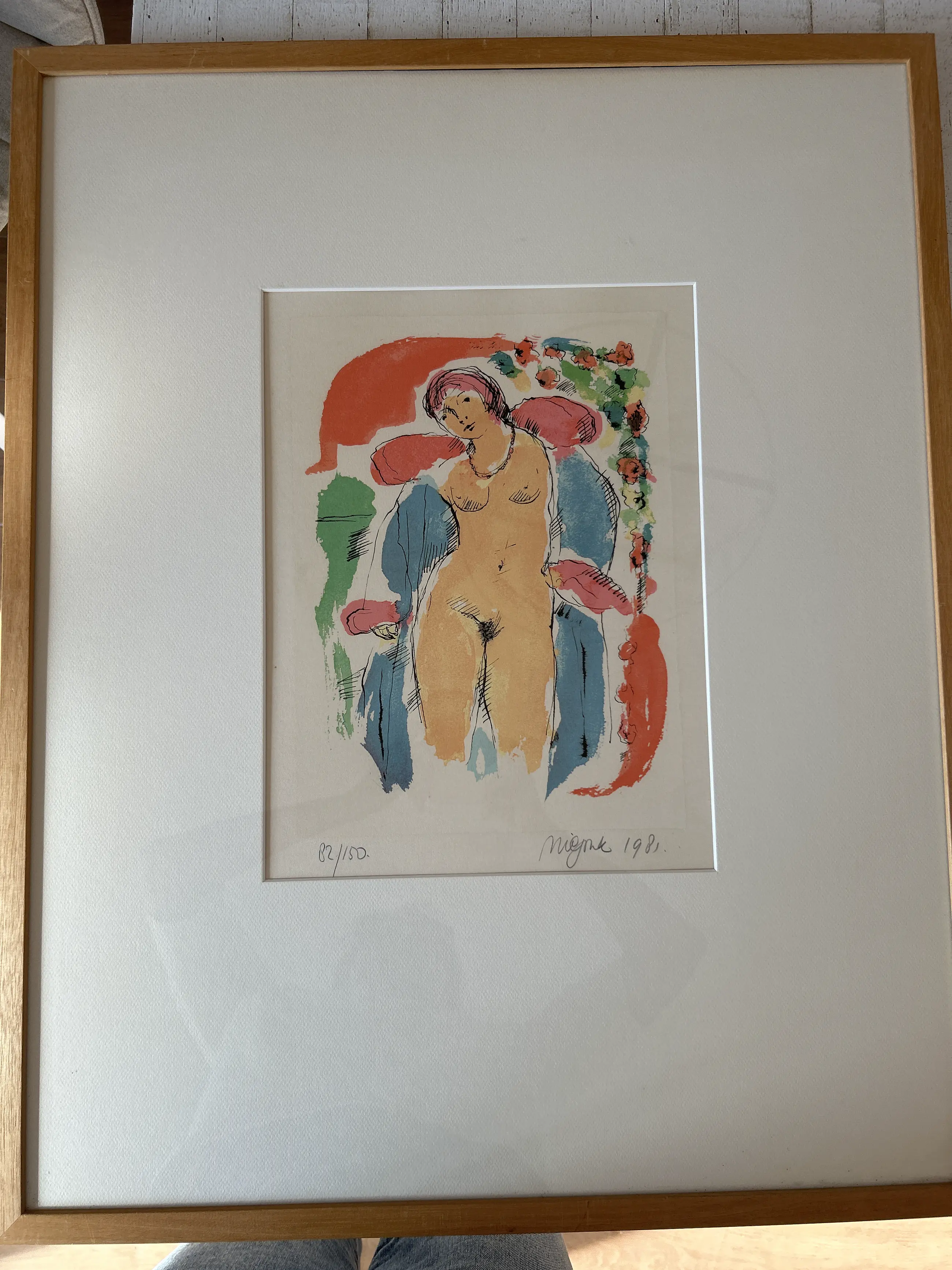Mooi werk van Nic Jonk. Vrouwelijk schoon prachtig afgebeeld met ogenschijnlijk simpele lijnen, in kleurrijk geheel neergezet. Het werk is professioneel ingelijst in moderne houten lijst. 82/150 Locatie werk: Lemmer Af te halen in Lemmer.