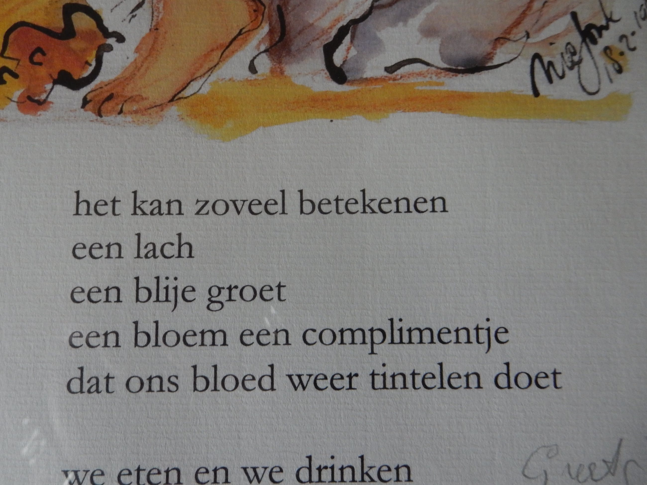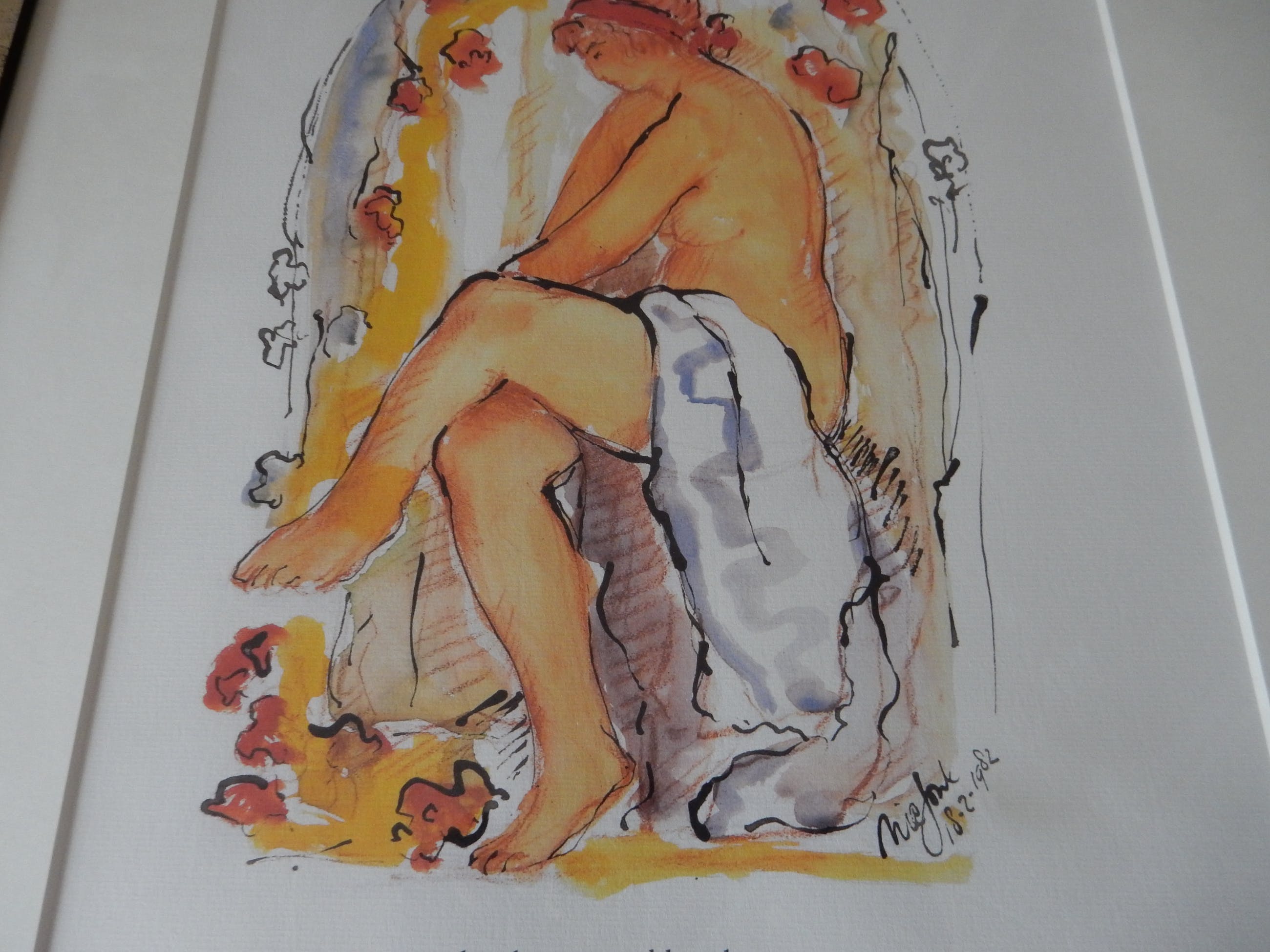 aquarel van nic jonk zittend naakti met een spreuk onderaan