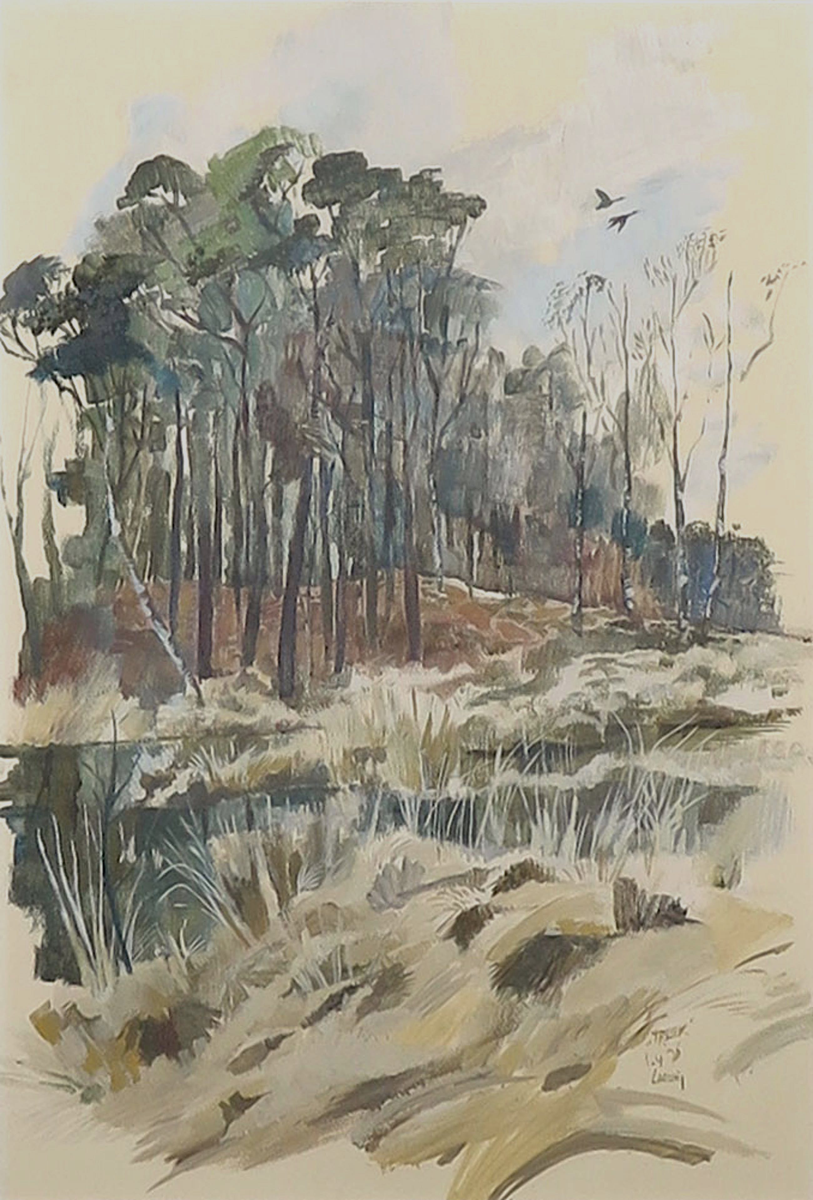 1 ) Nic Loning (1925) - Treek, boslandschap met vogels - Acryl/Aquarel - 1976 - 46x34 cm - i.z.g.s.