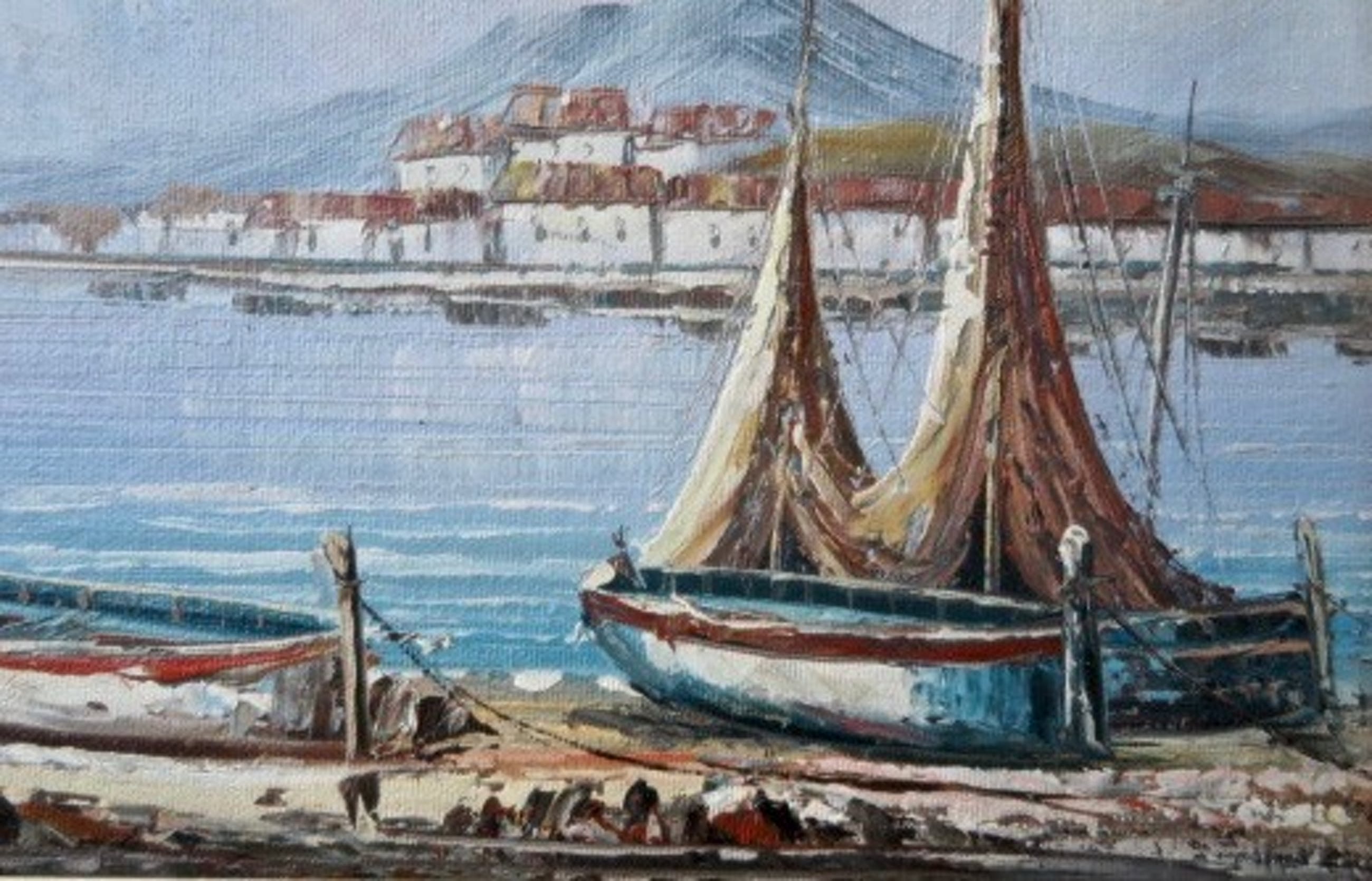 2) Scheepjes aan de Middellandse Kust - Olieverf op doek (22x27 cm) - Onduidelijk gesigneerd - Ingelijst in leuk geprofileerd diep houten lijstje met linnen binnenkader (32x36 cm) -