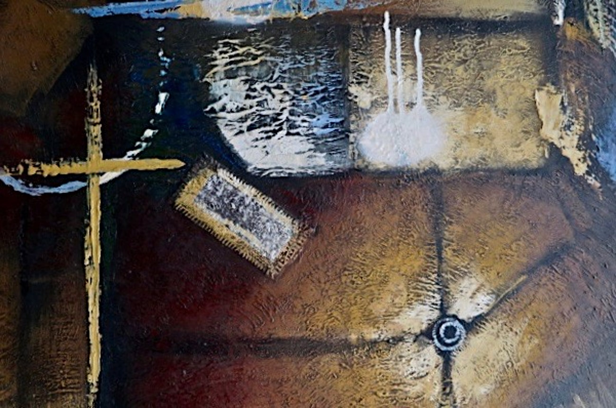 4) Abstract 3D - Z.T. - Achterzijde: monogram AV en datering 1996 - In okergeel-blauw-zilver- bruintinten - Gemengde techniek Acryl en collage - 60x60x4 cm - i.z.g.s.