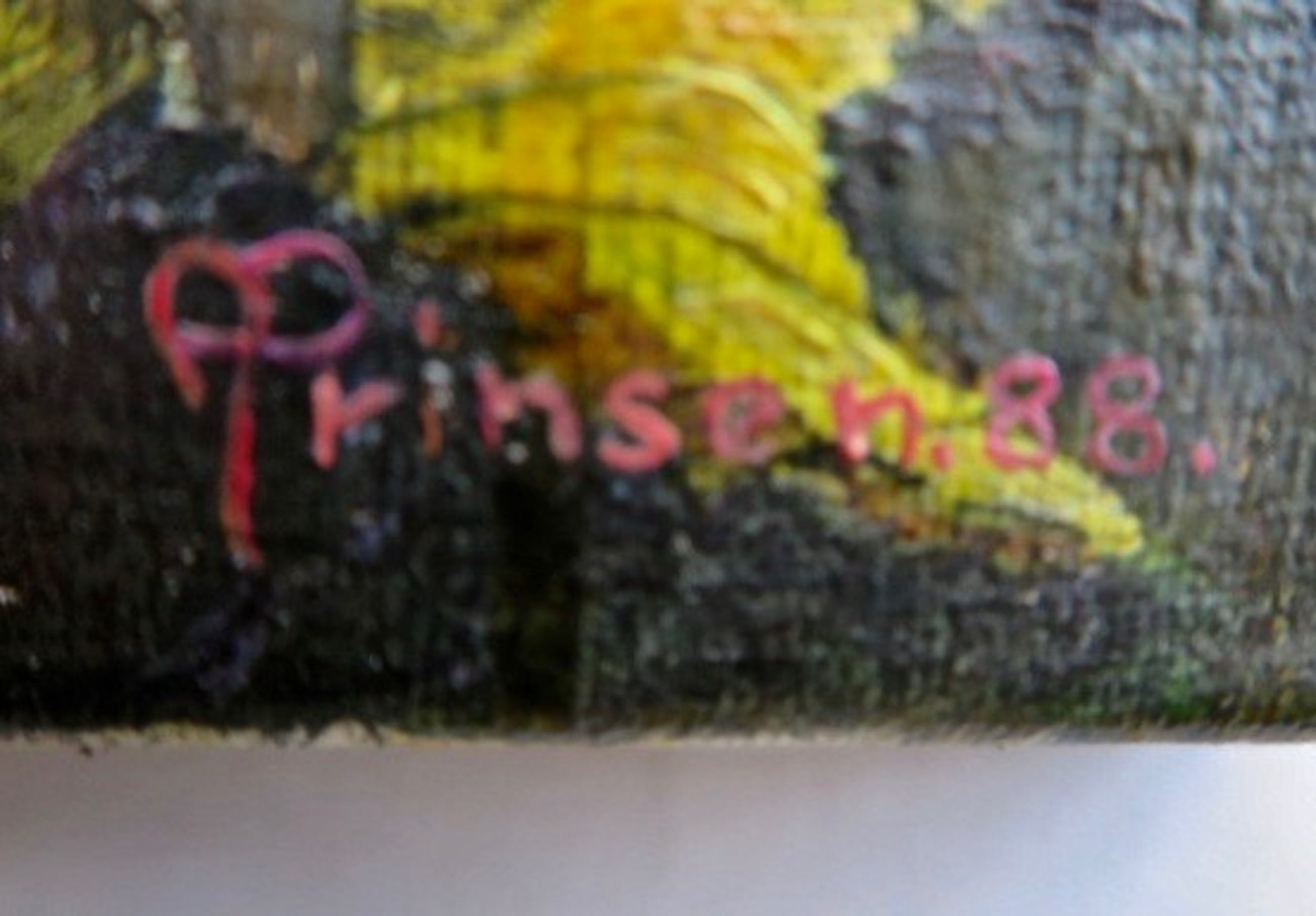 3) Piet Prinsen - Bloemstilleven Wilde Roos - Olieverf op doek - 30x25 cm - 1988 - Conditie goed; lichte randschade die wegvalt indien ingelijst