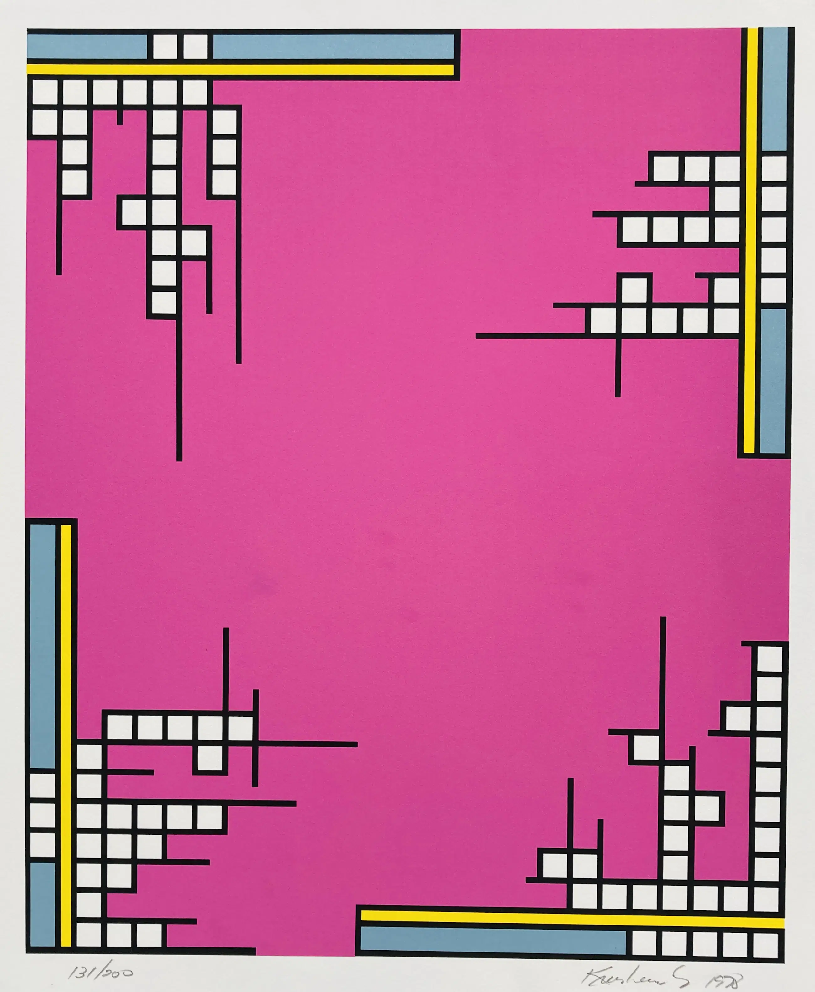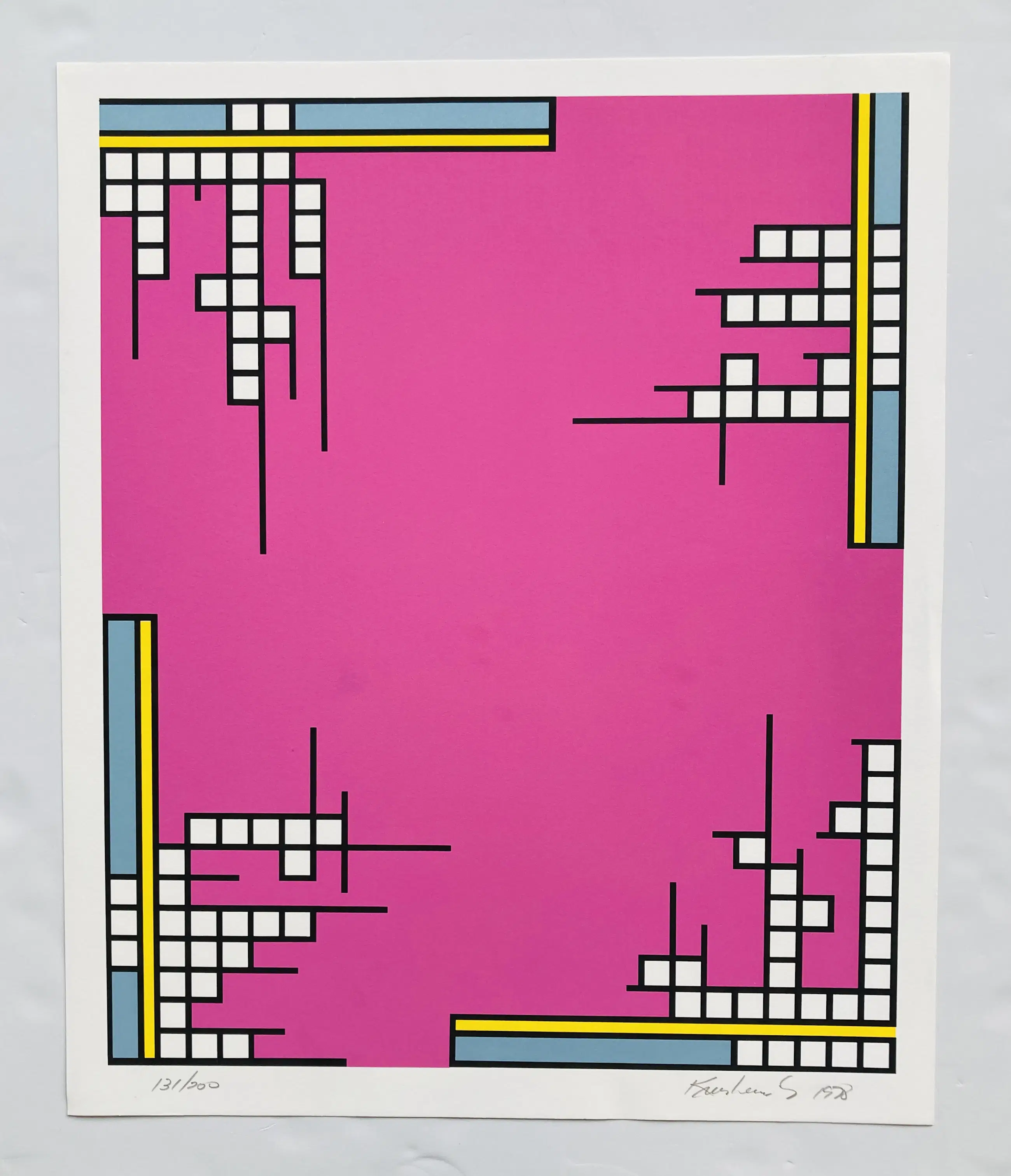 Een prachtig kunstwerk van de Amerikaanse kunstenaar Nicholas Krushenick (1929 - 1999). Het werk verkeert in uitstekende conditie en is handgesigneerd door de kunstenaar. Het werk is prachtig van kleur en heeft een oplagenummer van 131/200.