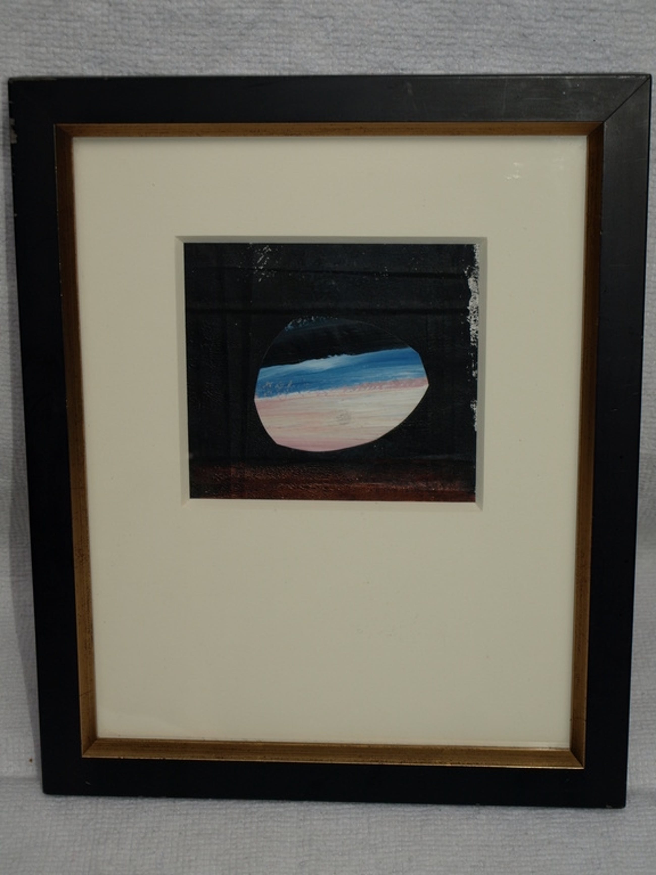 Ingelijst: Ja, een zwart-metalen lijst met gouden rand en een wit passe-partout met glasplaat.