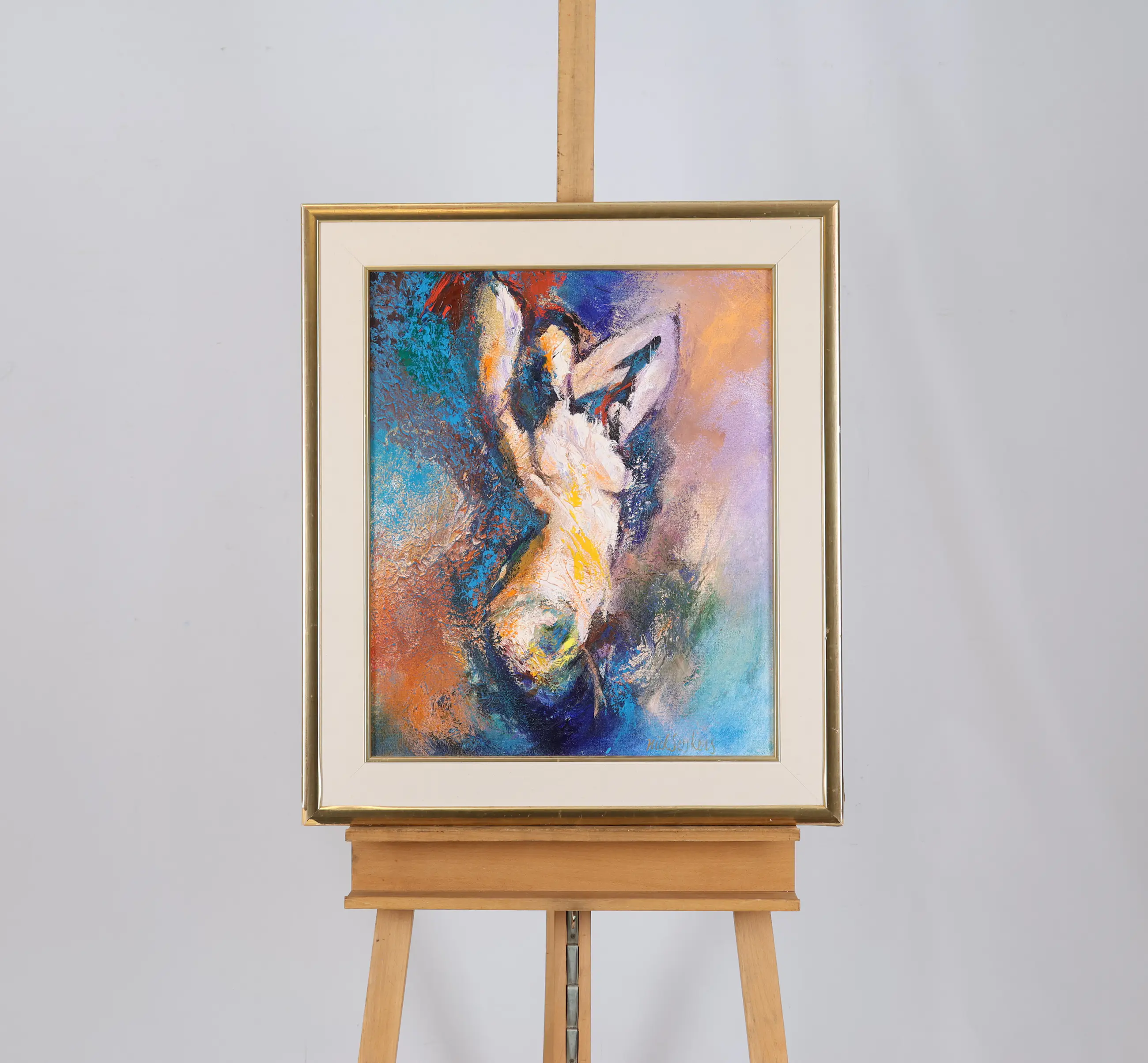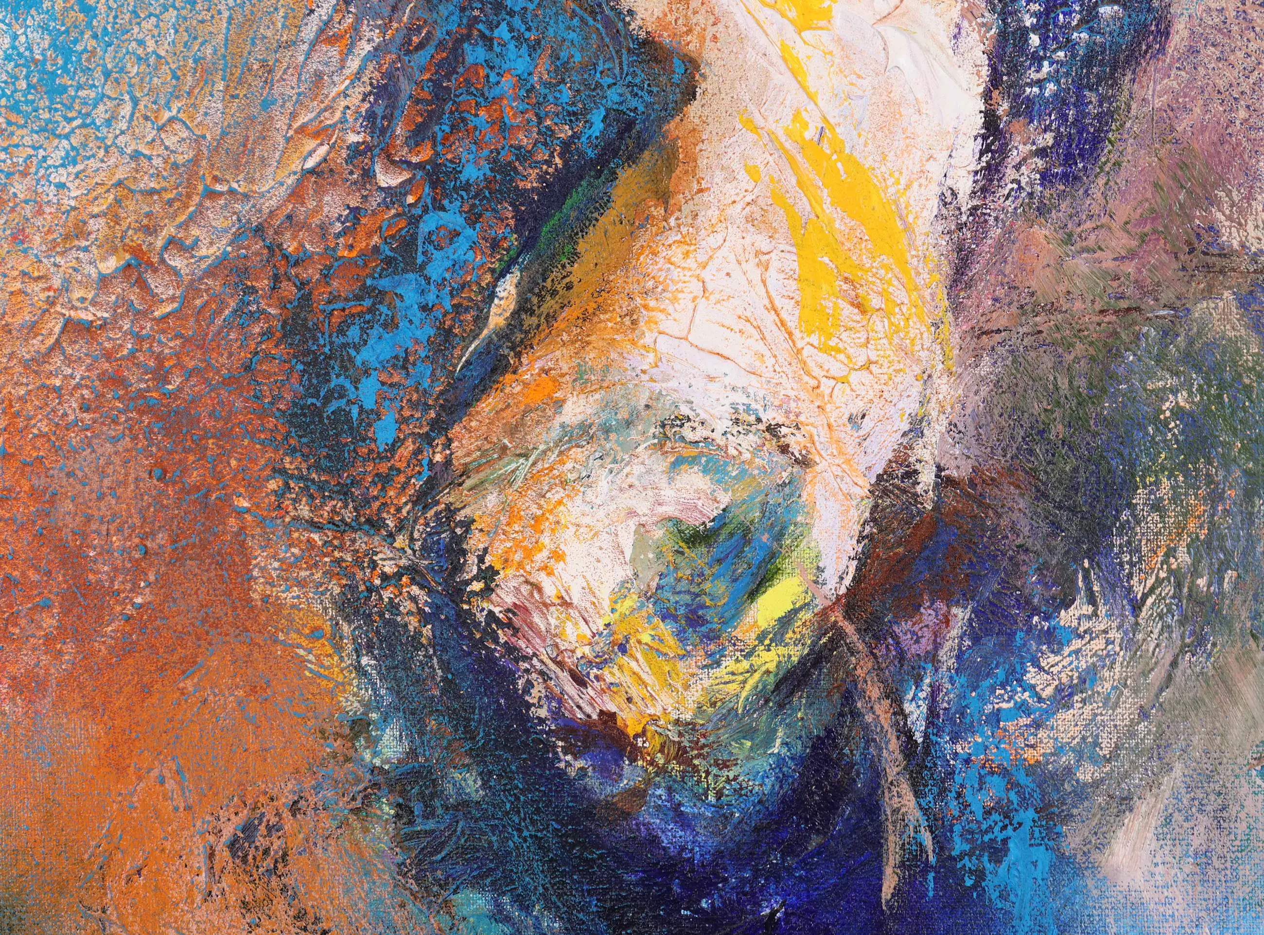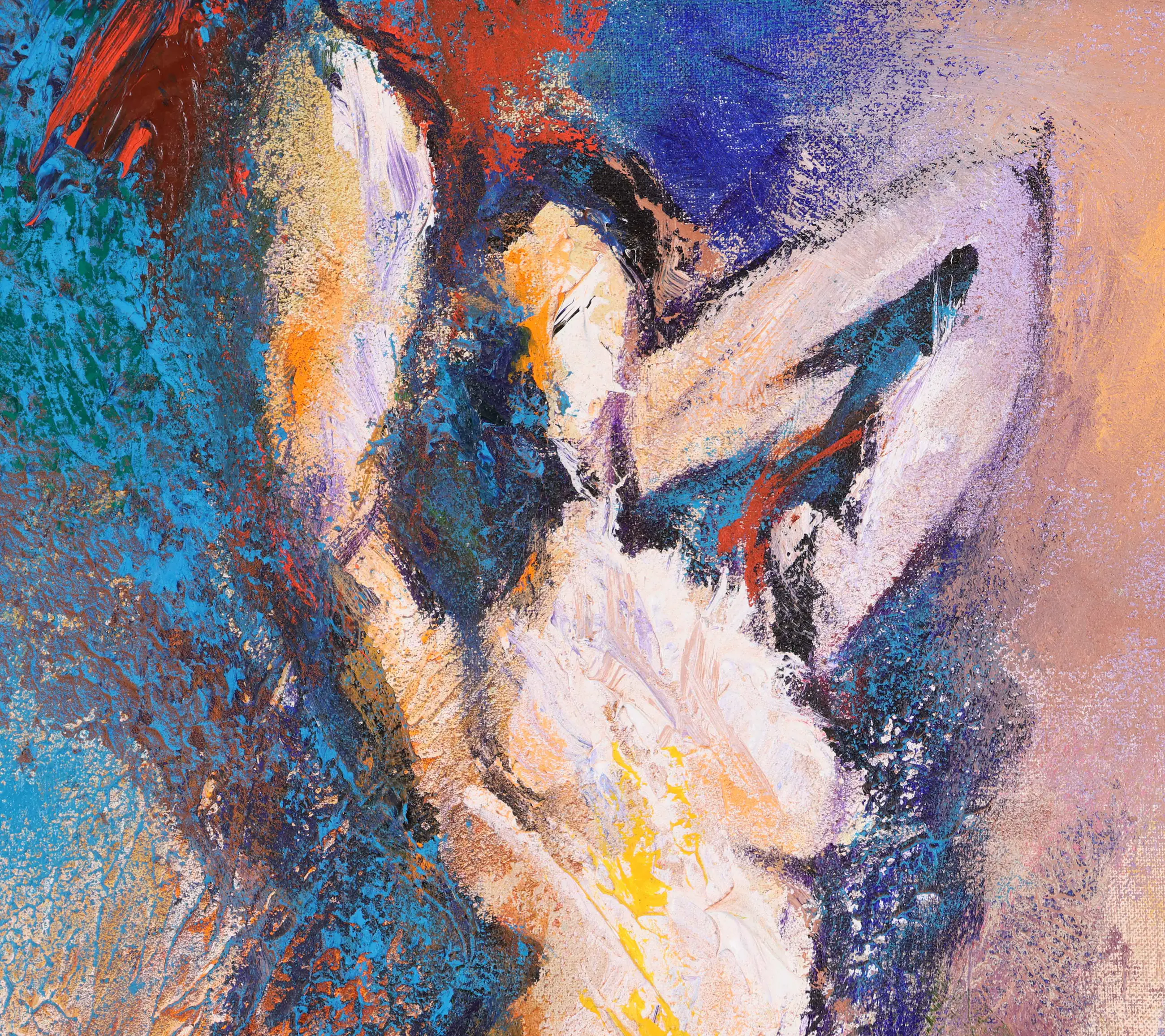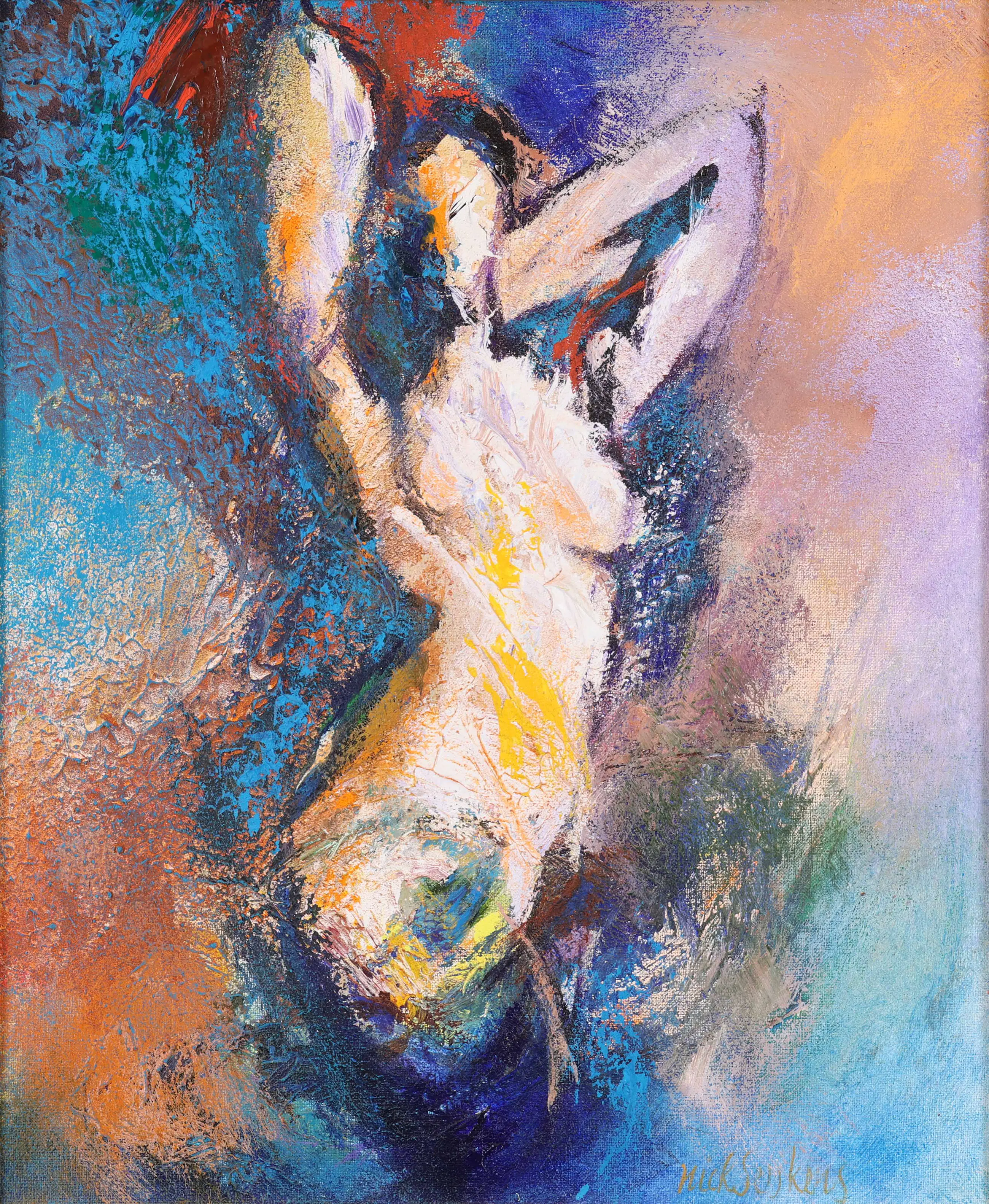 Dit olieverfschilderij op doek van Nick Seijkens getuigt van een grote hartstocht. Als kunstenaar blijft hij zichzelf telkens opnieuw uitvinden in een voortdurende zoektocht naar verwondering. Voor hem staat het schilderproces centraal: het experimenteren met nieuwe technieken en het vinden van oplossingen zijn minstens zo belangrijk als het uiteindelijke resultaat. Zijn werk kenmerkt zich door krachtige, bijna explosieve kleurgebruik, waarin een beweging voelbaar is van duisternis naar licht. Daarnaast grijpt Seijkens regelmatig terug op oude mythen, die hij vertaalt naar een hedendaagse context.