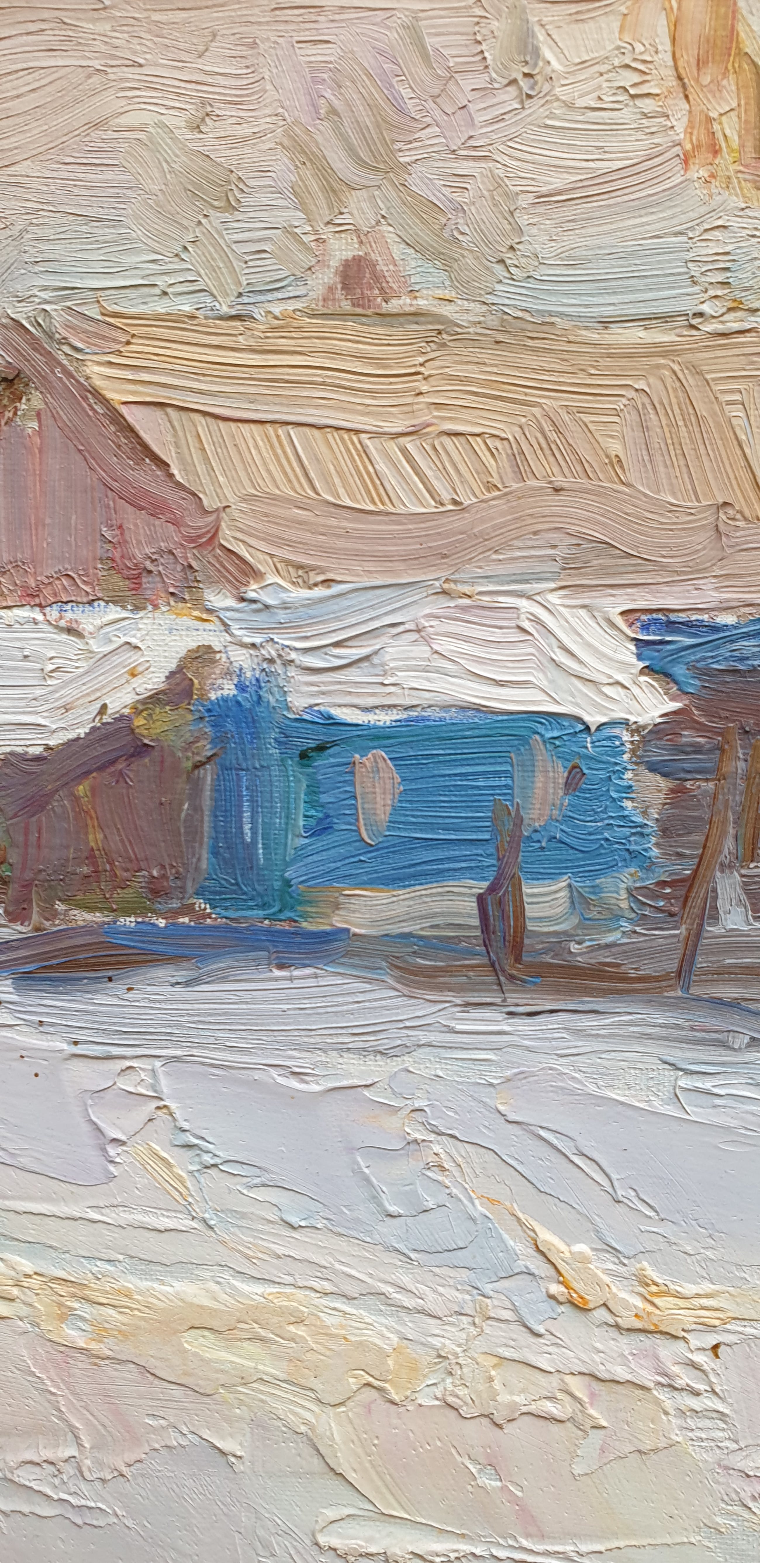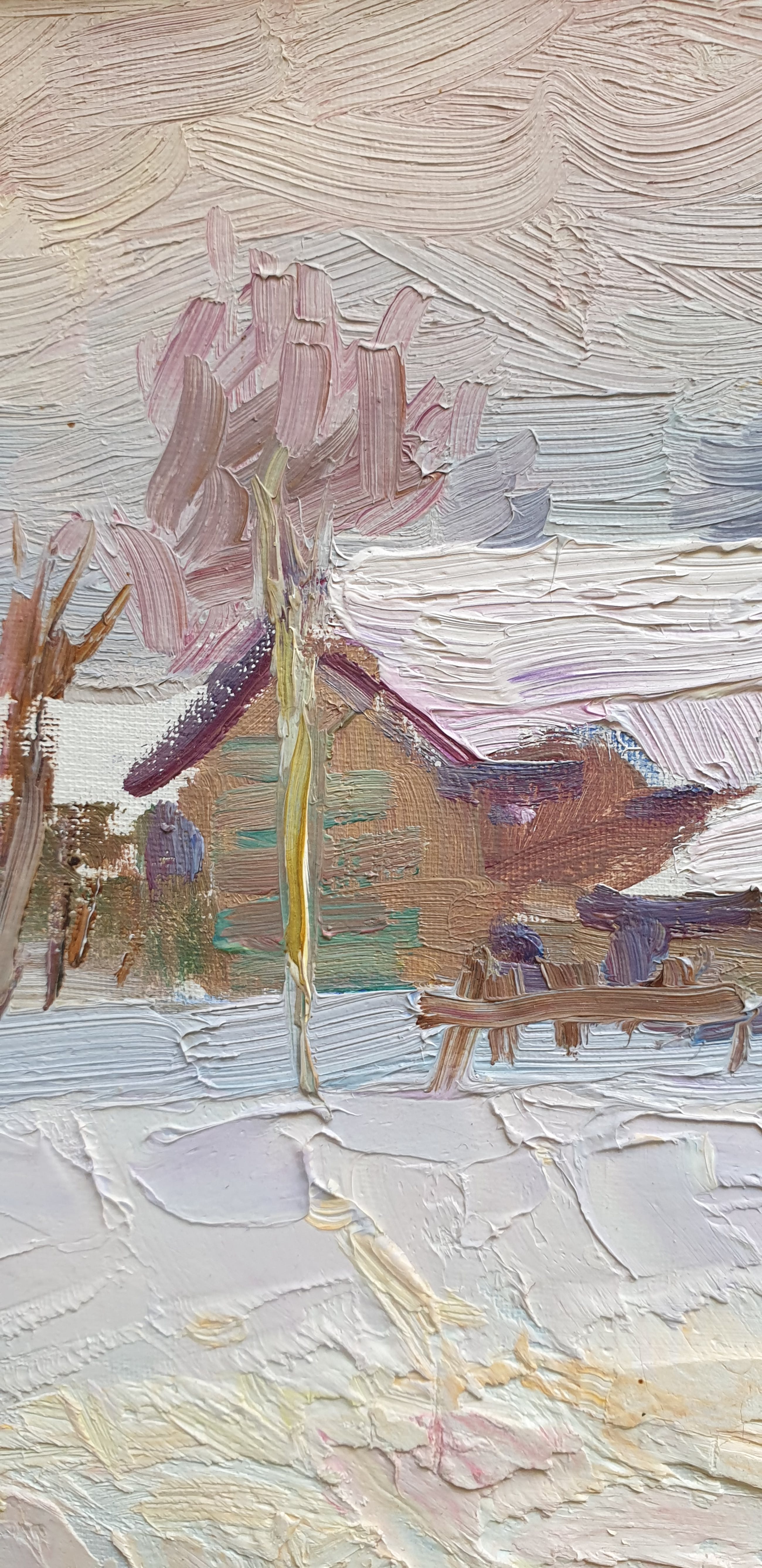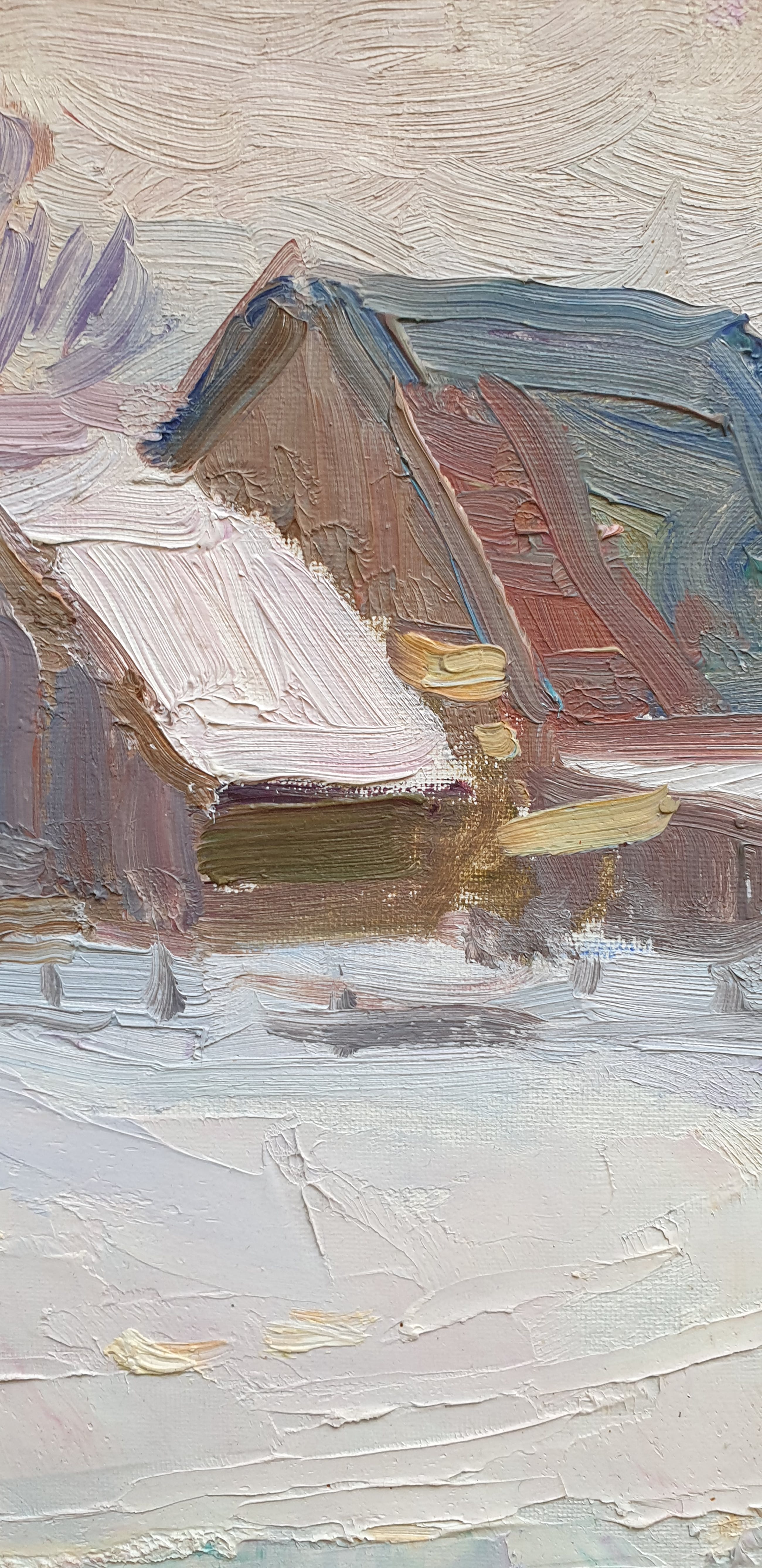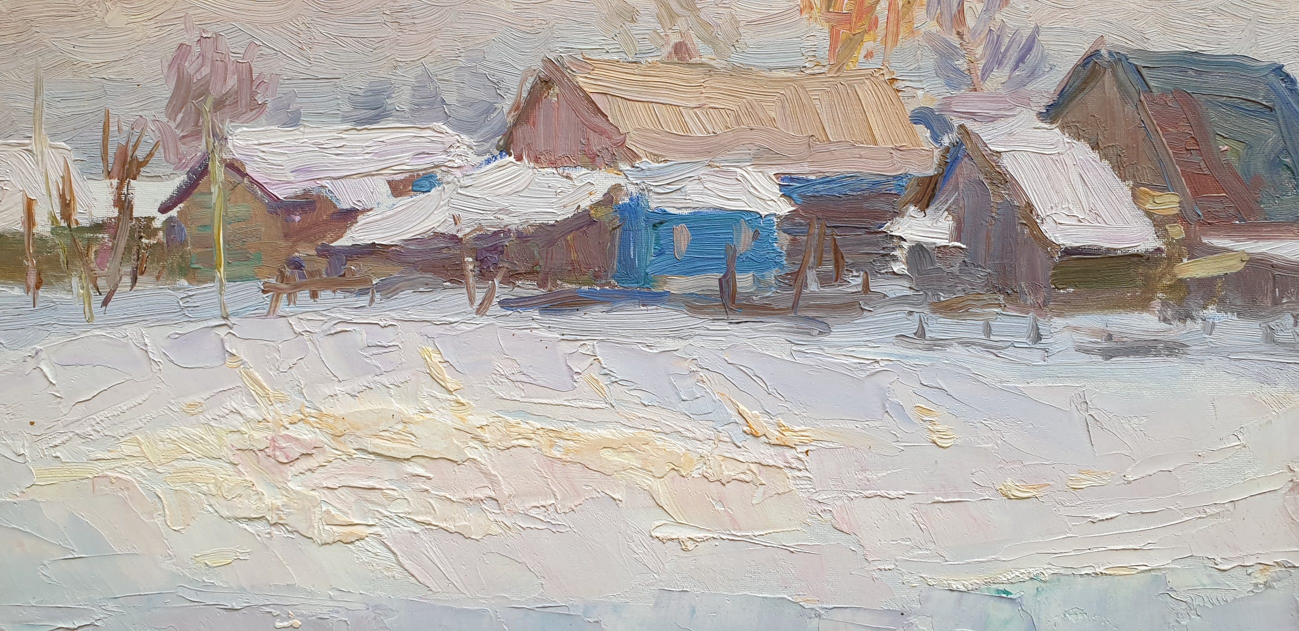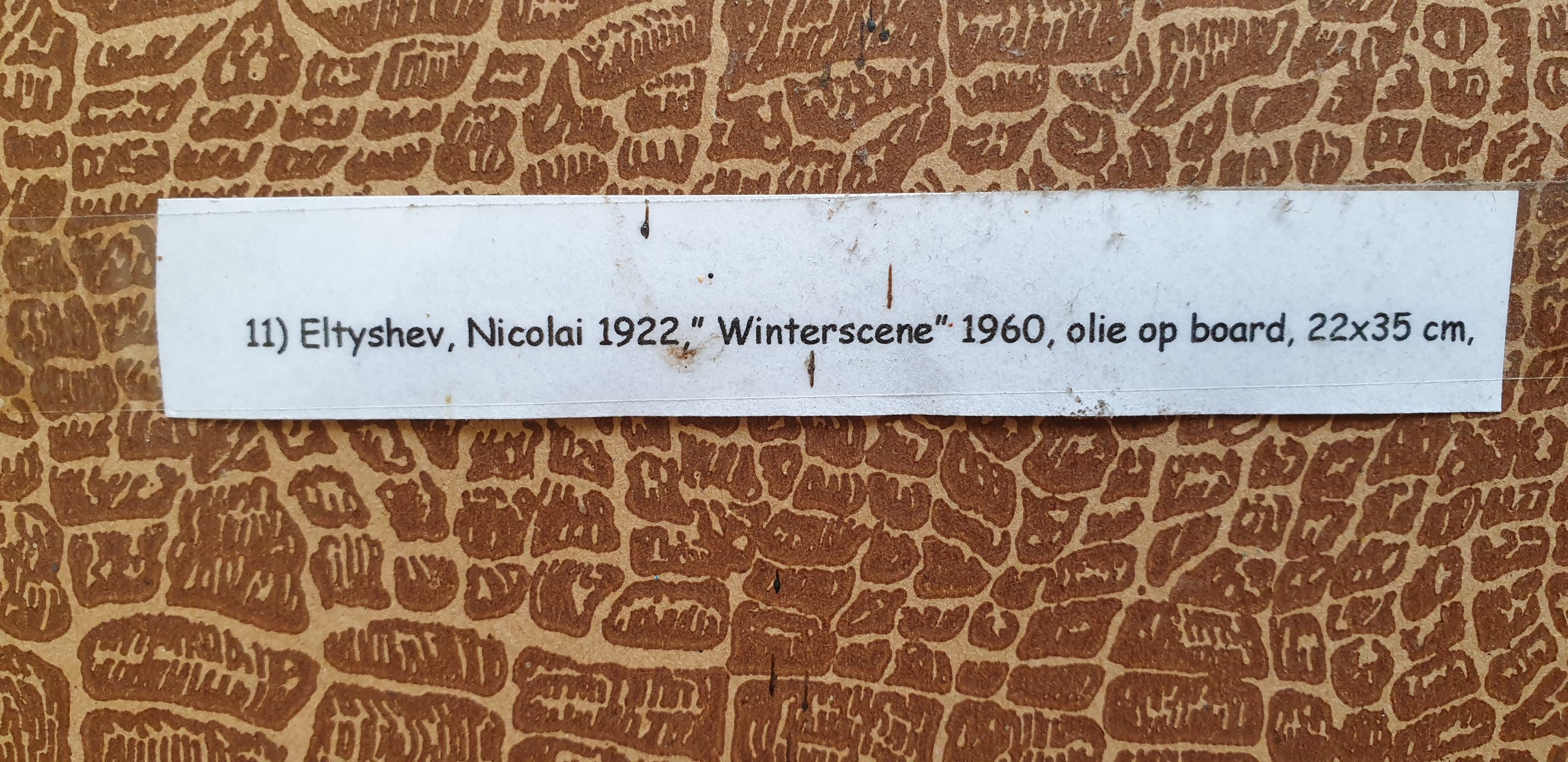 Stijl: Russisch Impressionisme, Sociaal Realisme Een werk van Nicolai I. Eltyshev. Het toont een dorpje in de barre winter. Het dorpje waar de schilder zelf woonde. Gesigneerd aan de achterzijde. Over de schilder zelf: geboren in Kansk, provincie Enisei in 1922. Studeerde aan de Surikov kunstacademie. Gespecialiseerd in landschappen. Lid van de Unie van de Kunstenaars van Rusland. Deelnemer aan alle grote exposities in de Sovjet Unie vanaf 1954. Actief in Zhavoronki, regio Moskow. Zijn werken bevinden zich in privé inzamelingen in Rusland alsmede in vele West Europese landen. Geprezen meesterschilder.
