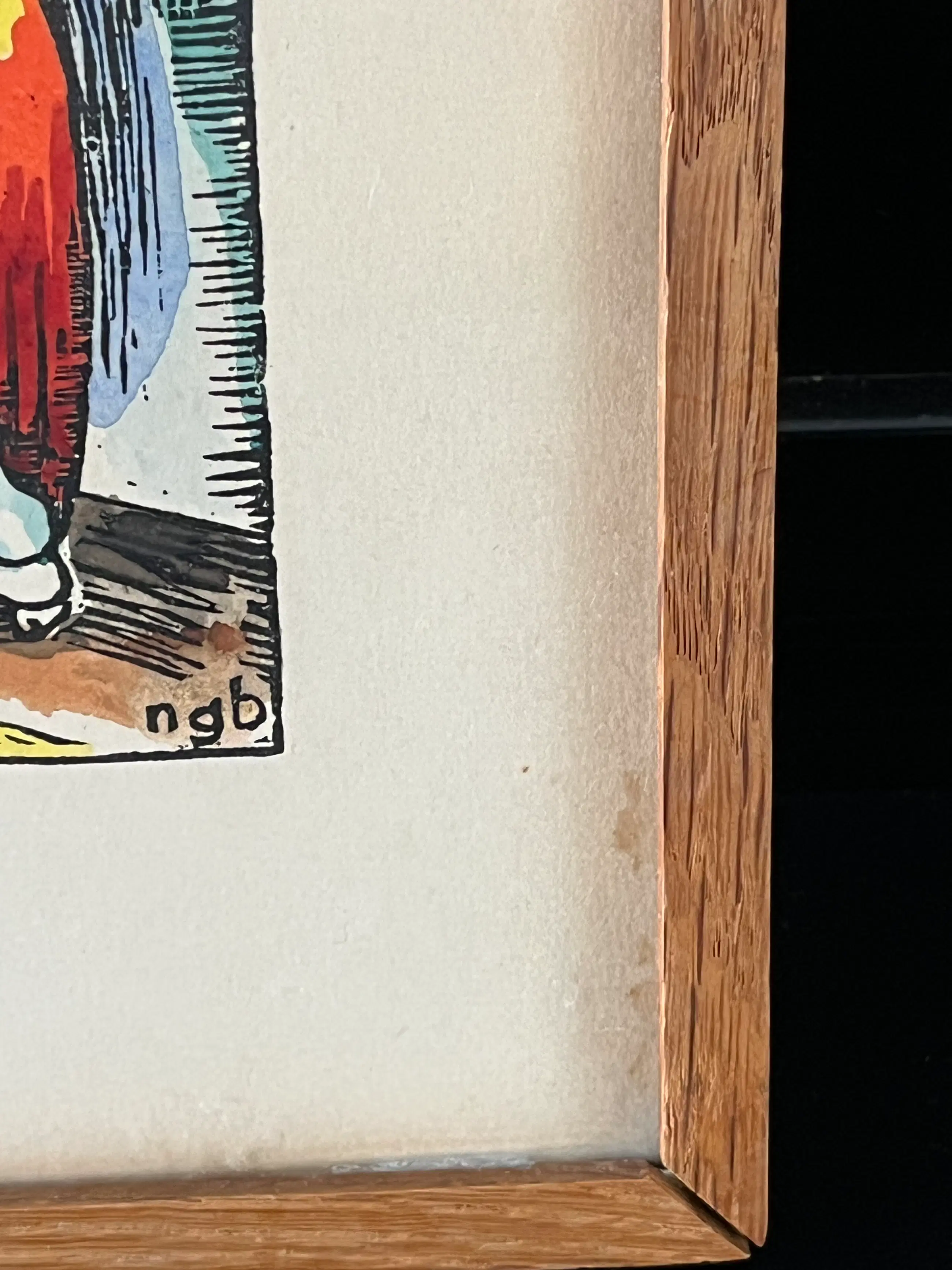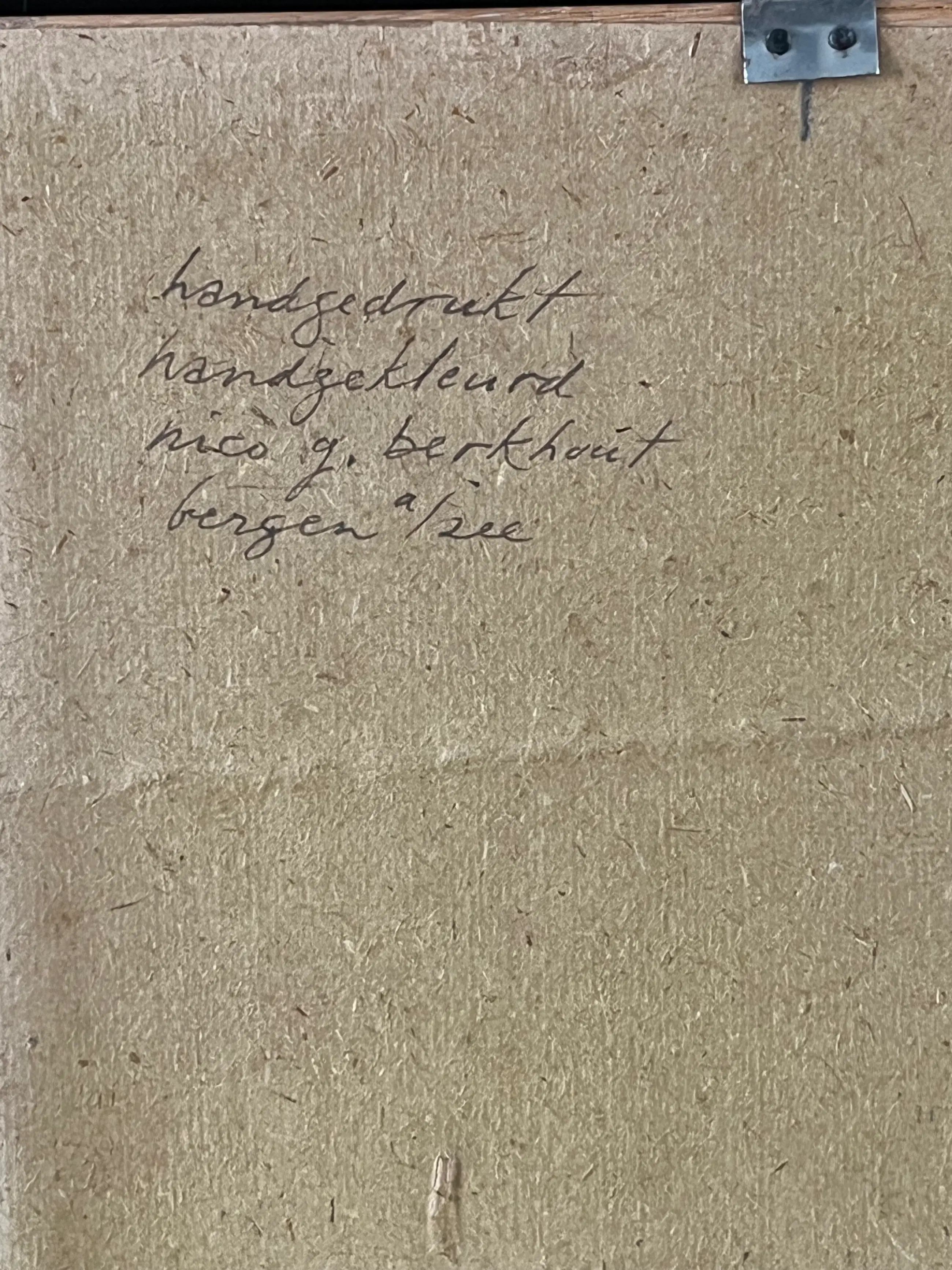 Signatuur: Rechtsonder in de prent gesigneerd met monogram: ngb. Op de achterzijde van het karton volledig gesigneerd en gelokaliseerd: "handgedrukt handgekleurd - nico g. berkhout - bergen a/zee”.