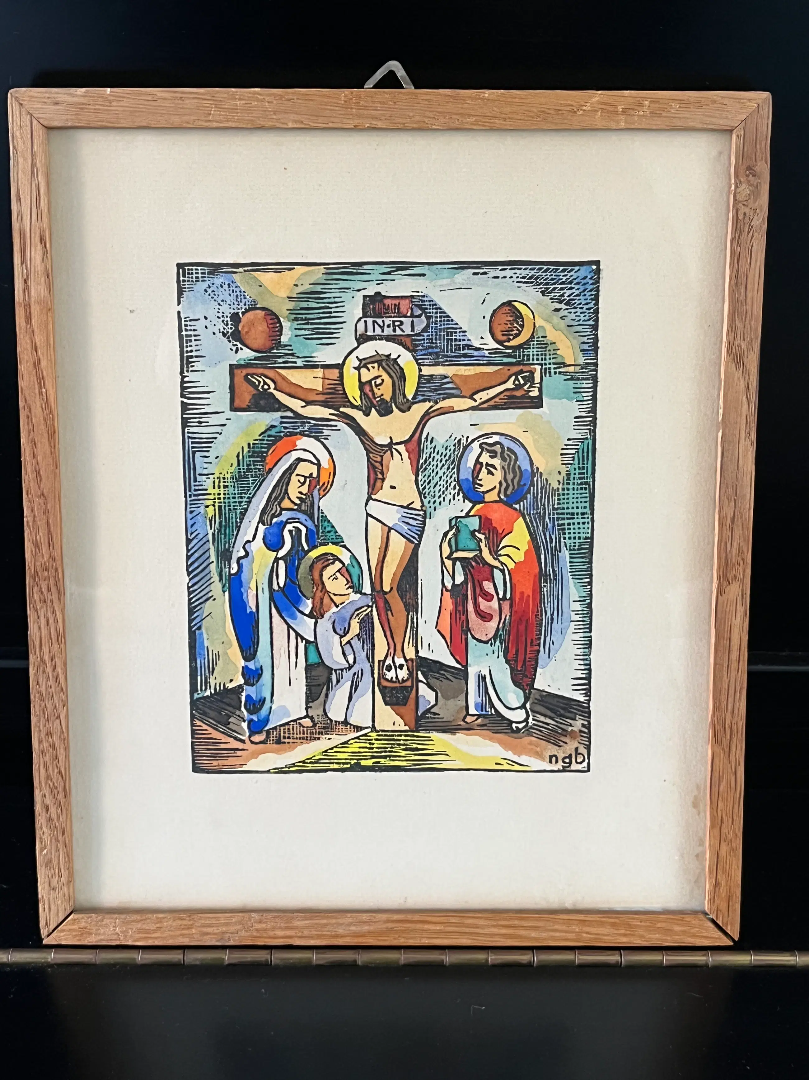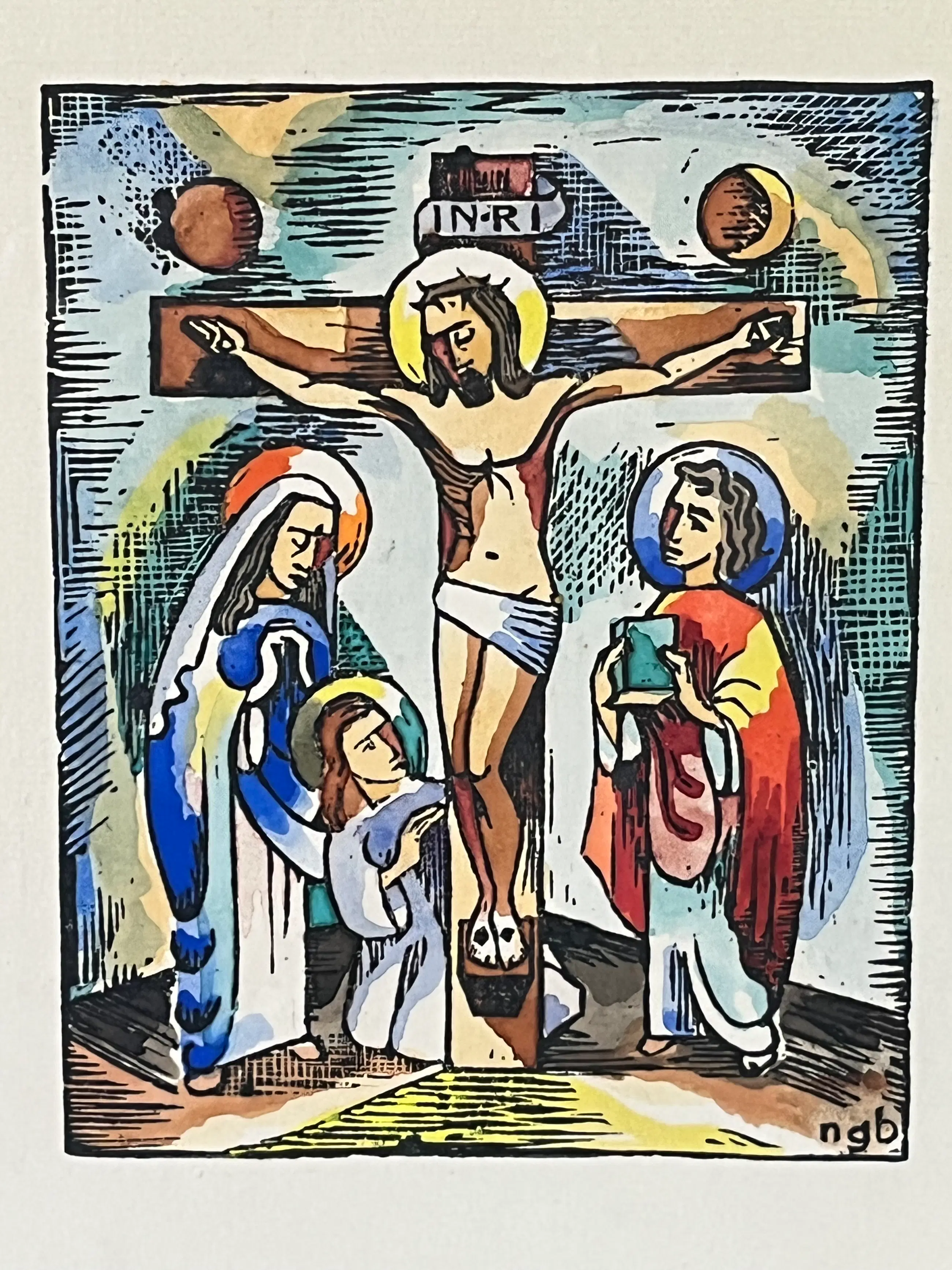 Dit werk toont een modernistische weergave van de Kruisiging en past prachtig in de traditie van de religieuze kunst uit de regio Bergen (N-H).