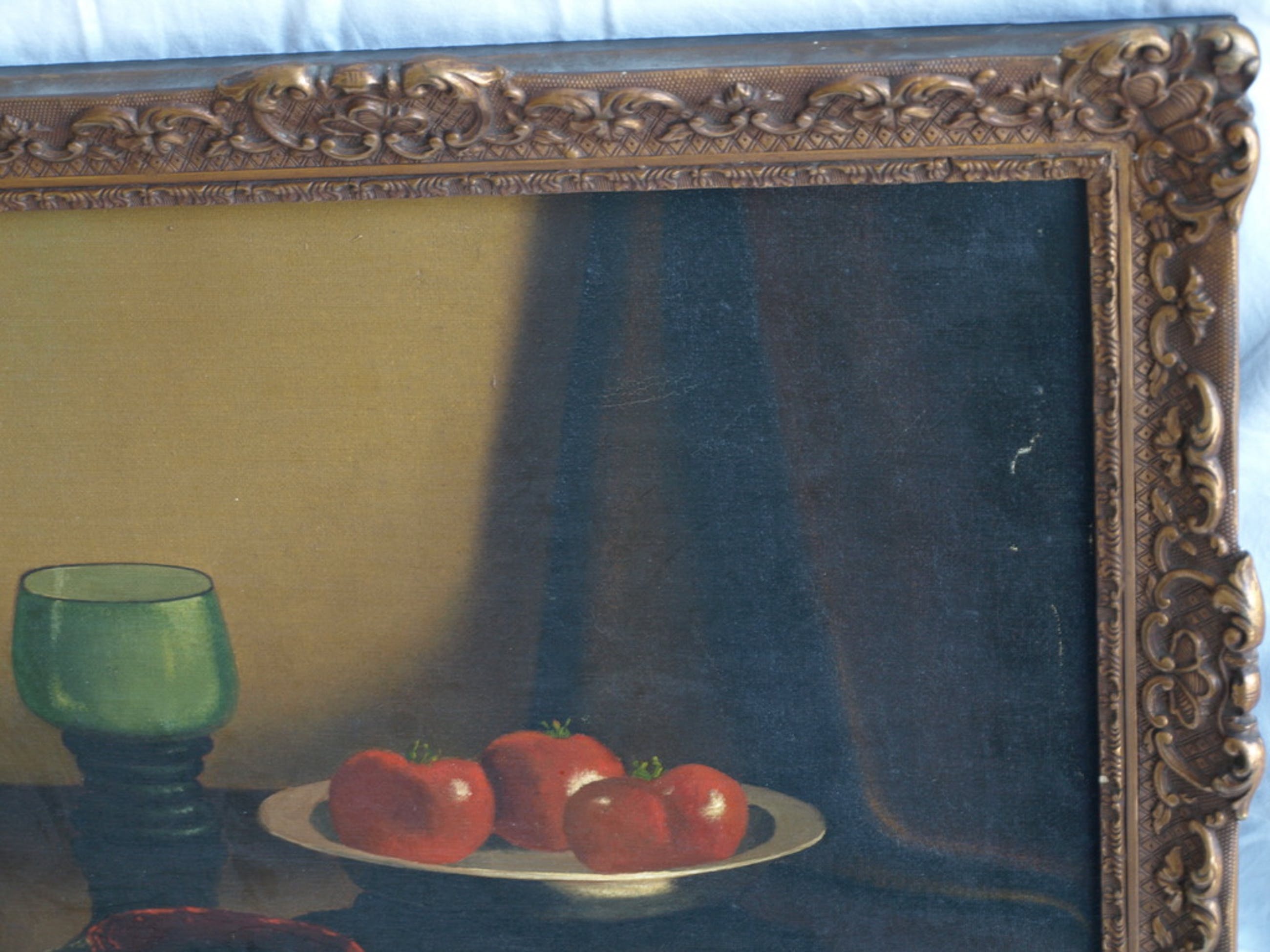 Een olieverfschilderij van de Nederlandse kunstenaar Nico Bruynesteyn met een stilleven met een groen glas, tomaten en een rode peper naast een gedrapeerd gordijn, geschilderd op doek en ingelijst in de originele houten lijst met gipsen sierrand.