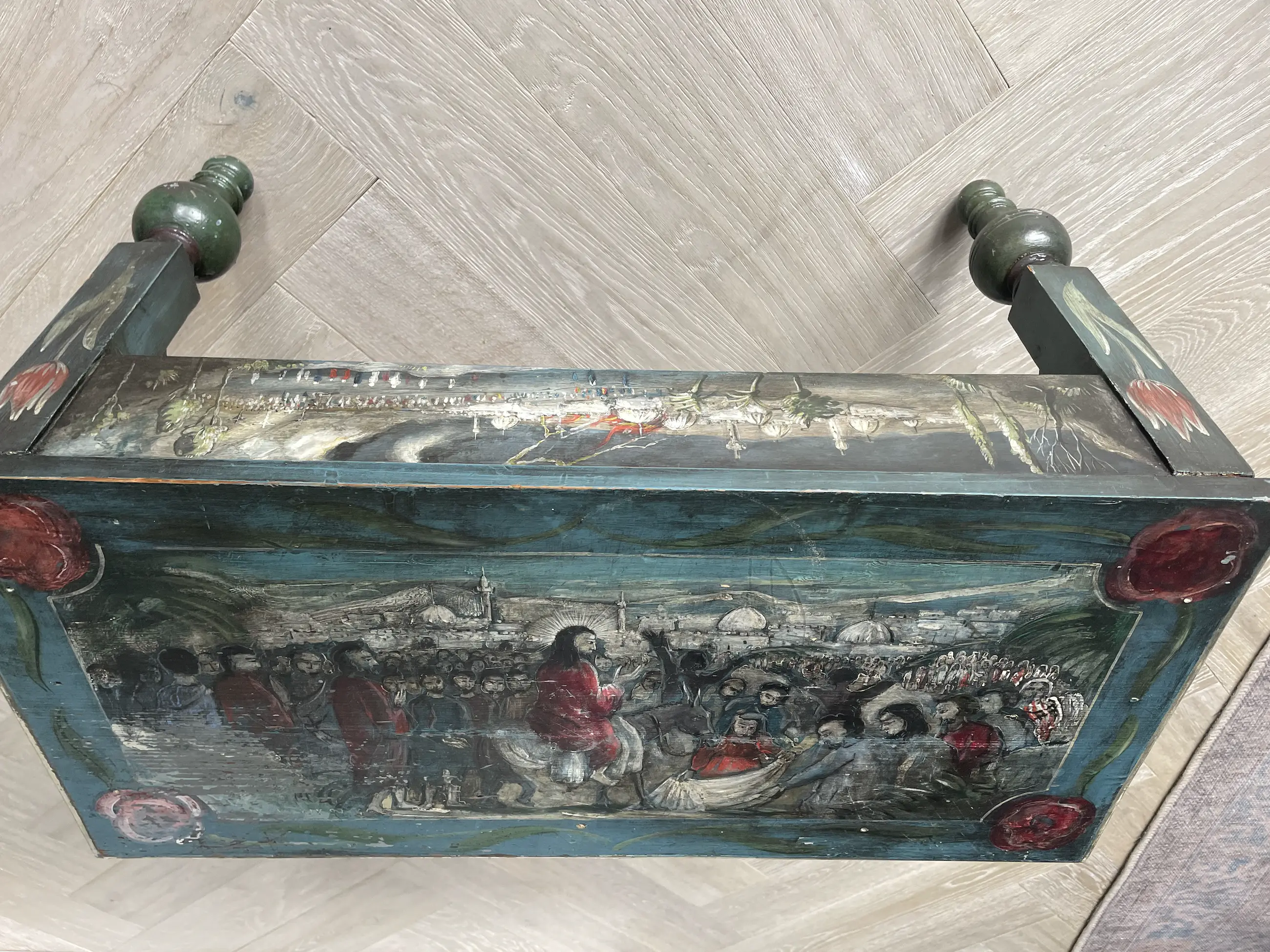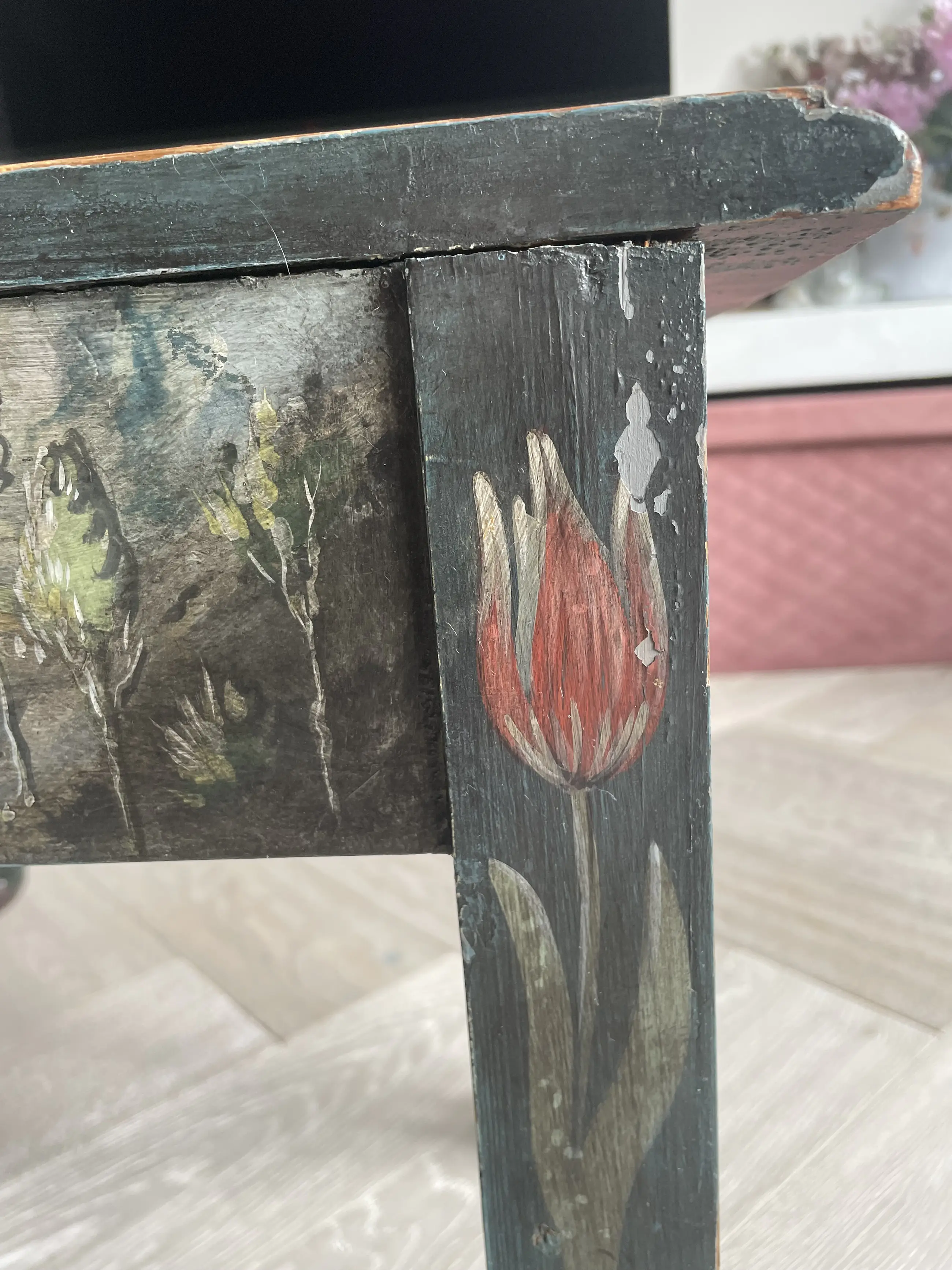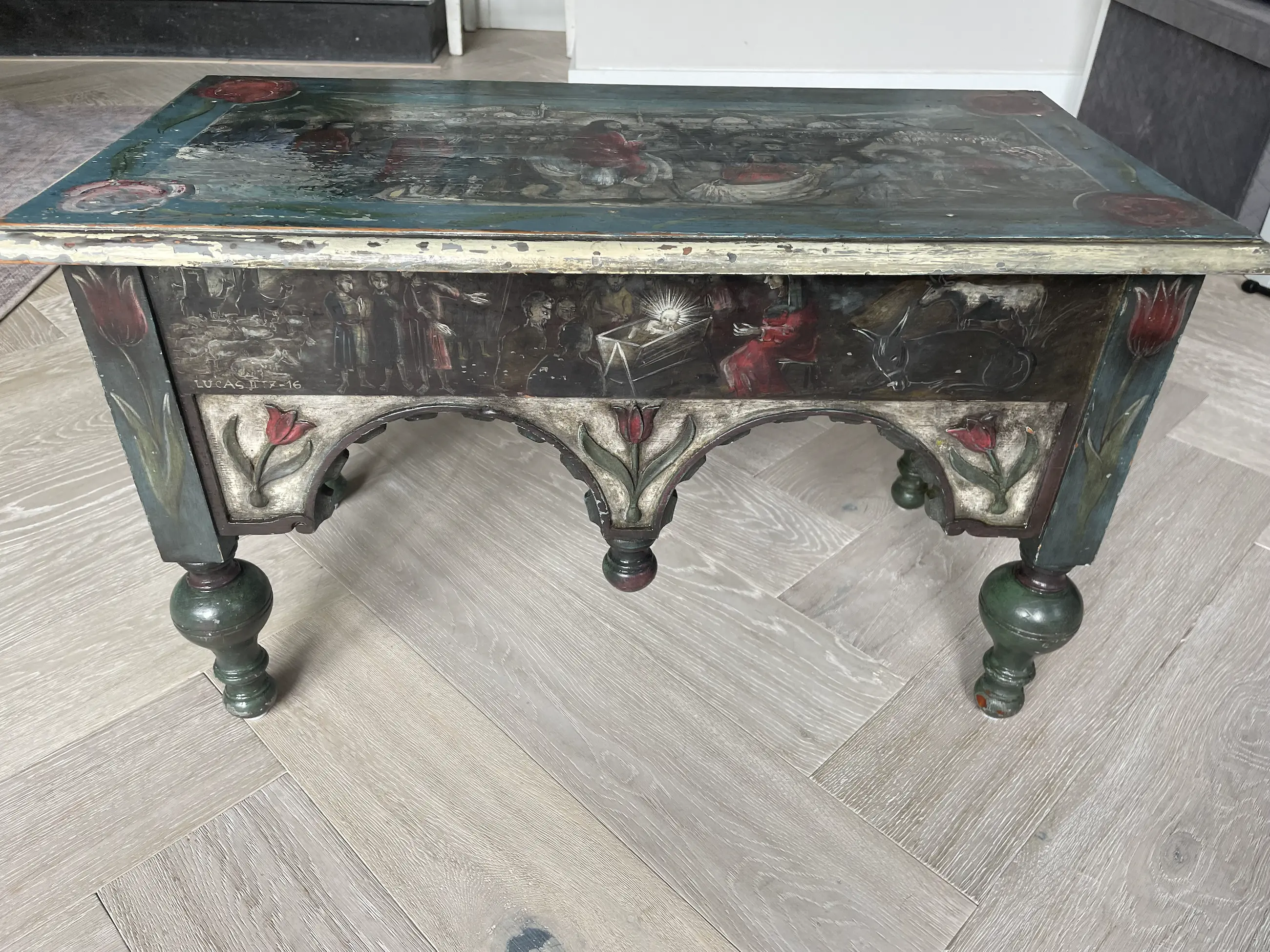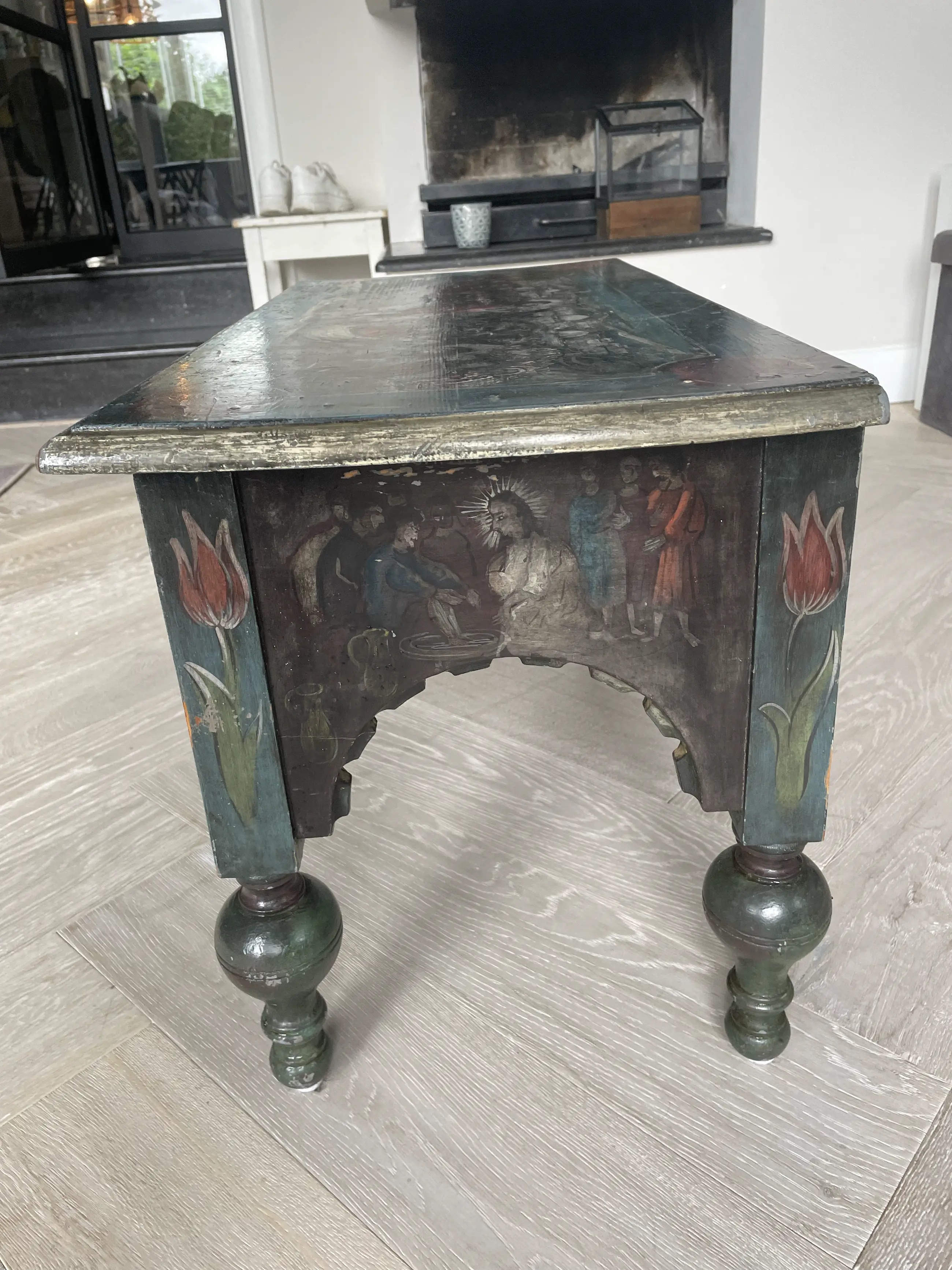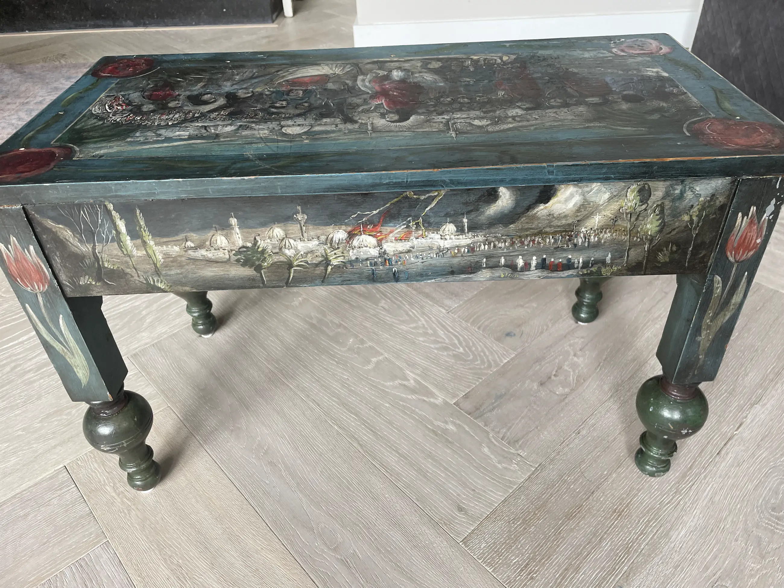 Beschilderd Amelander bankje door Nico Huppes, geboren 21 oktober 1913 te Leeuwarden. Huppes was restaurateur en schilder bij het Rijksmuseum in Amsterdam.