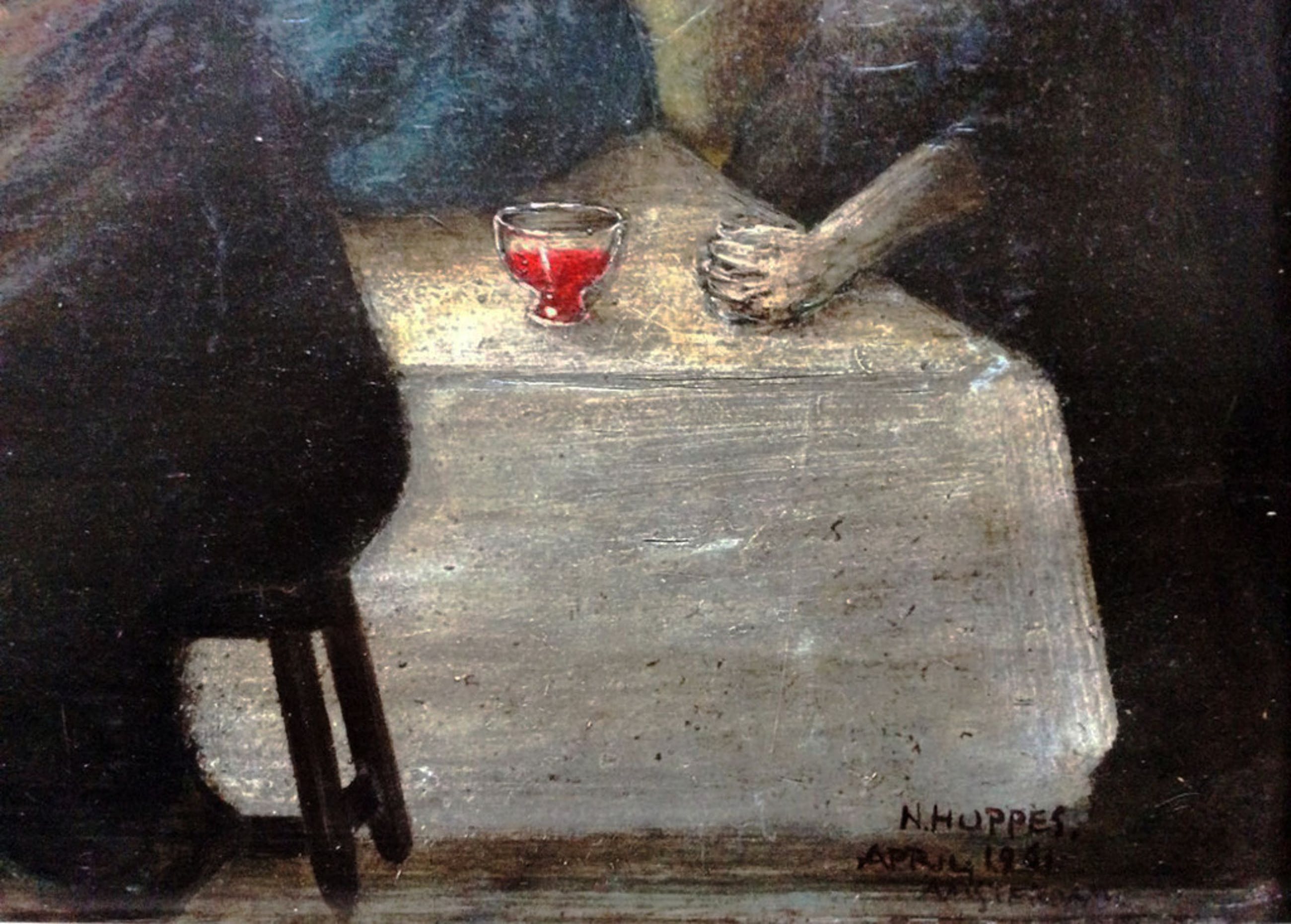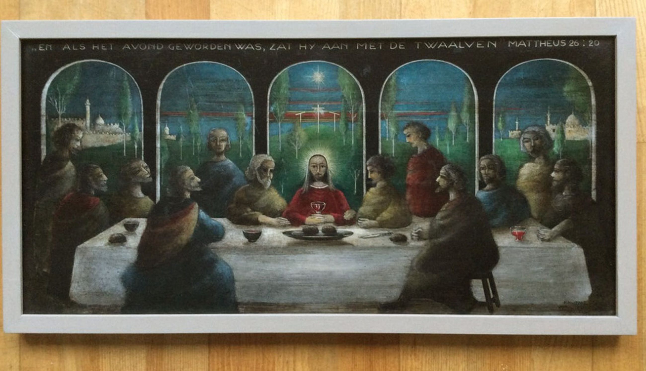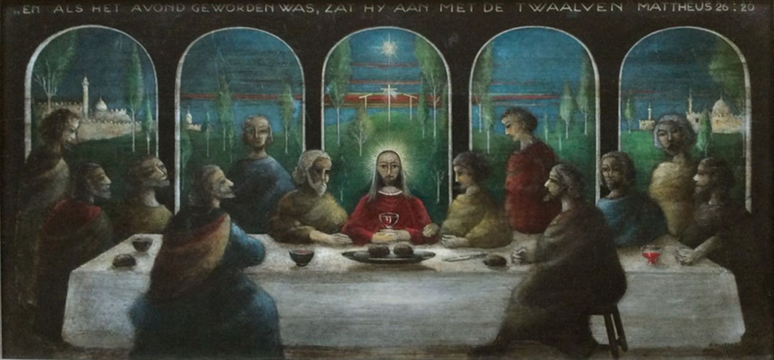Mooi stemmingsvol en kleurrijk schilderij van Nicolaas Huppes: Het Laatste Avondmaal. Olieverf op eiken paneel, hand gesigneerd r.o.: N.Huppes, April 1961, Amsterdam. Bovenin met bijbelvers vermelding: "En als het avond geworden was, zat Hij aan met de twaalven"Mattheus 26:20. Formaat incl. houten lijst 60 x 31 cm. Achterop van vermelding voorzien: 'Laatste Avondmaal' door N.Huppes, geb. 21 oct. 1913 te Leeuwarden. Thans restaurateur v/d Kunstnijverheid a/h Rijksmuseum te Amsterdam (geannoteerd en gesigneerd door de kunstenaar). Lichte gebruikssporen op een verder goed bewaard gebleven kunstwerk.