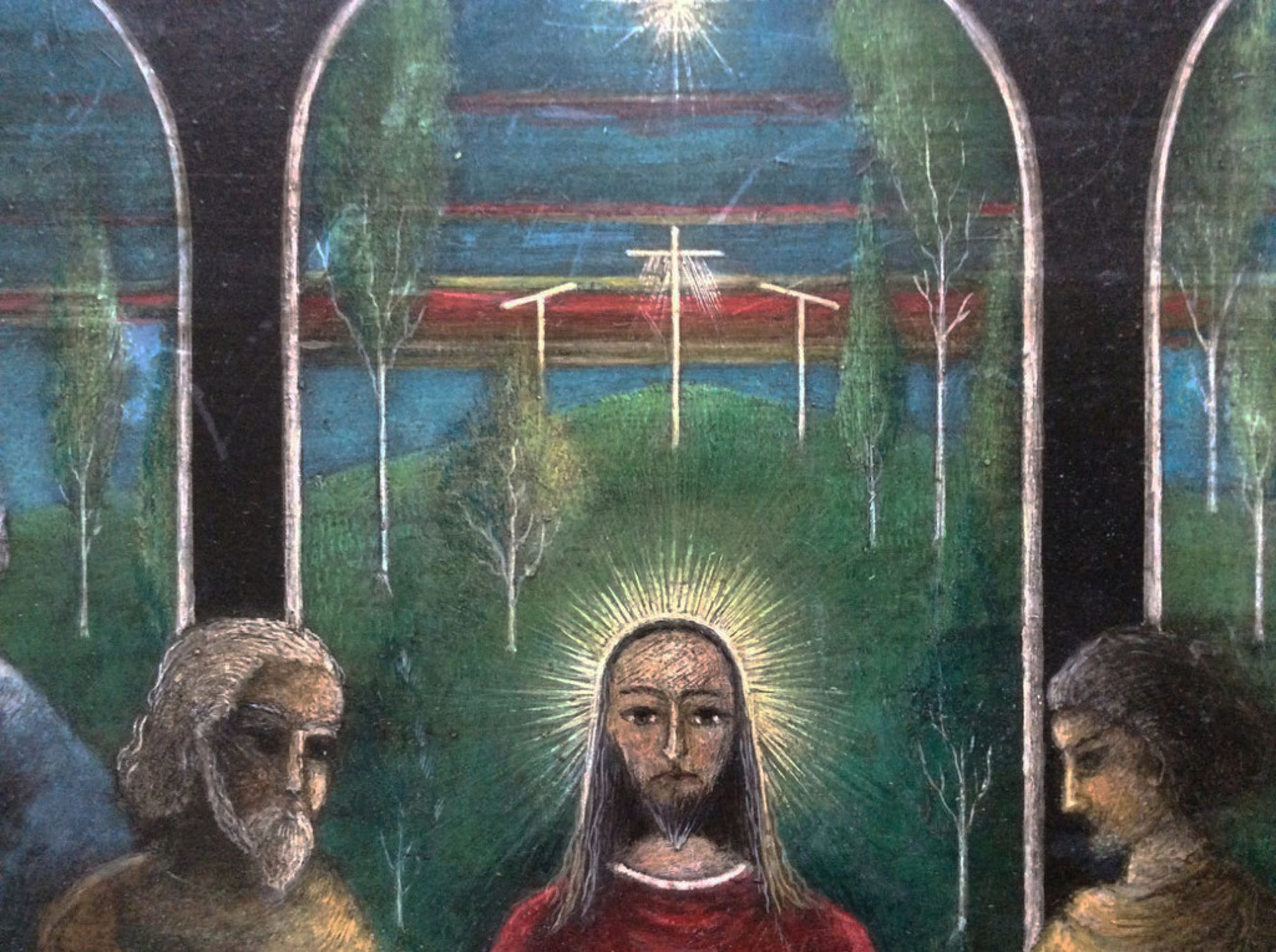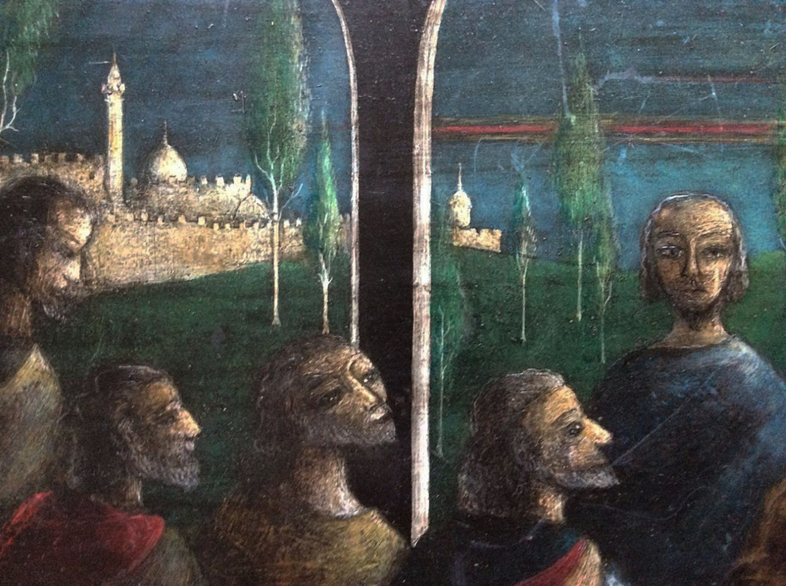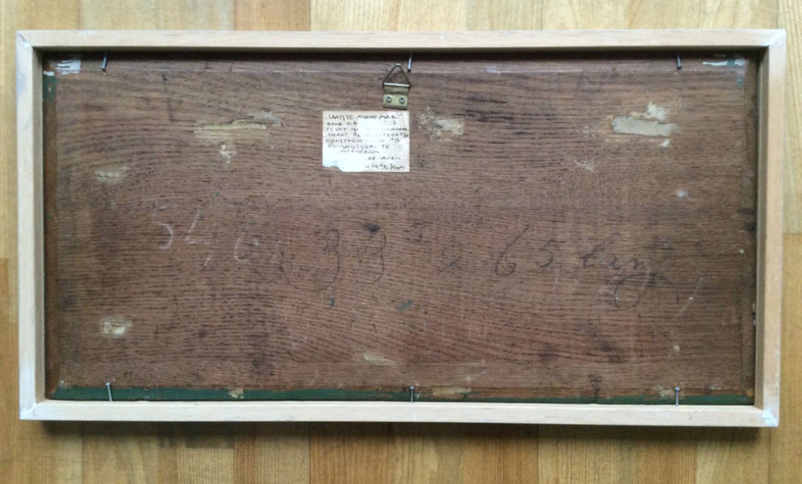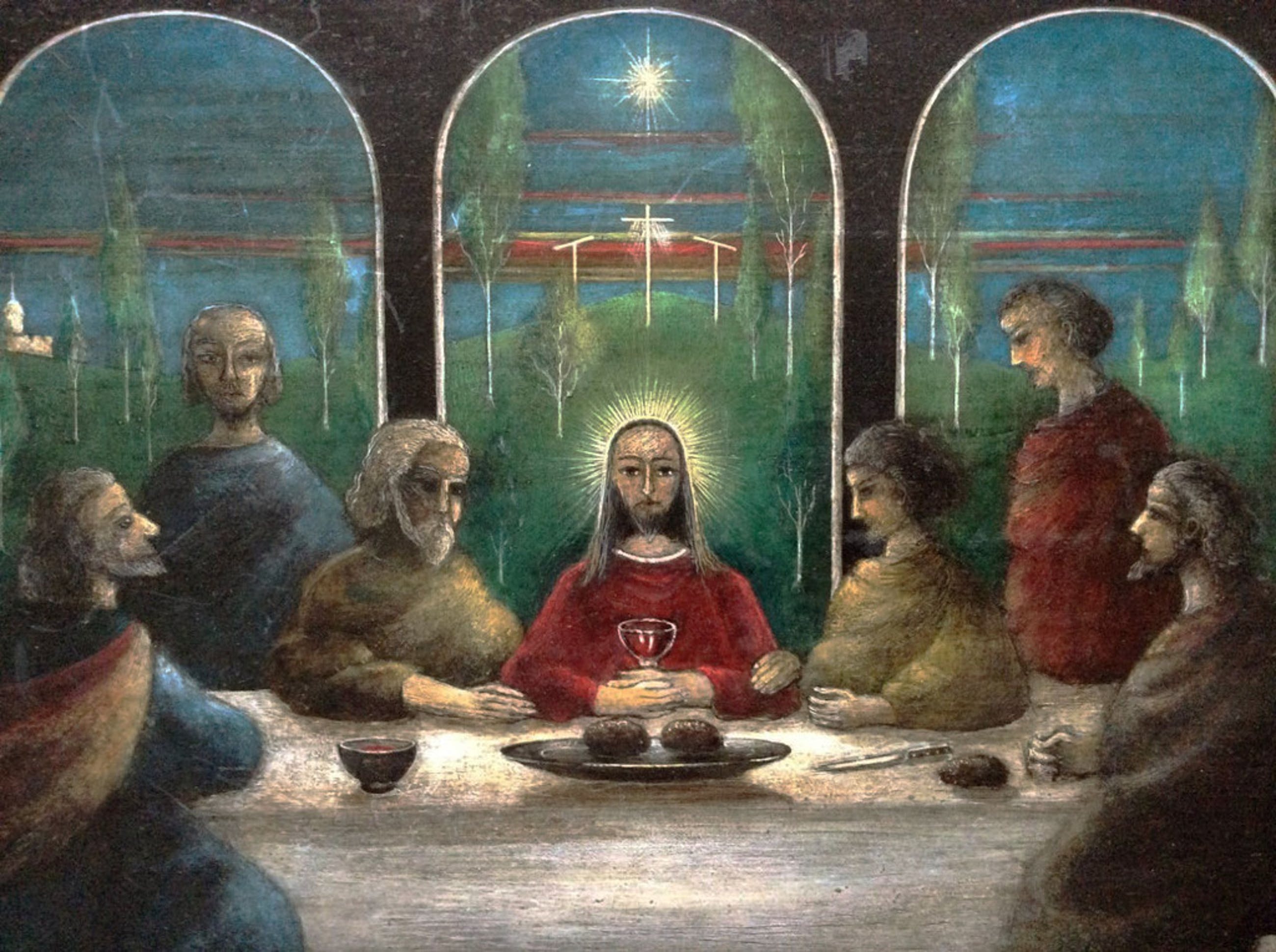 Mooi stemmingsvol en kleurrijk schilderij van Nicolaas Huppes: Het Laatste Avondmaal. Olieverf op eiken paneel, hand gesigneerd r.o.: N.Huppes, April 1961, Amsterdam. Bovenin met bijbelvers vermelding: "En als het avond geworden was, zat Hij aan met de twaalven"Mattheus 26:20. Formaat incl. houten lijst 60 x 31 cm. Achterop van vermelding voorzien: 'Laatste Avondmaal' door N.Huppes, geb. 21 oct. 1913 te Leeuwarden. Thans restaurateur v/d Kunstnijverheid a/h Rijksmuseum te Amsterdam (geannoteerd en gesigneerd door de kunstenaar). Lichte gebruikssporen op een verder goed bewaard gebleven kunstwerk.
