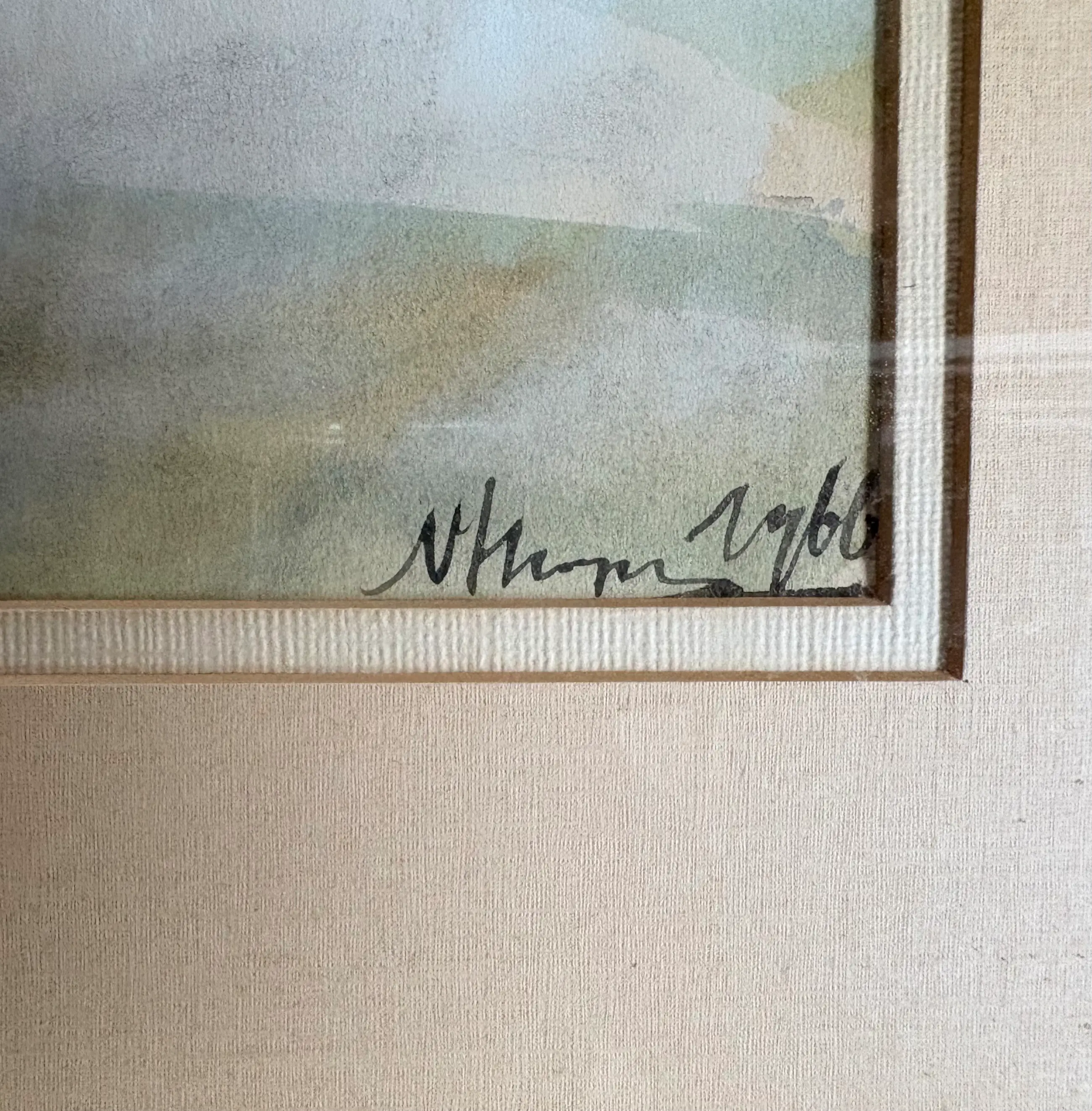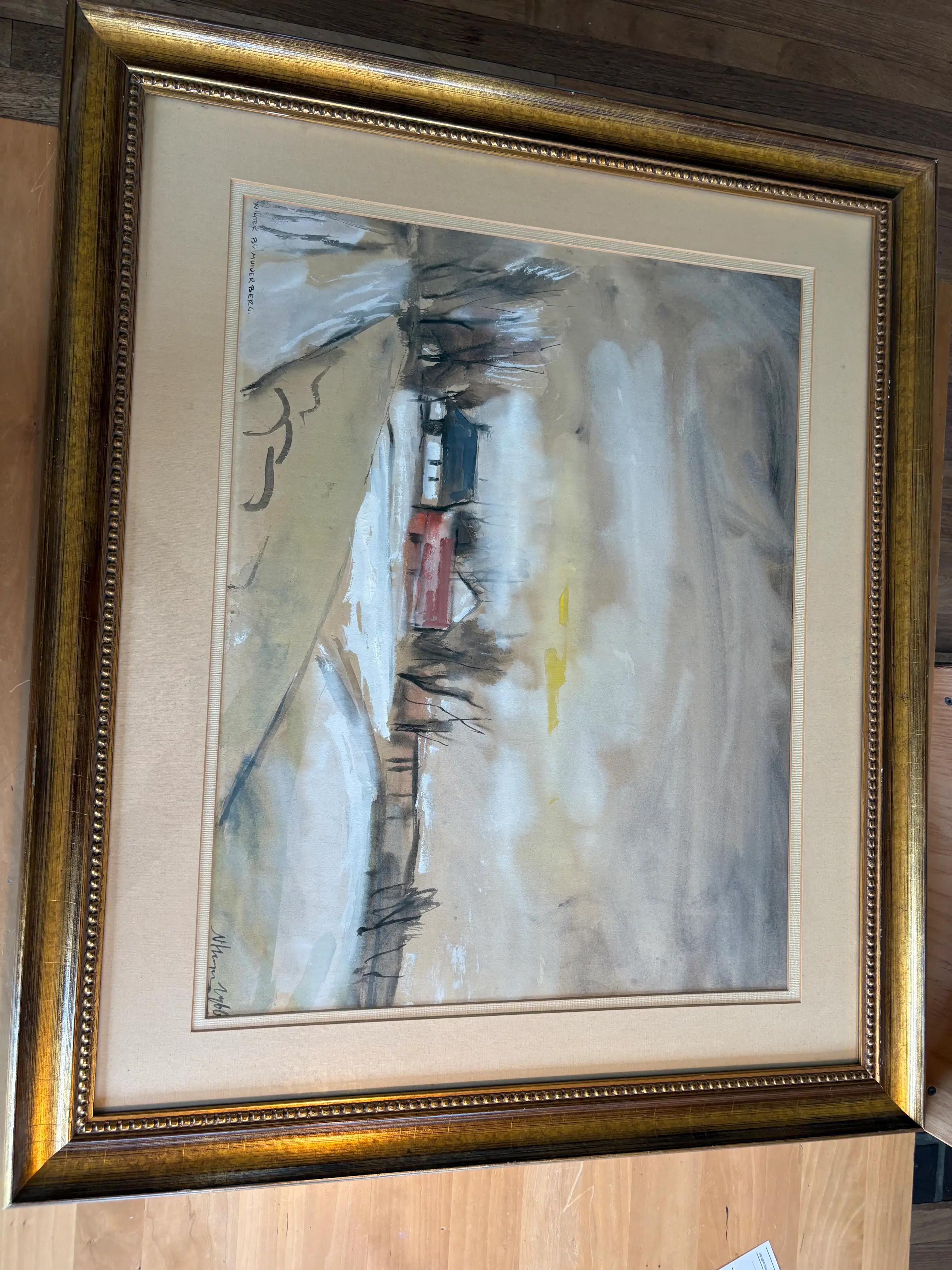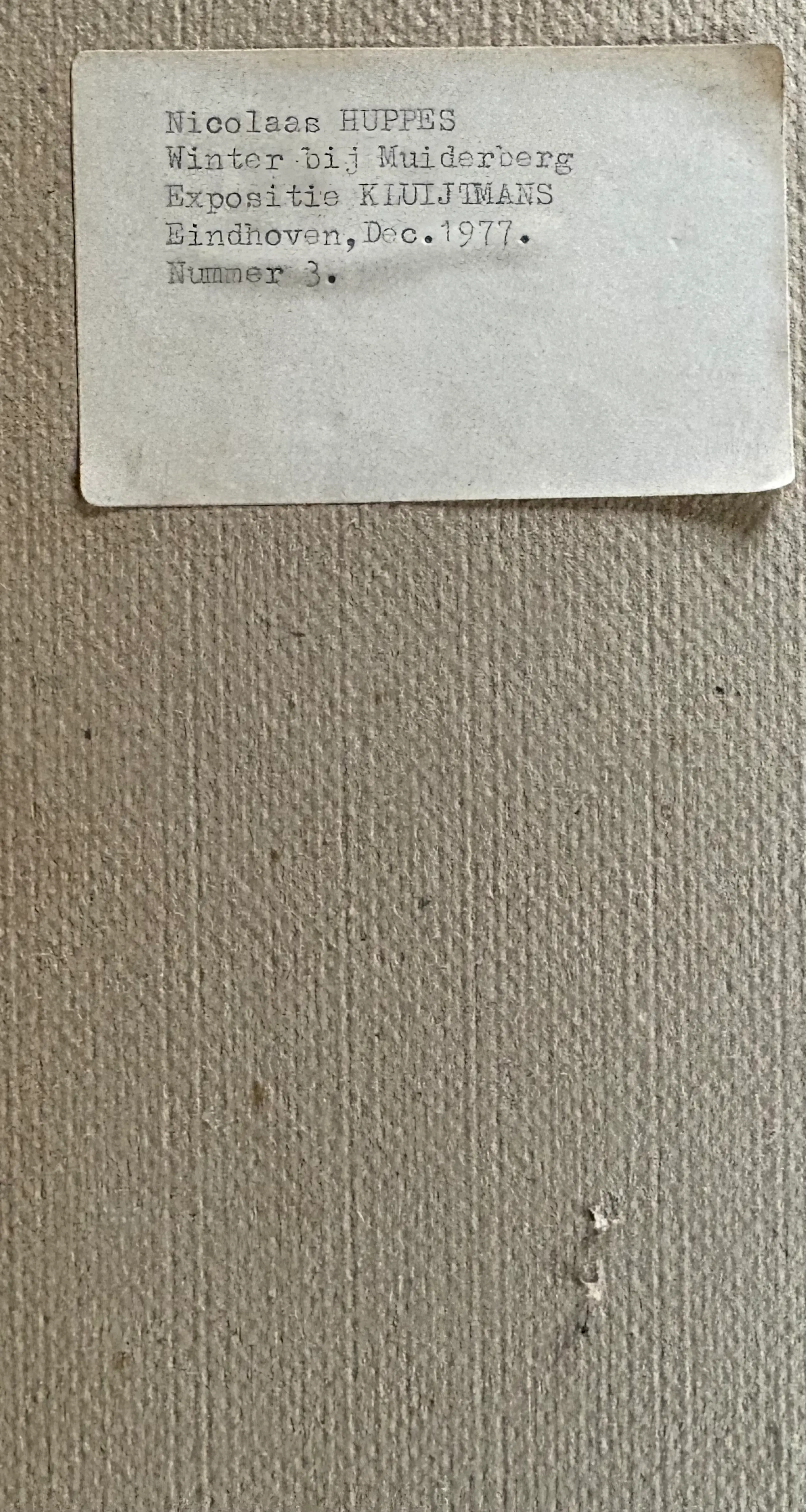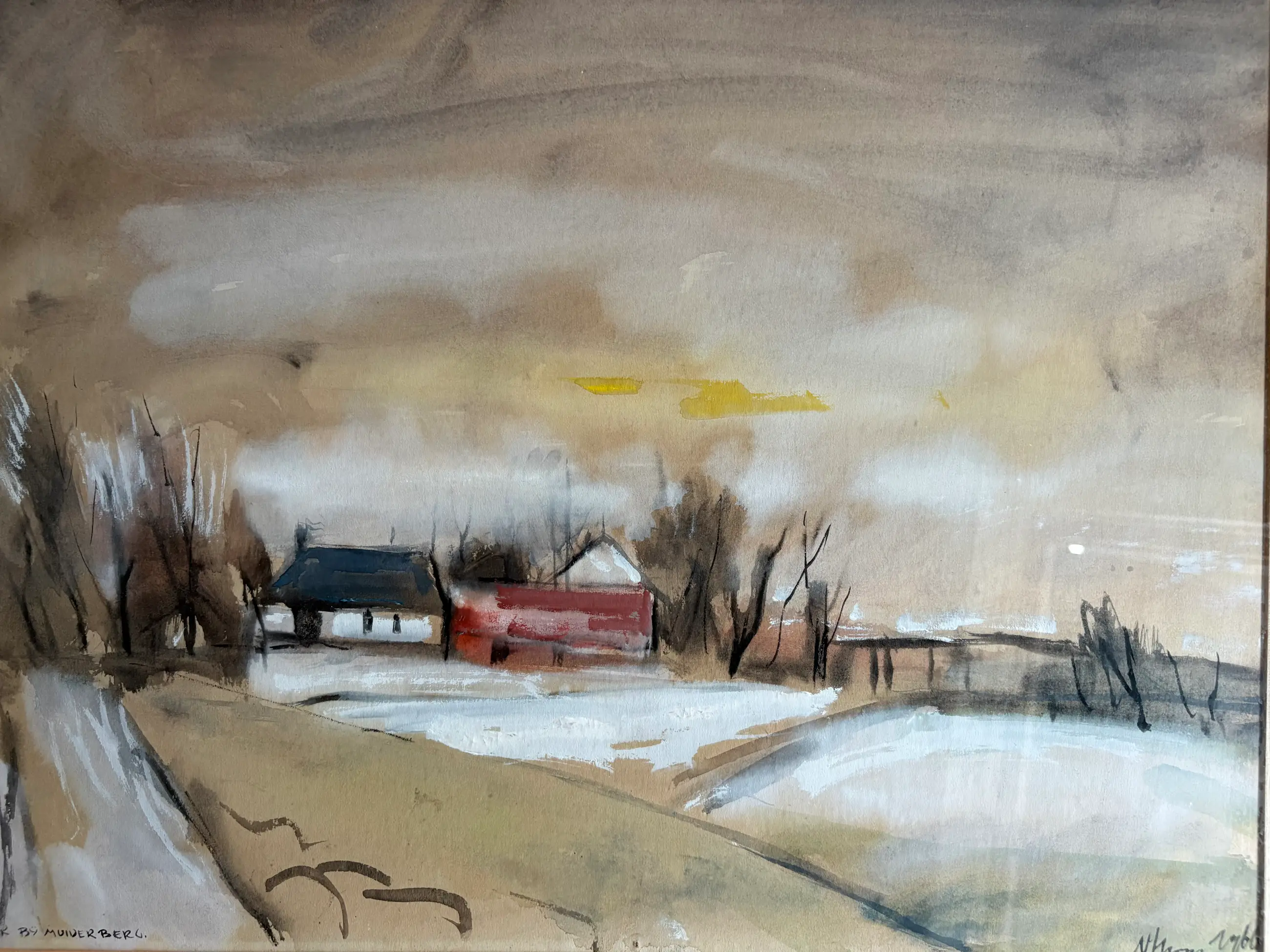 Mooie gouache van Nicolaas Huppes met als titel Winter bij Muiderberg. Het werk zit achter glas, heeft een passe-partout en een goudkleurige lijst. Het werk is rechtsonder gesigneerd.