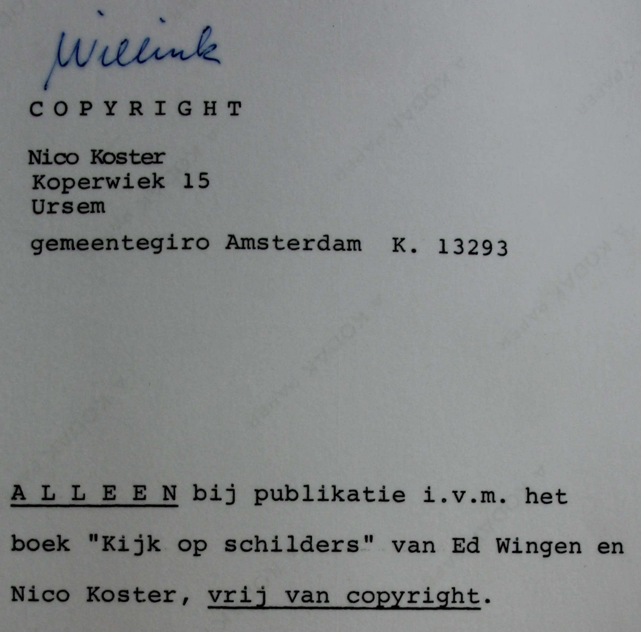 Foto van Nico Koster. Voorstelling van Willink. Afmetingen incl passe-partout: H29.5 x b39.5cm. Afmetingen voorstelling: H19.5 x b25cm. Het werk is achterop voorzien van een atelier stempel. De authenticiteit van het aangeboden werk wordt volledig gegarandeerd. Een certificaat van echtheid kan, op aanvraag, worden gemaild.