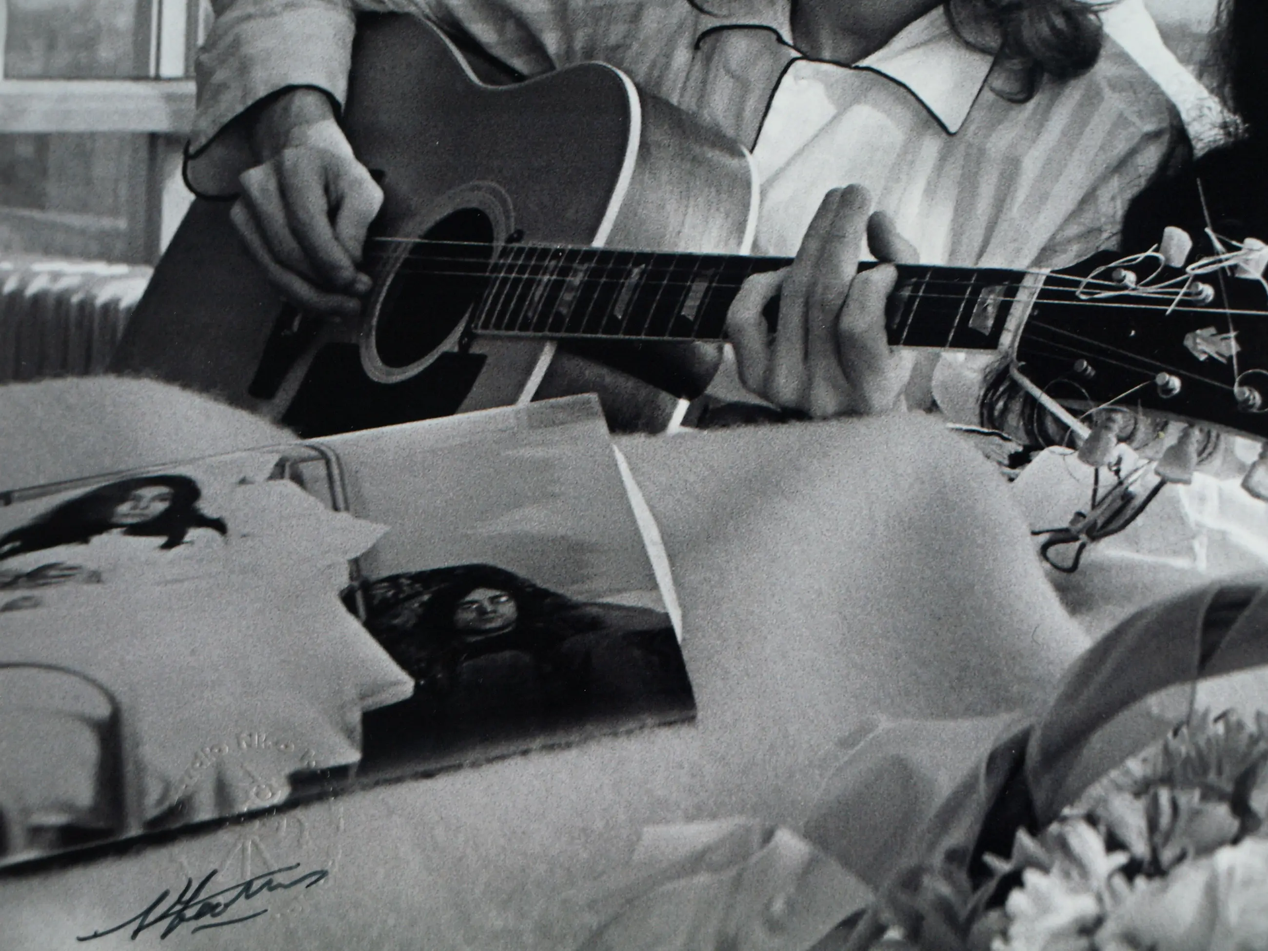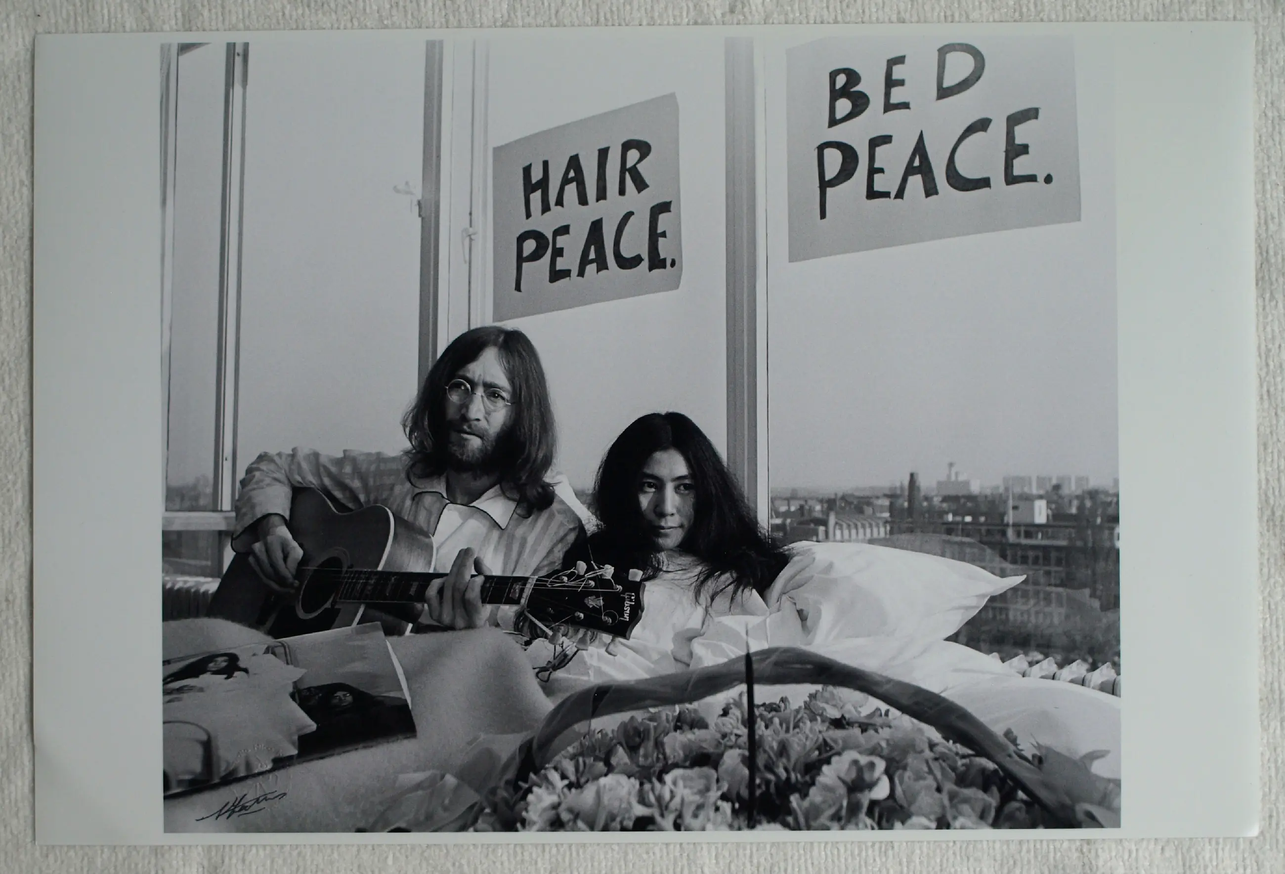 Een zwart-wit foto genomen door de fotograaf Nico Koster van John Lennon en Yoko Ono tijdens de 'Bed-in for Peace', in 1969 in het Amsterdamse Hilton Hotel. -Door de fotograaf afgedrukt in ca. 2009 en gesigneerd met stift linksonder. -Voorzien van blindstempel “Studio Nico Koster Art Projects”. -Afmeting: Blad, 30,5 x 45,5 cm. Beeld/foto, 29,5 x 35,5 cm. -Conditie: In zeer goede staat. Zie ook de foto’s.