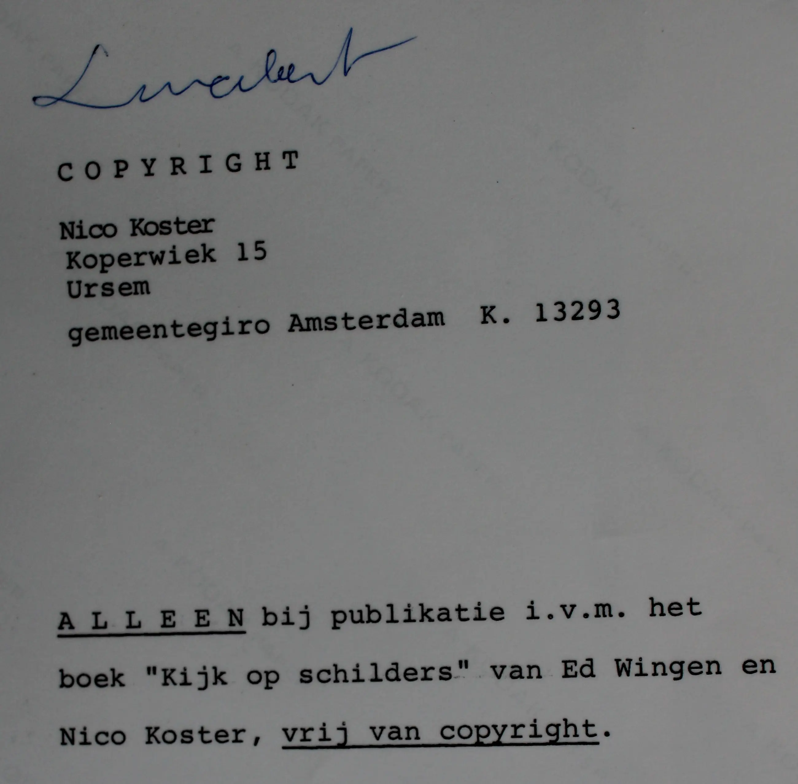 Wettelijk volgrecht: Voor werken met een totale prijs (inclusief veilingkosten) boven de 3000,- euro, is het wettelijk volgrecht van maximaal 4% van toepassing. Het volgrecht dient betaald te worden door de koper. Kiewit Kunst draagt zorg voor de financiële afwikkeling van de volgrechtvergoeding volgens de vastgelegde bepalingen.