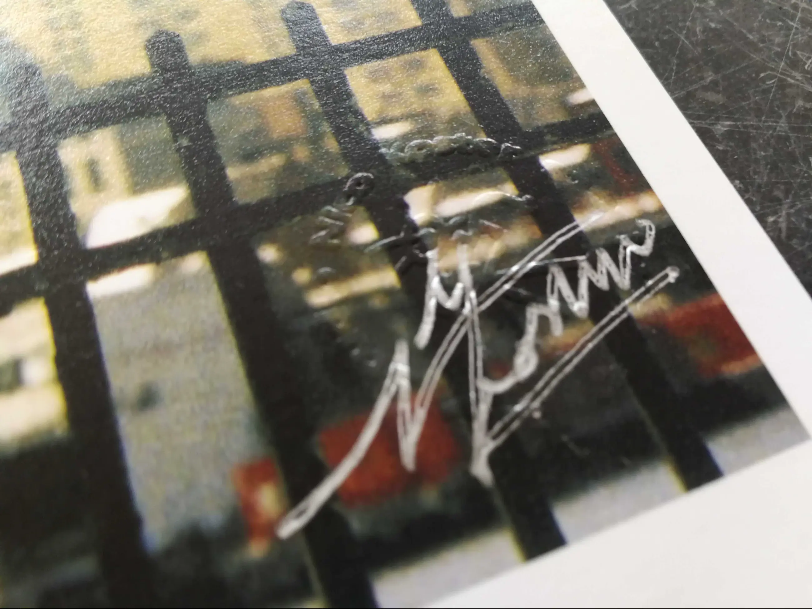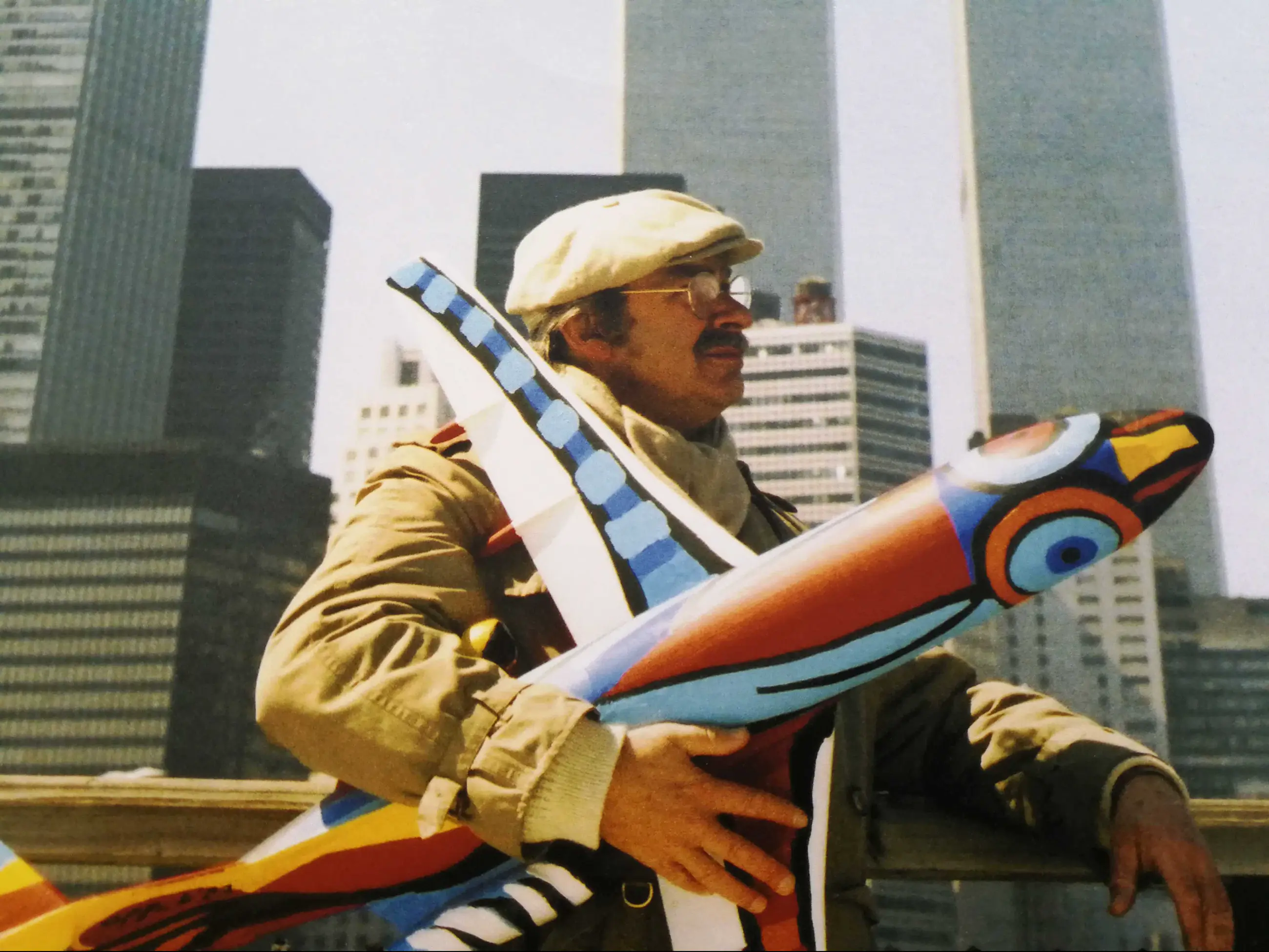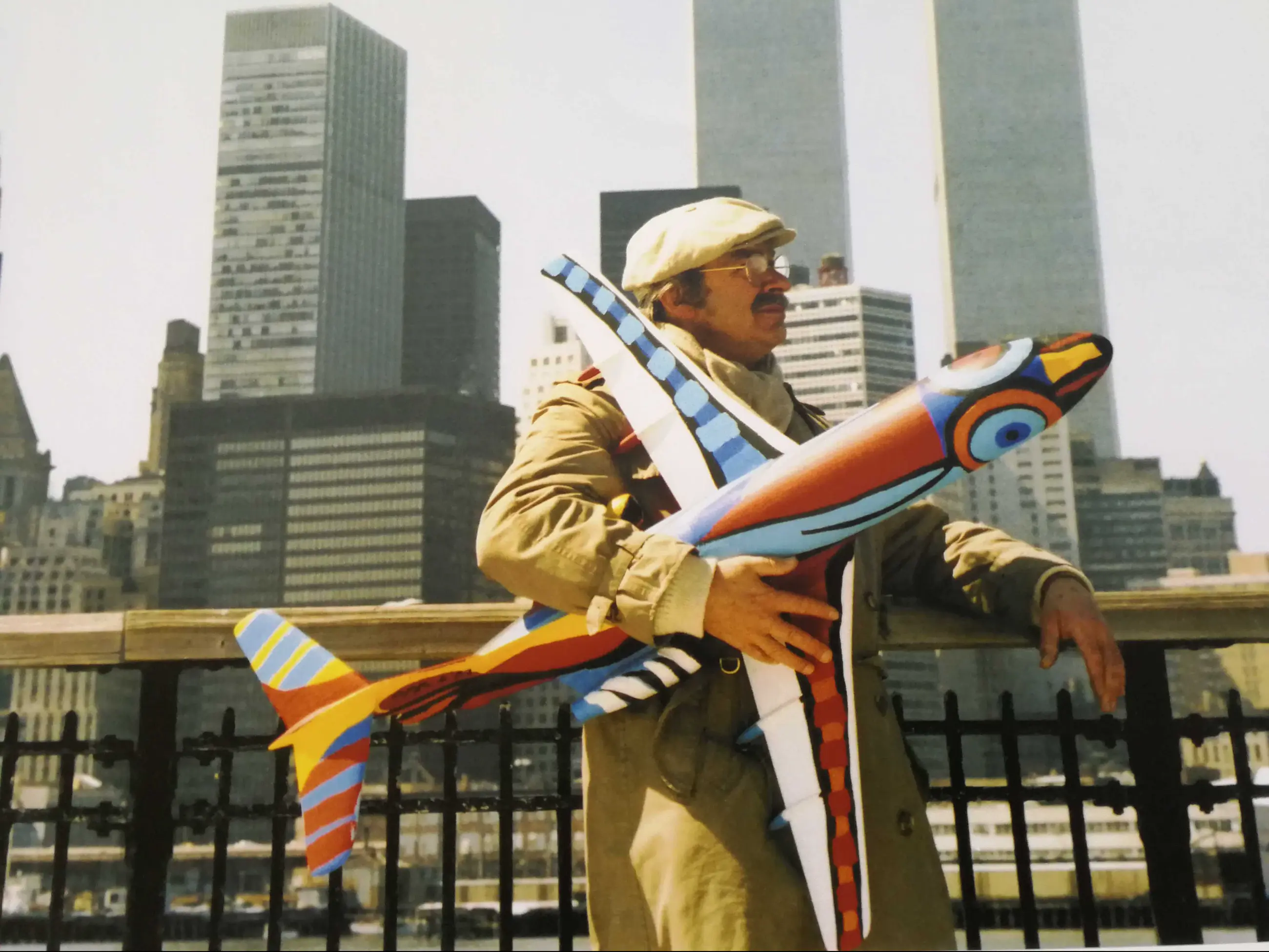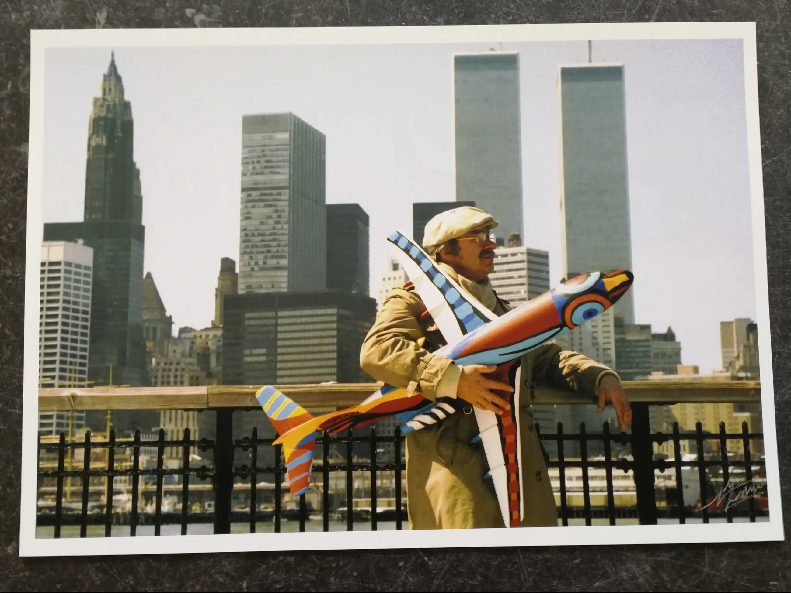 "Ze zijn er alle drie niet meer" aldus de fotograaf. Karel Appel, Twin Towers en Fokker. 1983 Karel Appel beschilderde dit prototype fokker F100 voor de Parijse vliegshow. De foto is gesigneerd en voorzien van preegstempel.