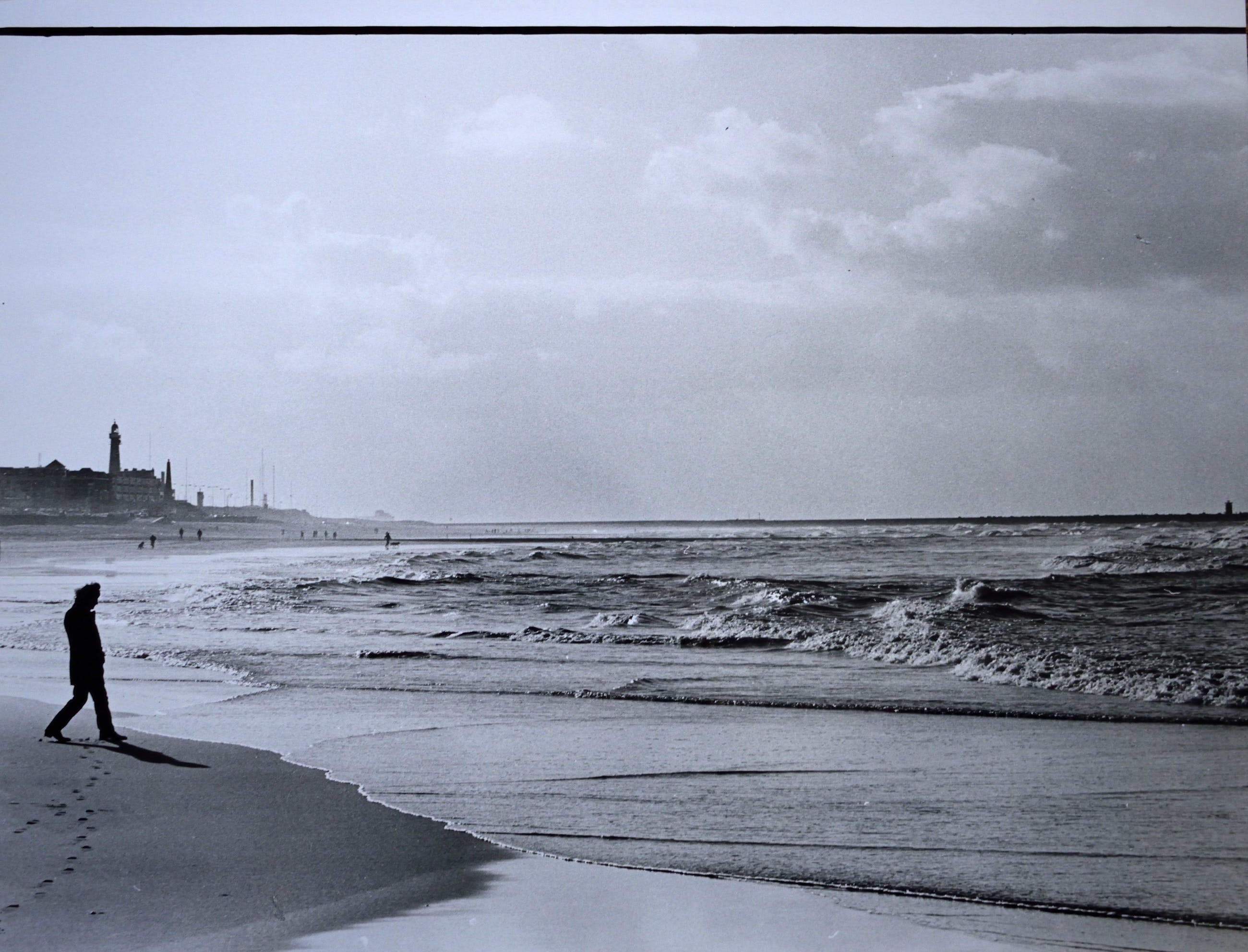Mooie foto van het strand in Scheveningen. (Dat vermoeden heb ik gezien de vuurtoren en de dijk van de oude haven.) Achterop de foto zit een sticker met Copyright Nico Koster. Gezien de foto uit de nalatenschap van Hans Sonnenberg, de galeriehouder van Galerie Delta in Rotterdam, komt vermoed ik dat Jan Cremer op de foto staat. De foto is duidelijk geposeerd, gezien de looprichting van de gefotografeerde persoon en de voetstappen op het strand. Dat is geen natuurlijke loop. Foto is in zwart-wit. Ik heb geen verstand van de techniek. De foto wordt vlak verzonden en zeer goed verpakt.