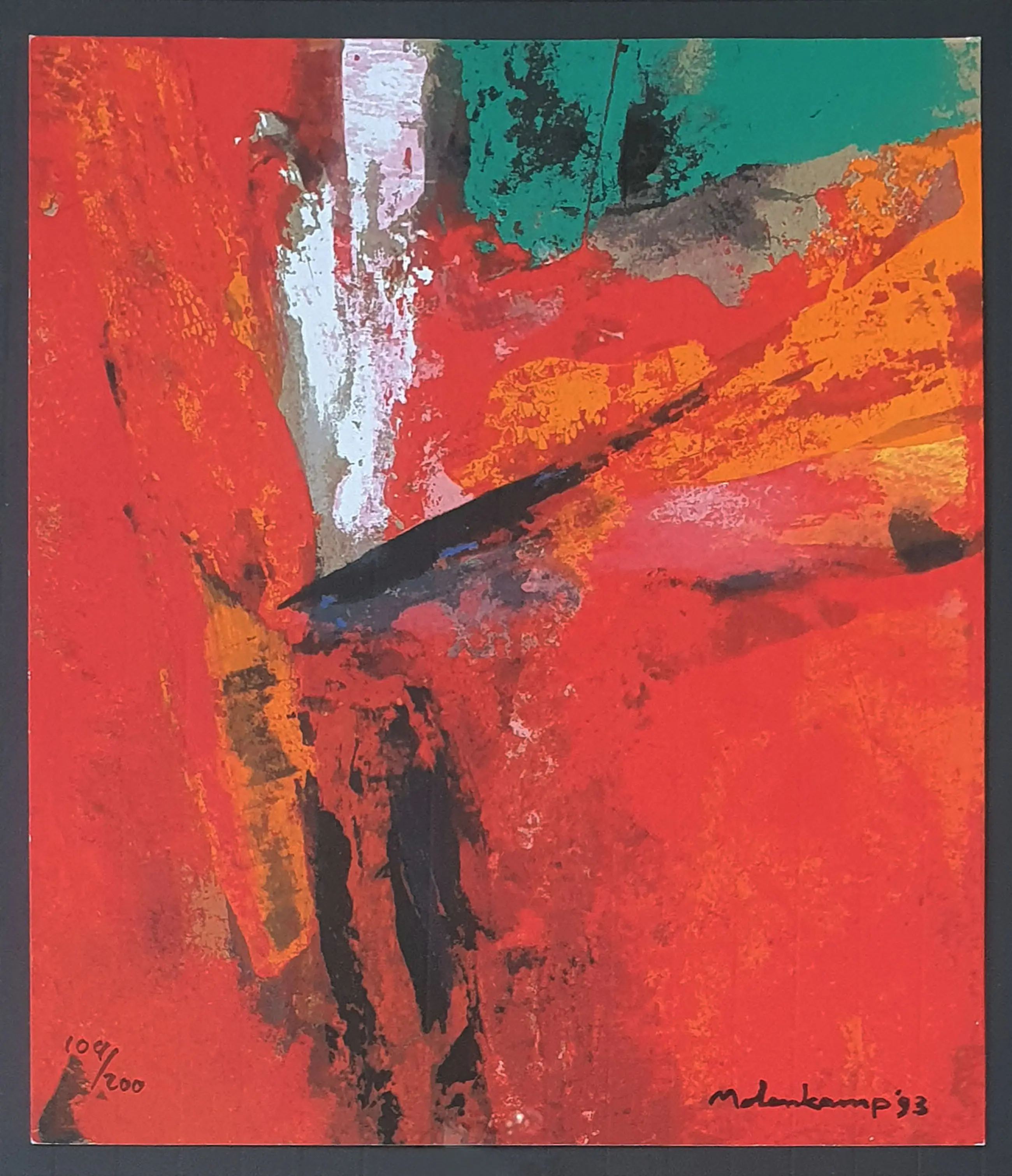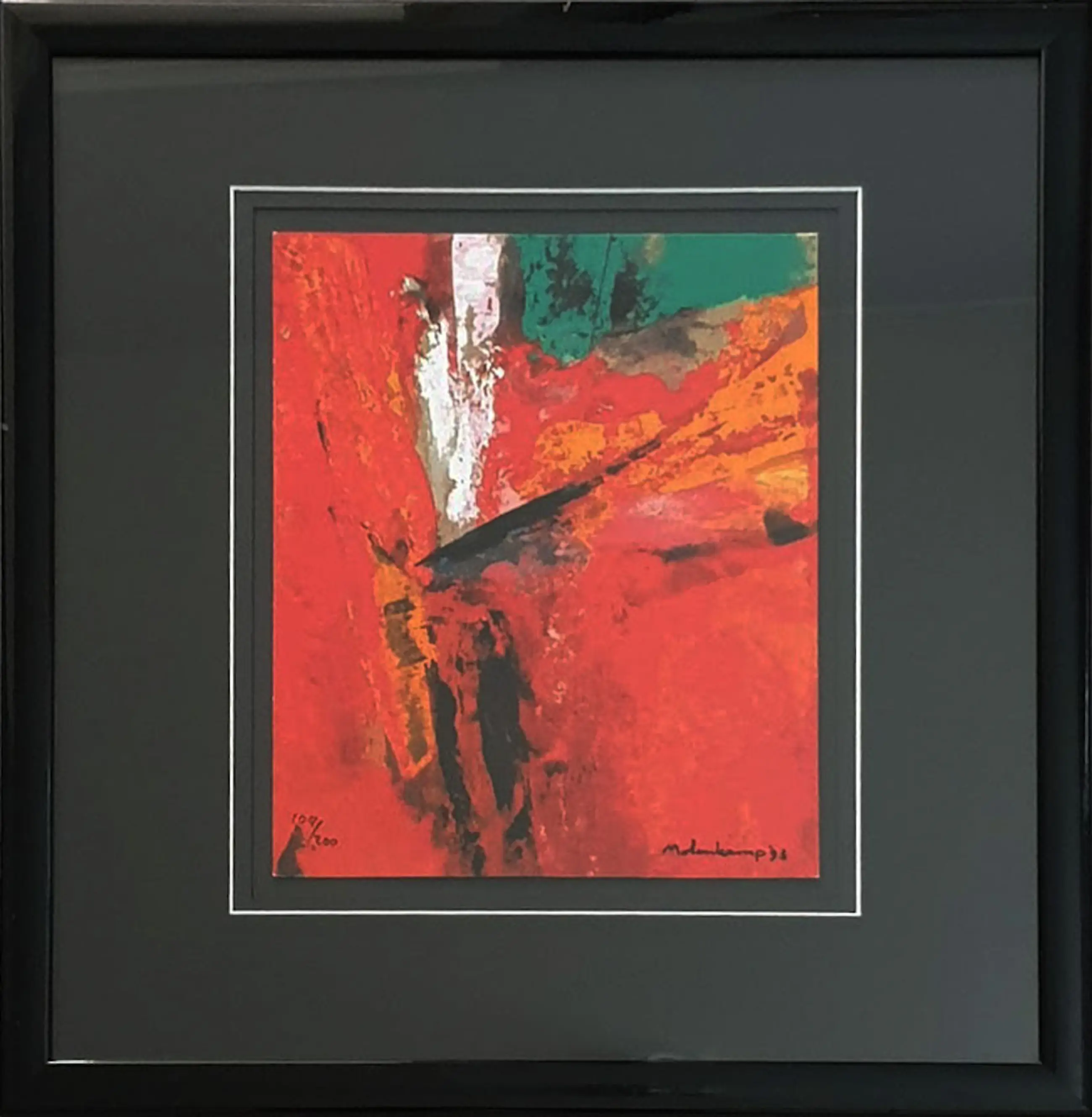 Fraai kleurrijk werk van Nico Molenkamp uit 1993. Het werk is mooi zwevend ingelijst en voorzien van een zwart dubbel passe partout en zwarte lijst. Rechtsonder met de hand gesigneerd door de kunstenaar.