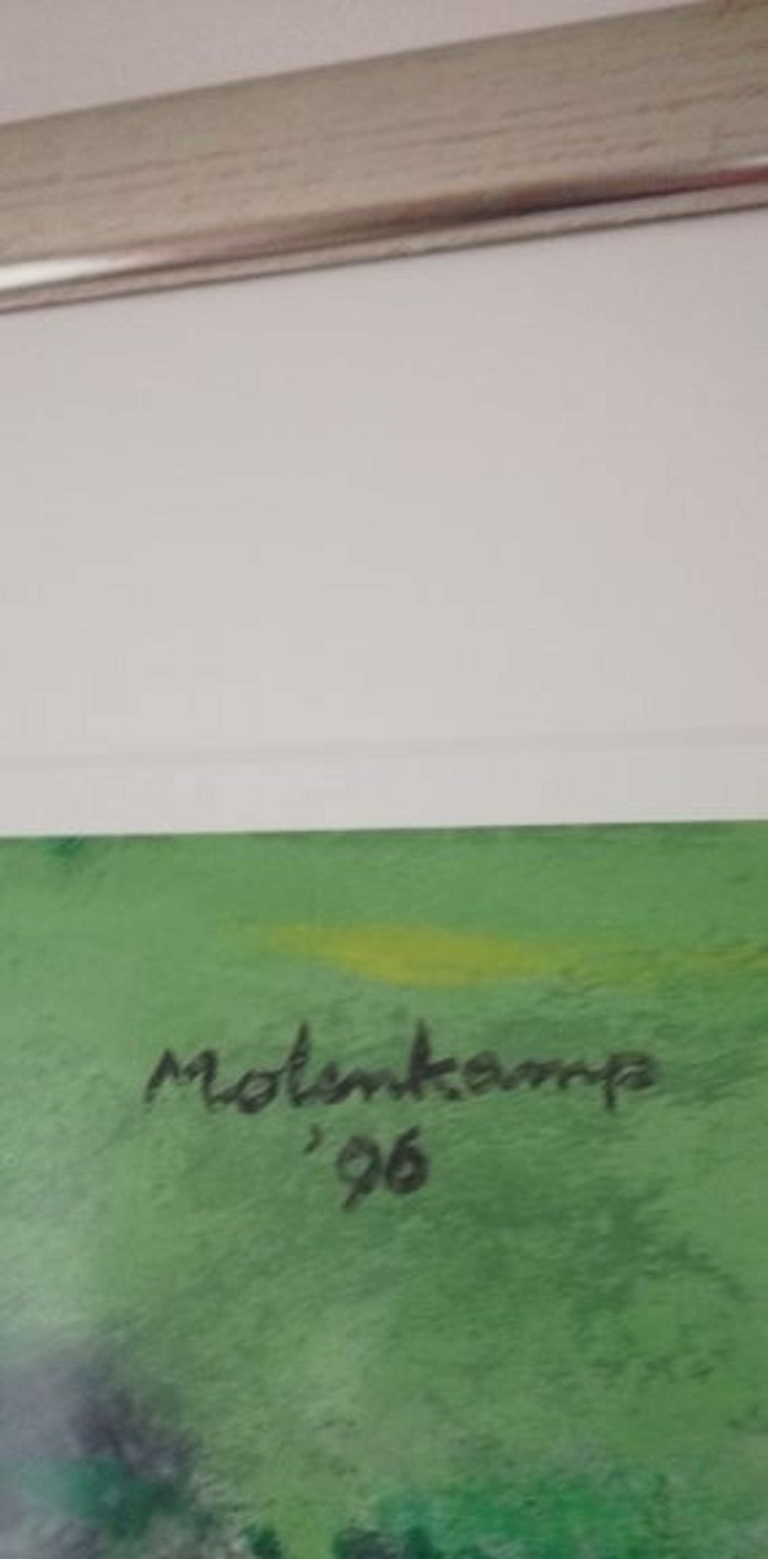 Fascinerende blauw/groene vluchtende vogel (abstract) is prachtig ingelijst in een brede matte zilverkleurige lijst met ontspiegeld glas. Indertijd aangeschaft bij een gerenommeerde galerie in Maastricht.