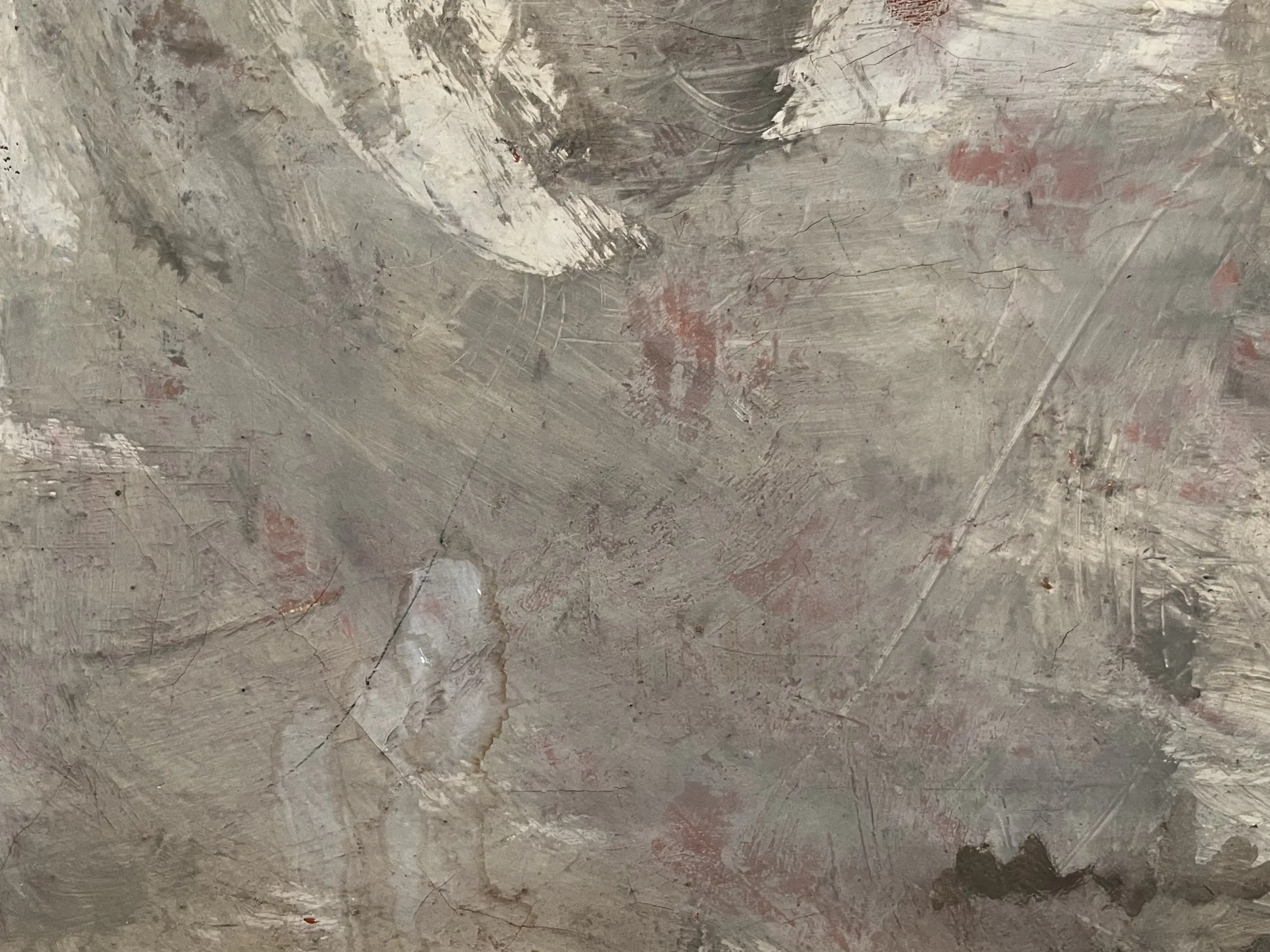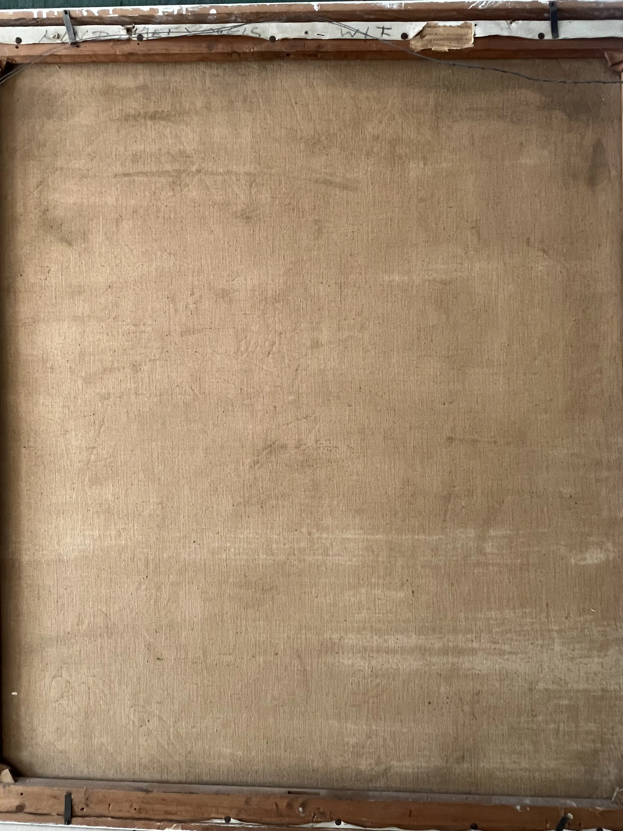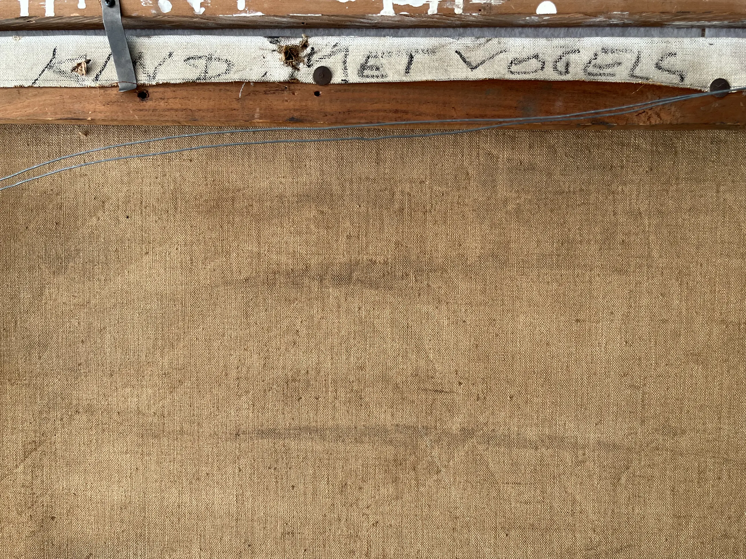 Karakteristiek werk van Nico Molenkamp. Helaas zit in de lichte vlakken craquelé (zie detailfoto’s) en in de rechterhoek zit een “vochtplekje”. (Aan de achterkant is niets van enige vroegere vochtschade te bemerken. Het schilderij inclusief lijst meet 124 x 109,5 cm.