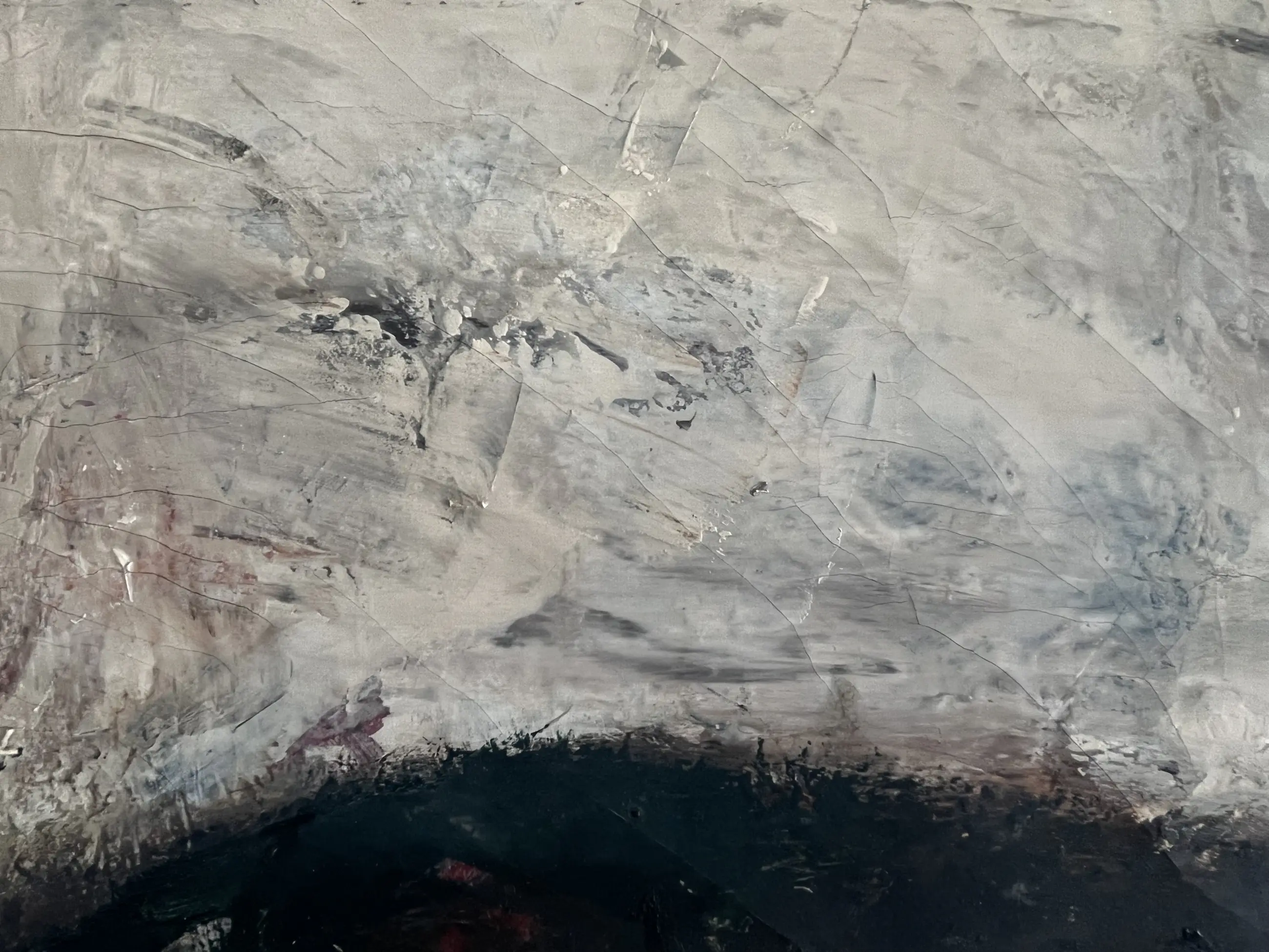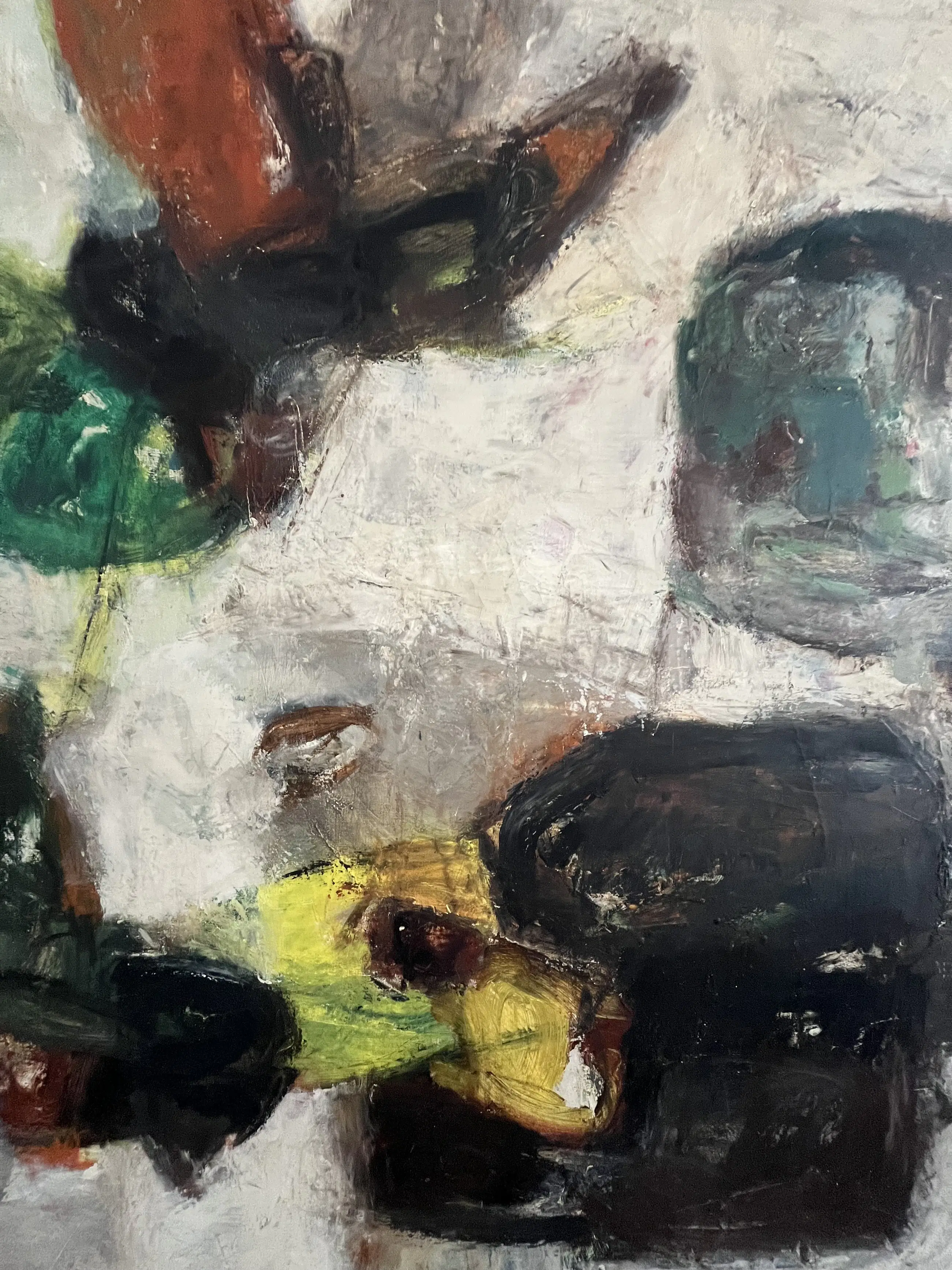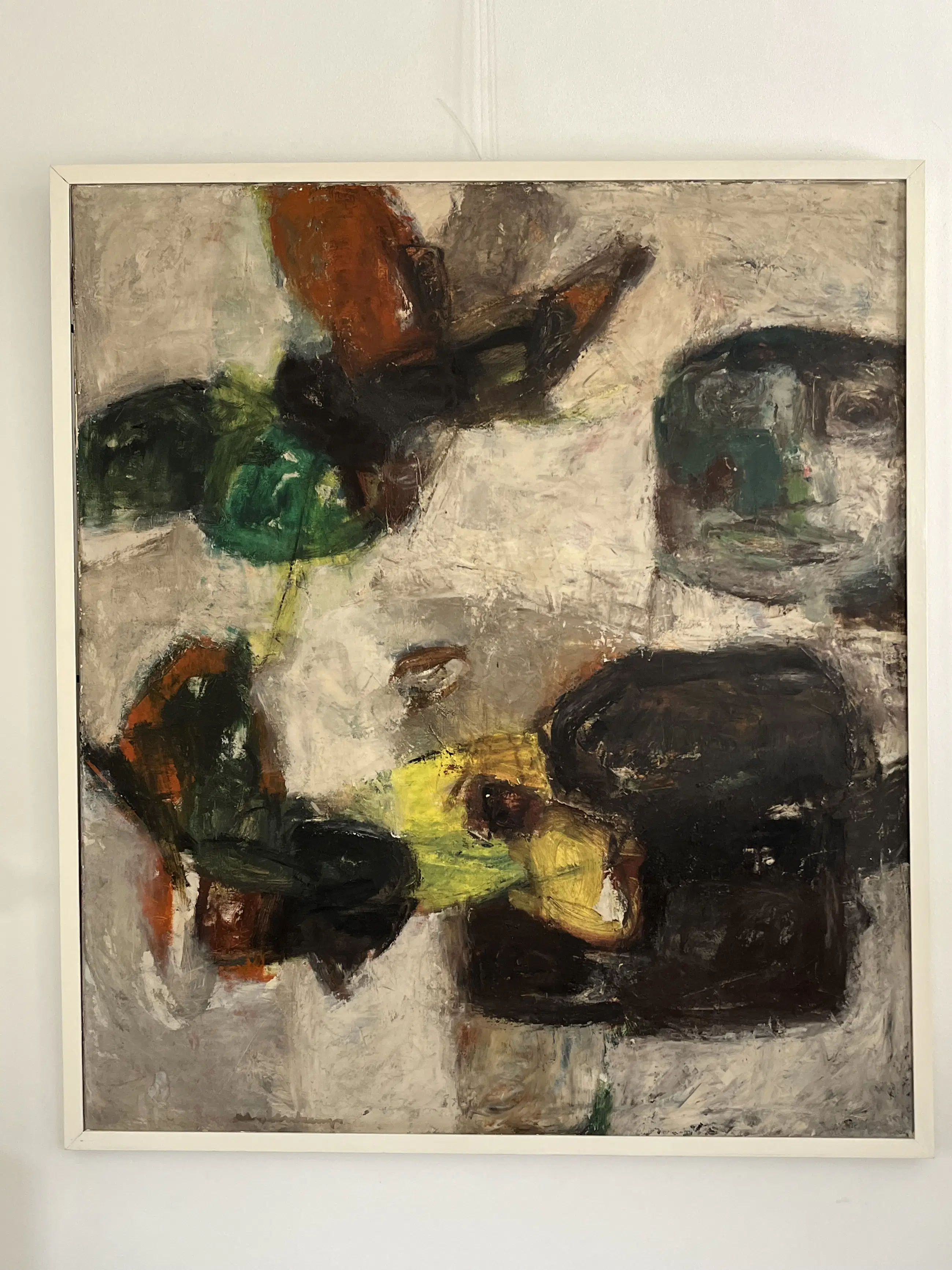 Karakteristiek werk van Nico Molenkamp. Helaas zit in de lichte vlakken craquelé (zie detailfoto’s) en in de rechterhoek zit een “vochtplekje”. (Aan de achterkant is niets van enige vroegere vochtschade te bemerken. Het schilderij inclusief lijst meet 124 x 109,5 cm.