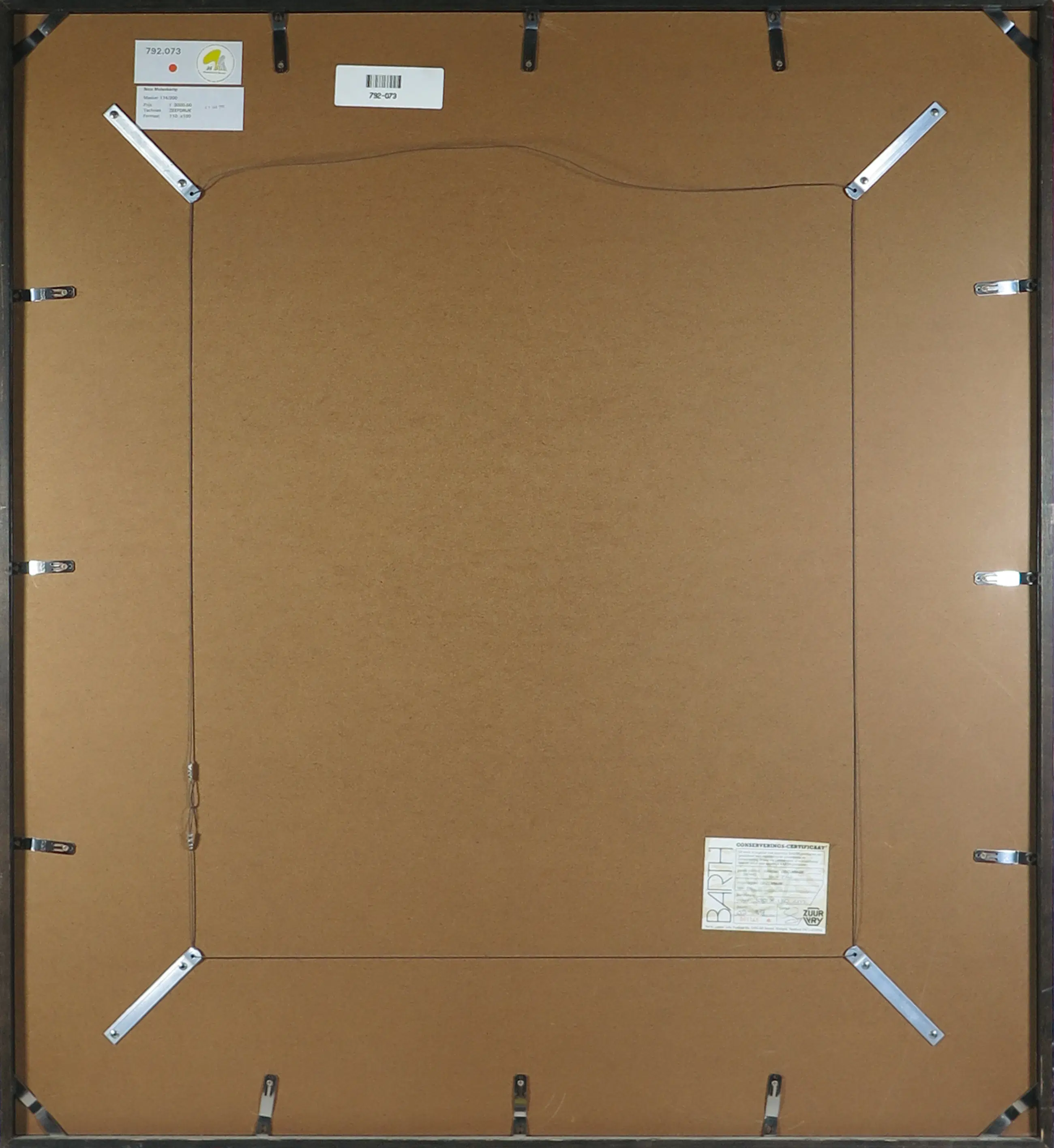 Passe-partout/lijsten: Beschadigingen aan lijsten worden niet beschreven. Indien een werk achter glas is ingelijst en het glas gebroken is, zal dit wel vermeld worden. Passe-partouts worden op geen enkele manier gegarandeerd en ook niet altijd meegezonden.