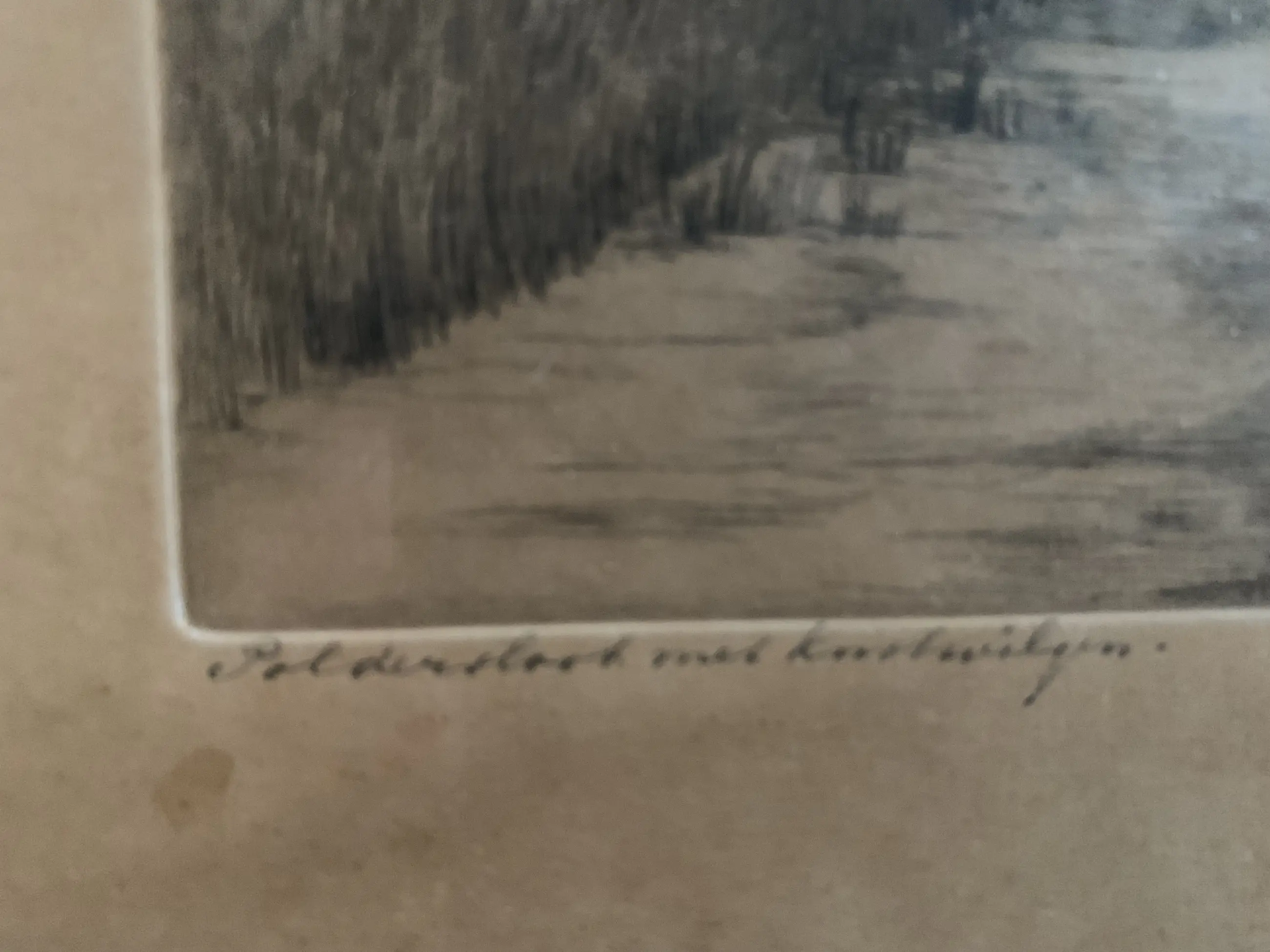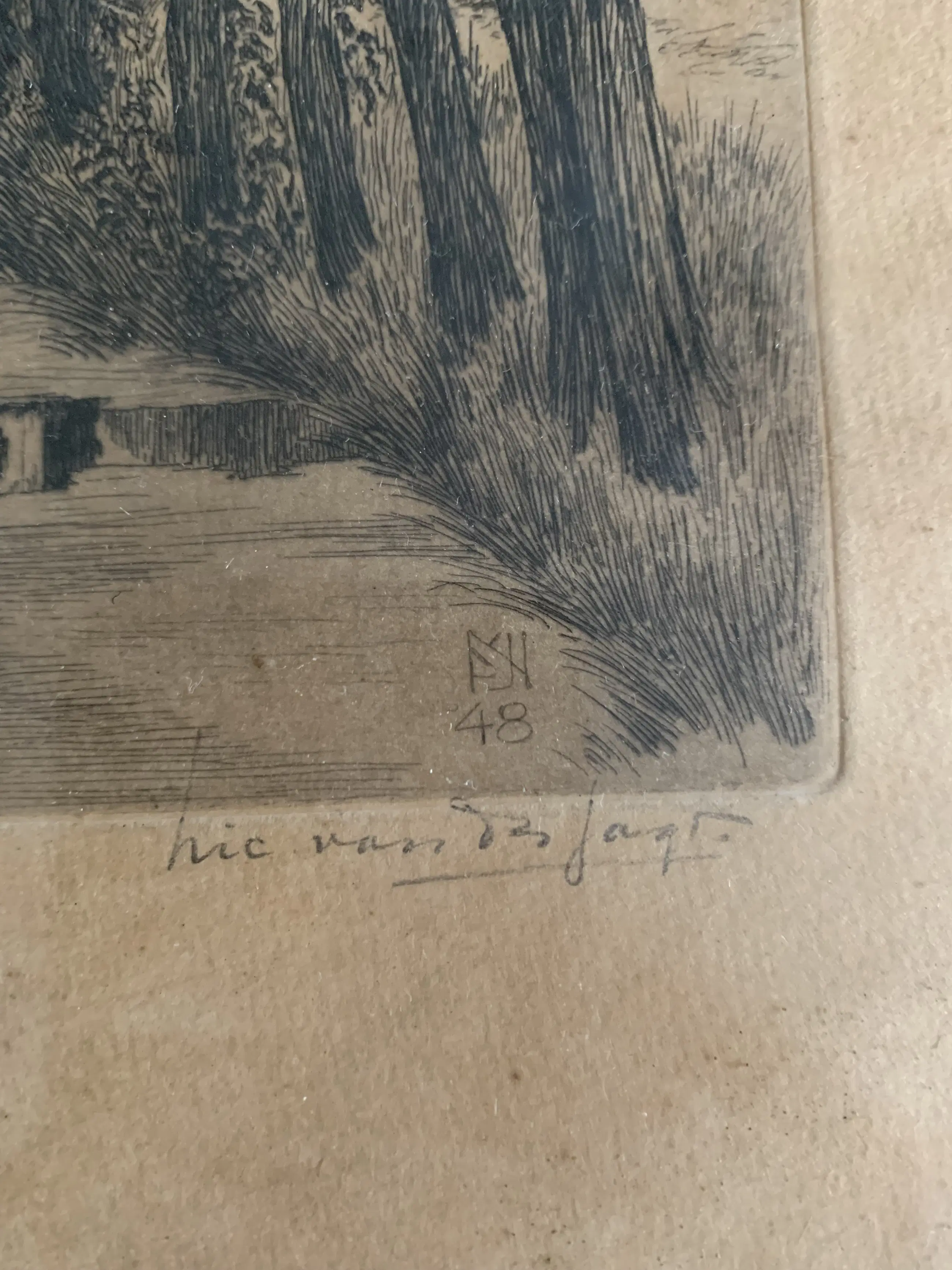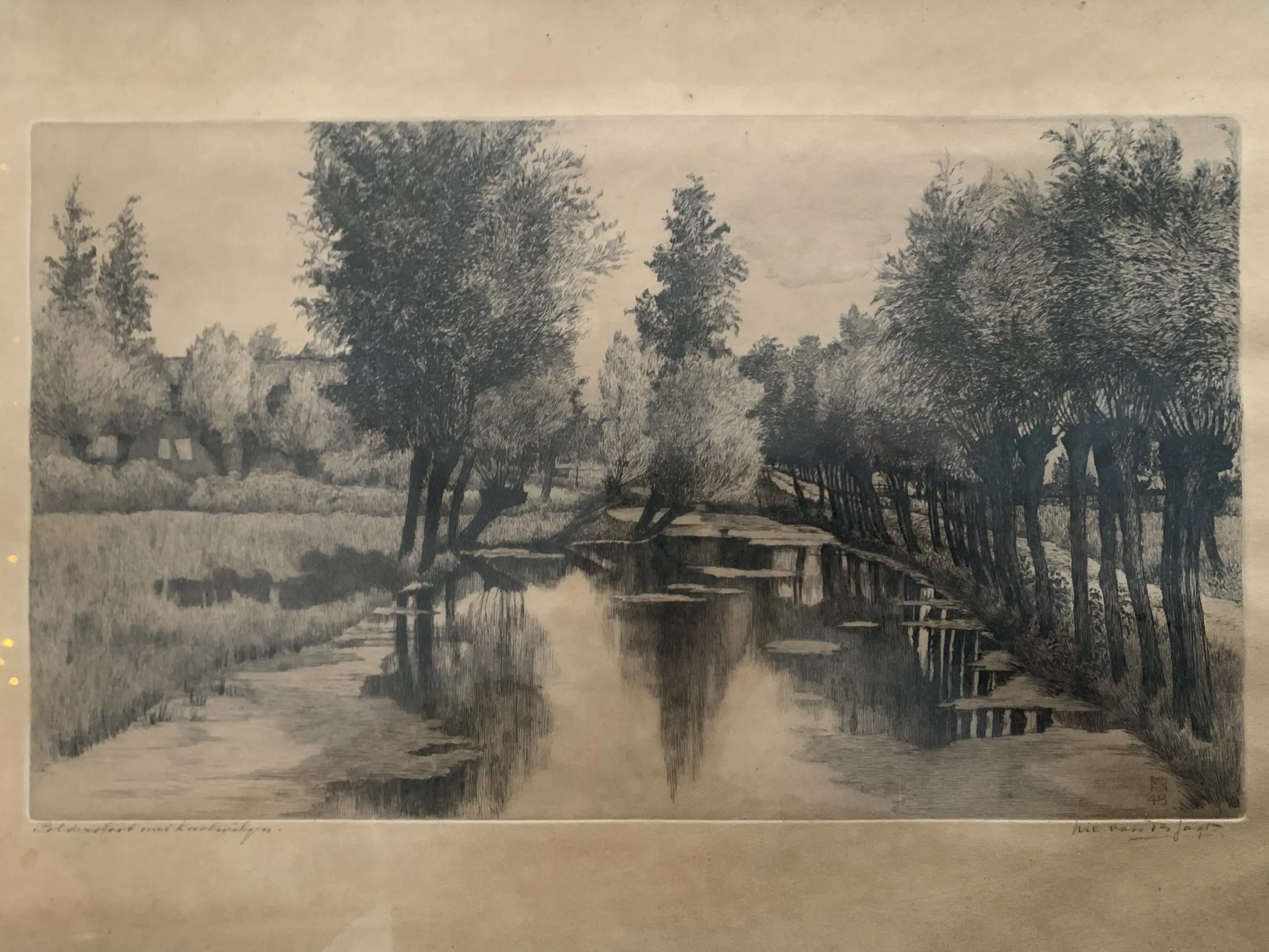 Ets door Nico van der Jagt. Voorstelling van een poldersloot met knotwilgen. Met monogram en gedateerd rechts onder in de druk NvdJ 48 en getiteld linksonder in potlood.