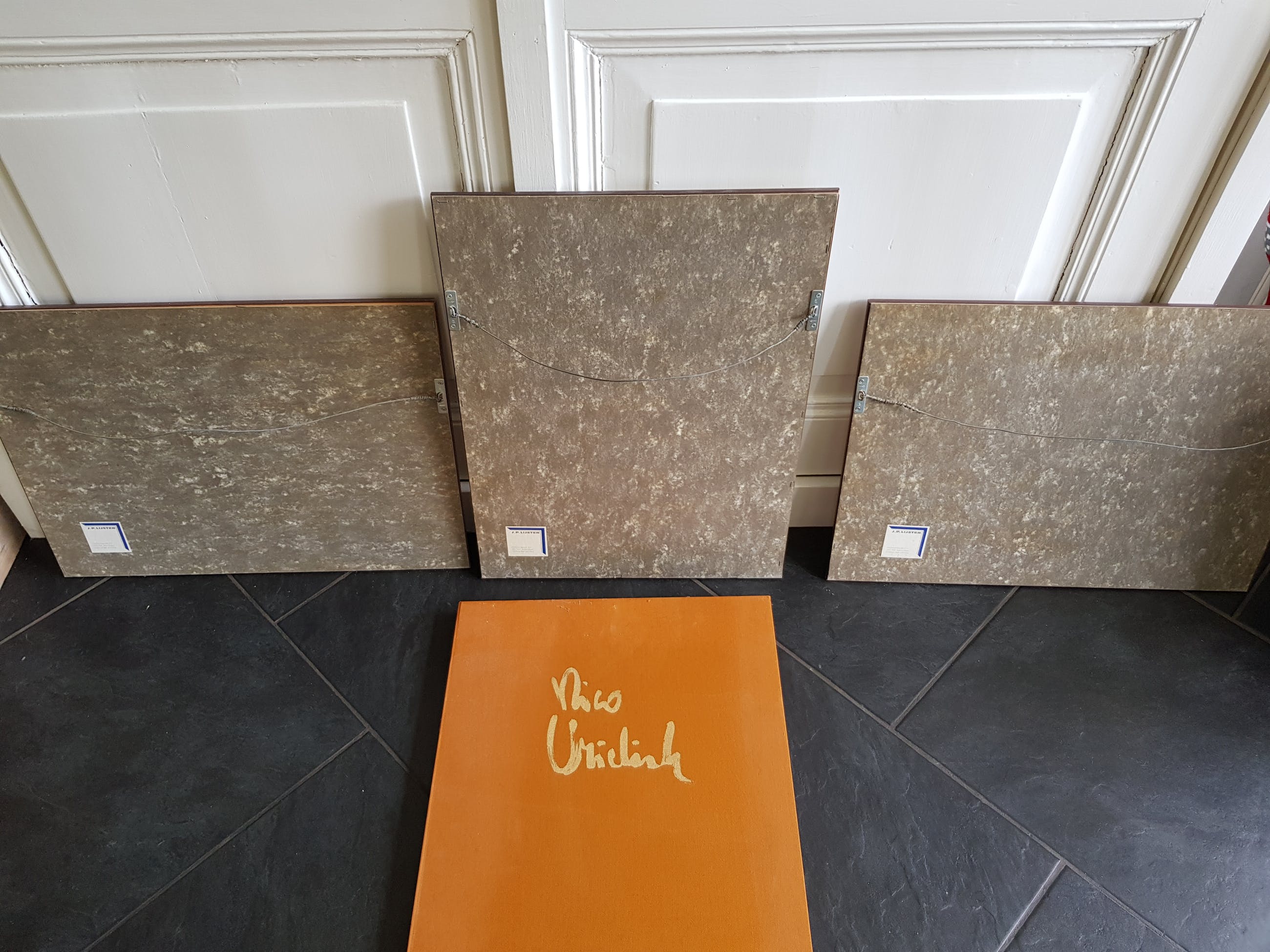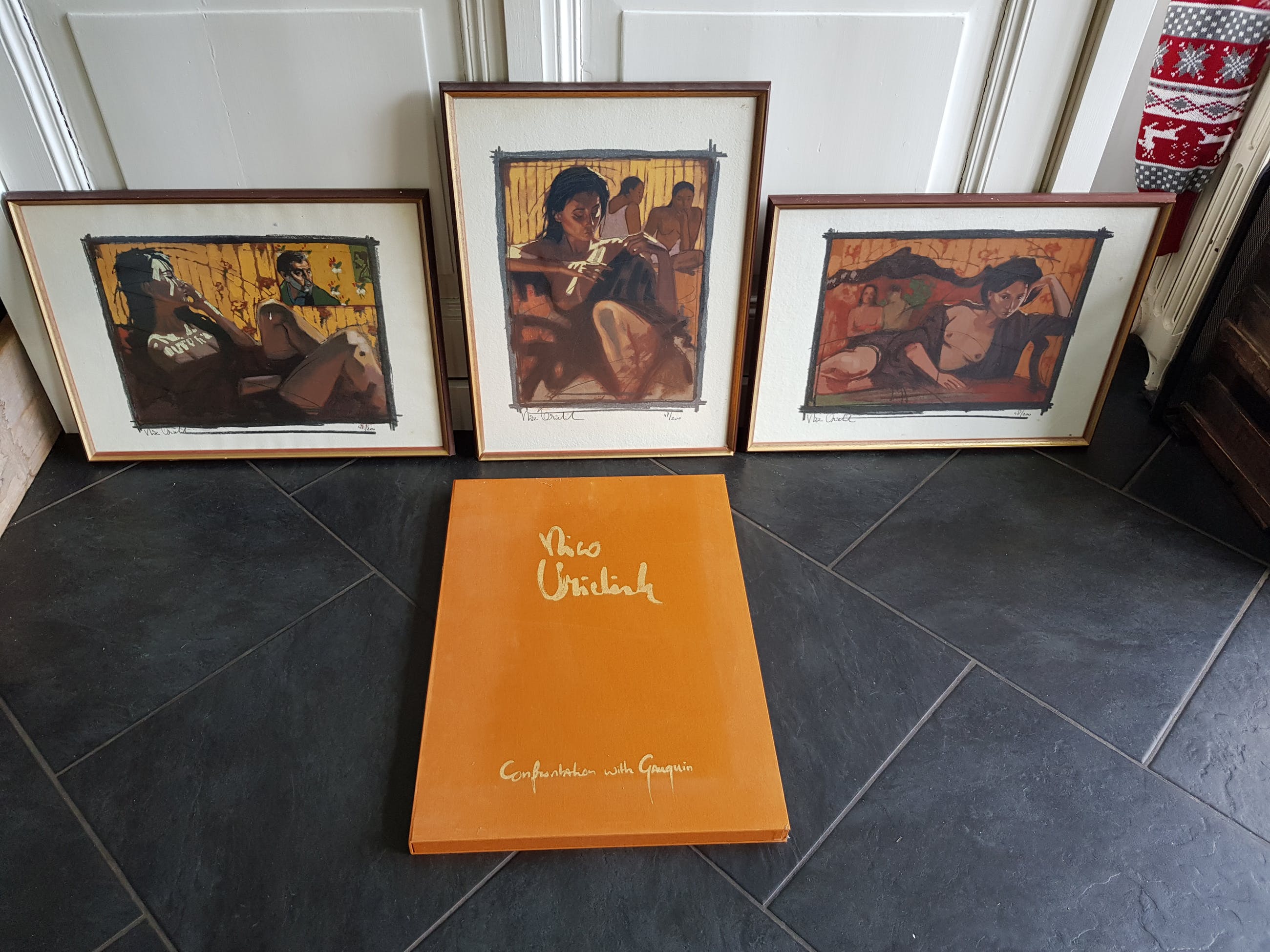 Serie van 3 zeefdrukken (allen nr 48 van 200), met speciale verzamelbox inclusief toelichting/omschrijving van Nico Vrielink gedrukt op hetzelfde papier als de zeefdrukken.Geinspireerd door Gauguin's werken van model Jeanne heeft Nico Vrielink eerst 3 houtskool tekeningen en daarna olie verf schilderijen gemaakt en die hij vervolgens in samenwerking met Peter Wilms als zeefdruk in een oplage van 200x op papier heeft gezet. Twee van de drie voorstellingen zijn liggend en de derde is staand.