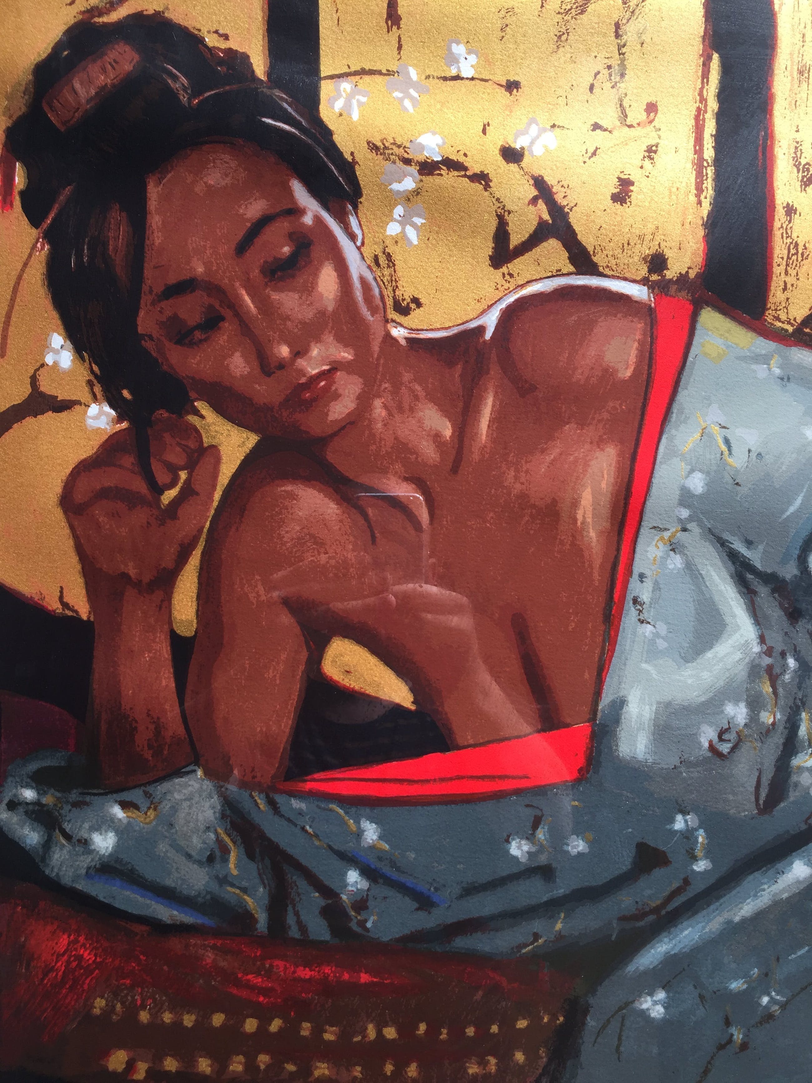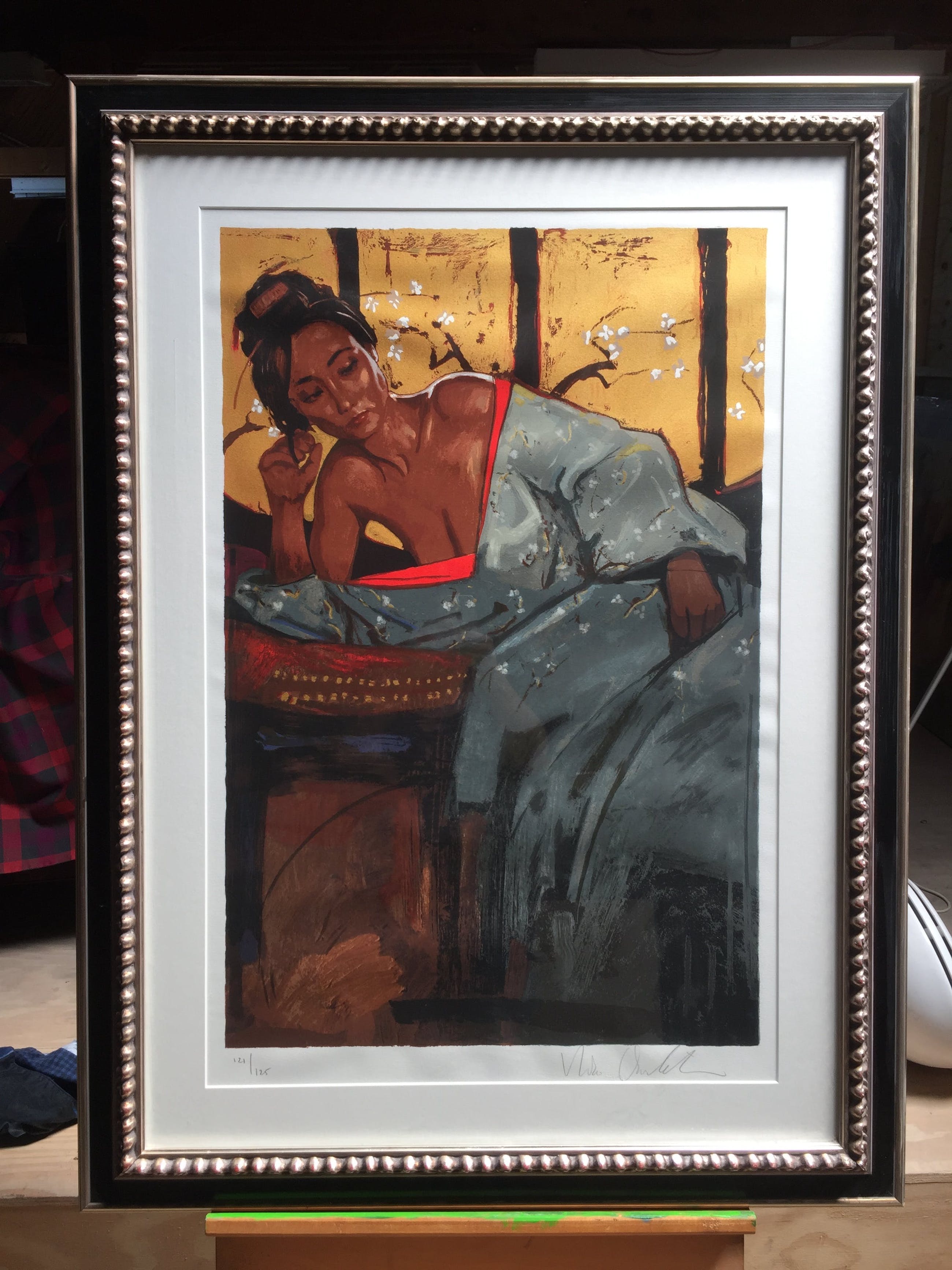 Zeefdruk van Nico Vrielink | 'Jeane in Grijze Sarong', zuurvrij ingelijst (met passepartout) in een fraaie, orientaalse kraallijst.