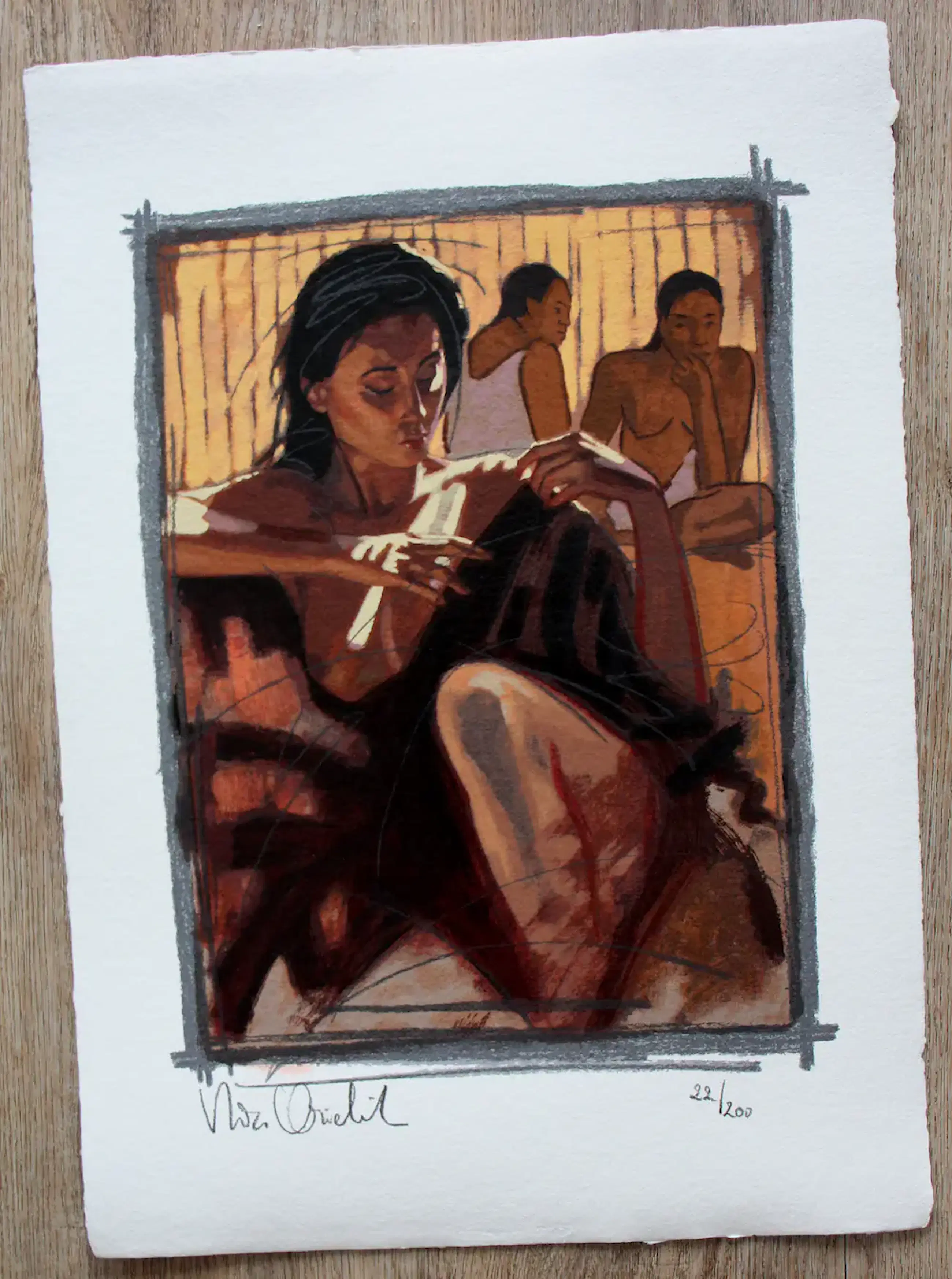 Zeefdruk van Nico Vrielink. Titel: Le rêve(de droom). Nummer: 22/200. Afmetingen blad: H55 x b39cm. Afmetingen voorstelling: H39 x b29cm. Het werk is links onderaan gesigneerd door de kunstenaar. De authenticiteit van het werk wordt volledig gegarandeerd. Een certificaat van echtheid kan , op aanvraag, worden gemaild.