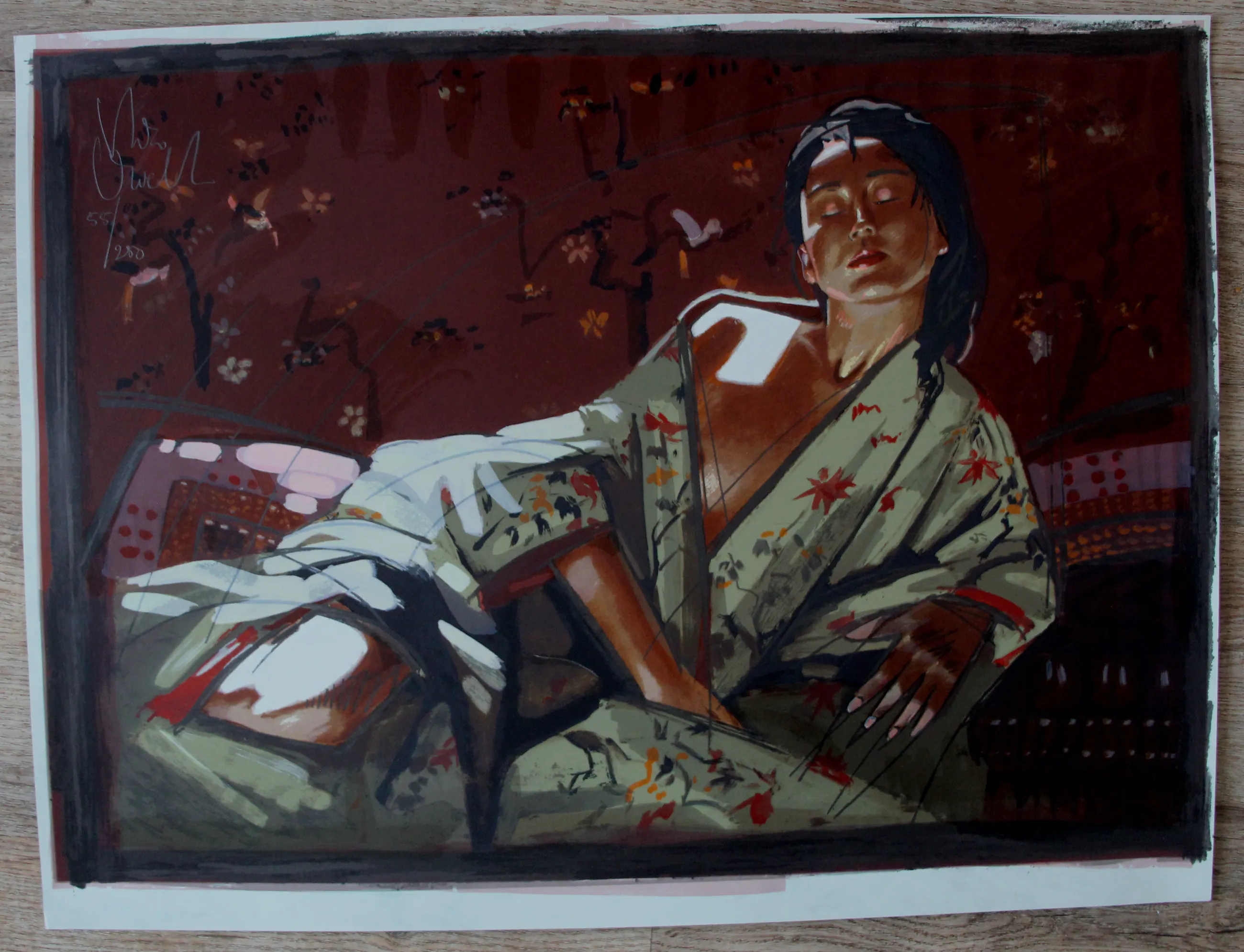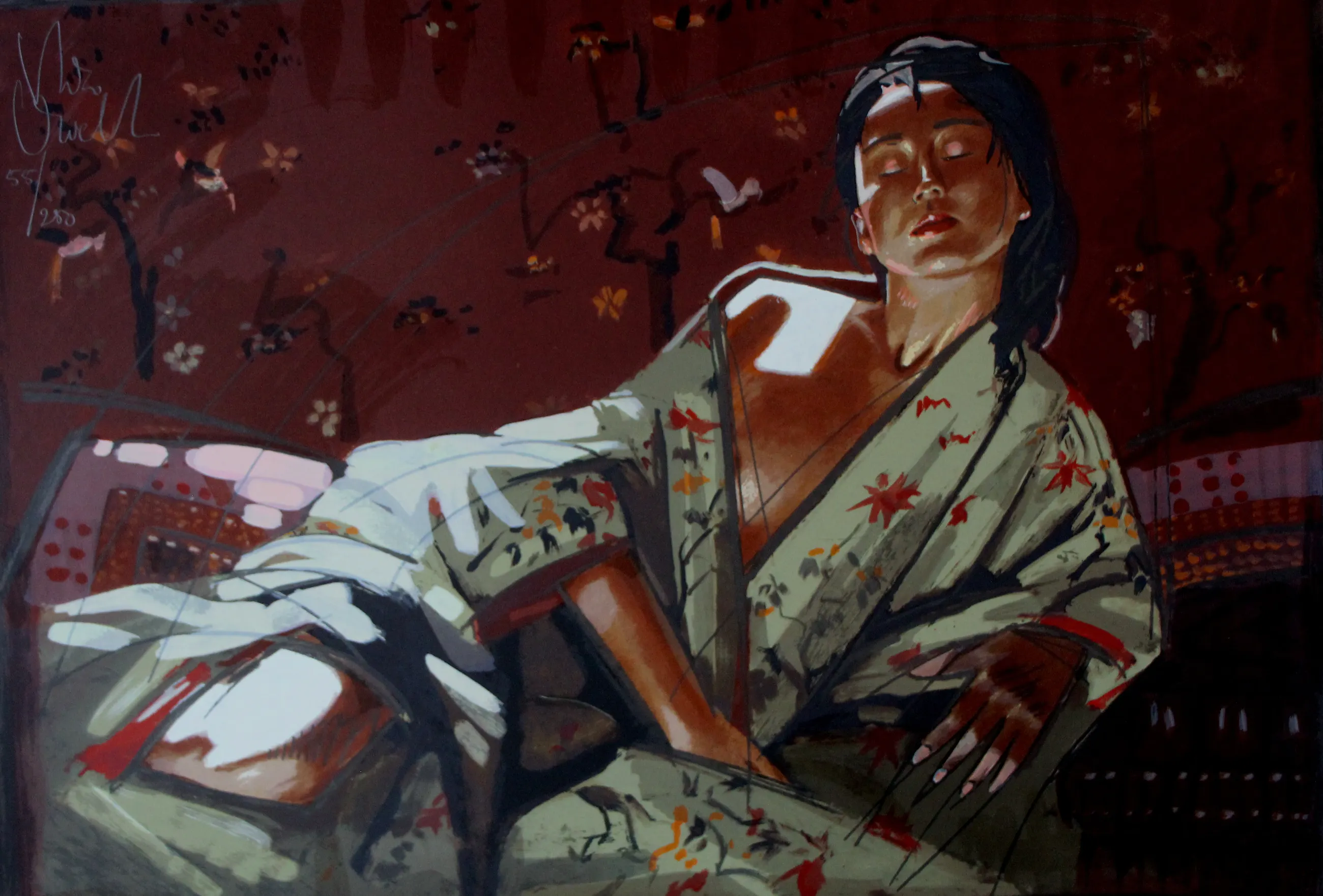 Zeefdruk van Nico Vrielink. Titel: Clair Obscur. Nummer: 55/250. Afmetingen blad: H55 x b73cm. Afmetingen voorstelling: H53 x b71cm. Het werk is links bovenaan gesigneerd door de kunstenaar.