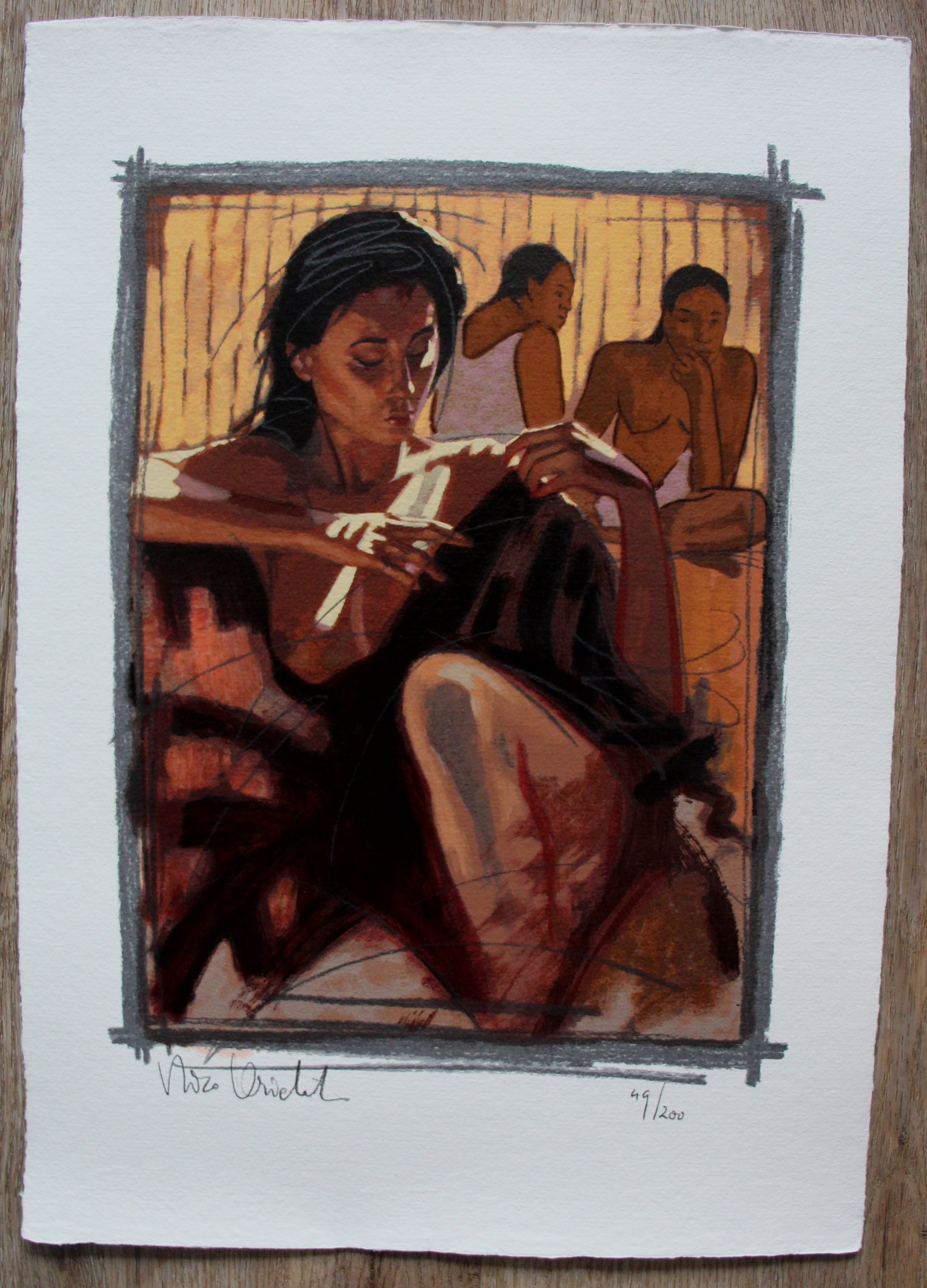 Zeefdruk van Nico Vrielink. Titel: Confrontatie met Gauguin. Nummer: 49/200. Afmetingen blad: H55 x b39cm. Afmetingen voorstelling: H39 x 30cm. Het werk is linksonder gesigneerd door de kunstenaar. De authenticiteit van dit werk wordt volledig gegarandeerd. Een certificaat van echtheid kan, op aanvraag, worden gemaild.