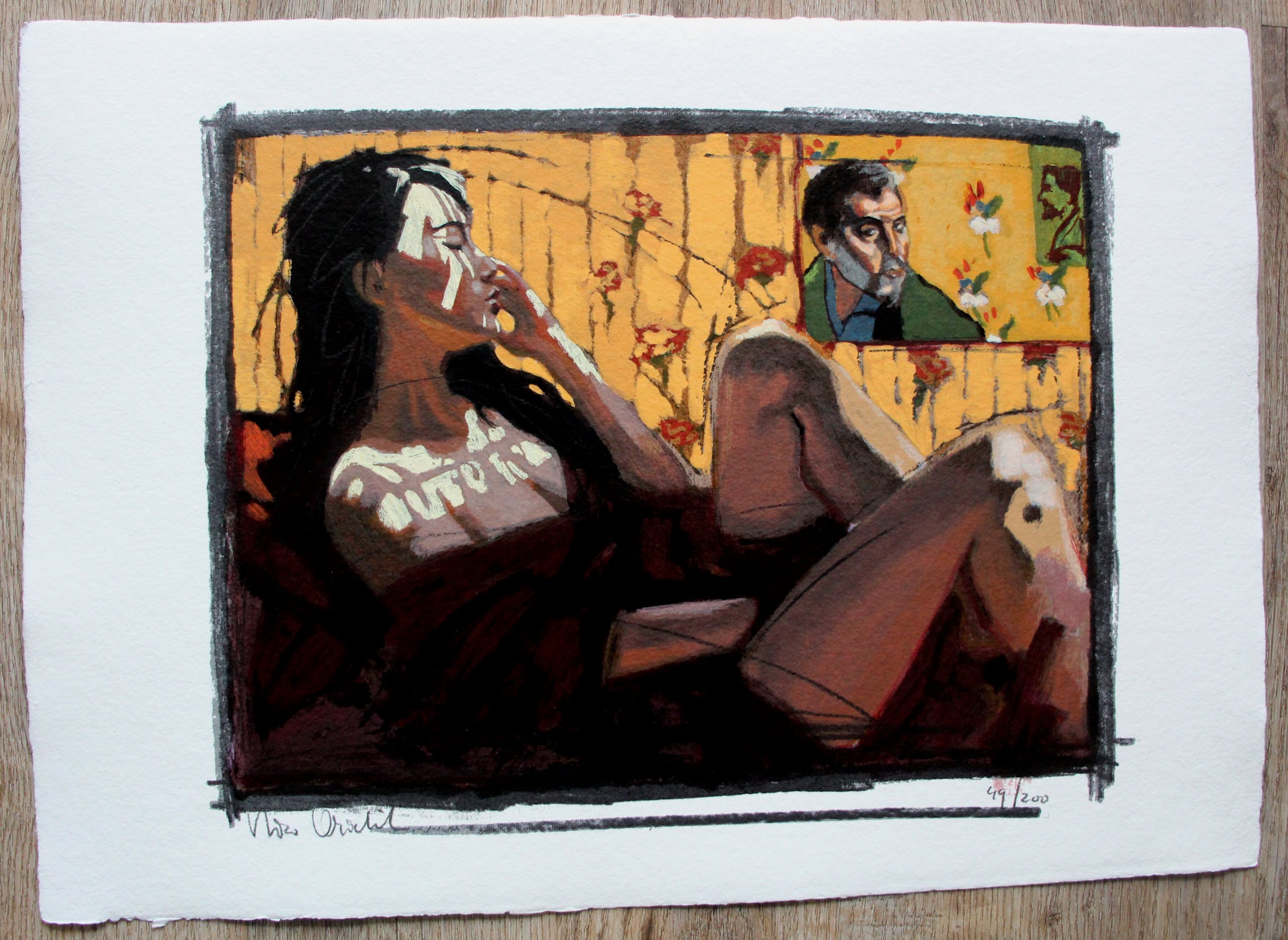 Zeefdruk van Nico Vrielink. Titel: Confrontatie met Gauguin. Nummer: 49/200. Afmetingen blad: H39 x b55cm. Afmetingen voorstelling: H30 x 39cm. Het werk is linksonder gesigneerd door de kunstenaar. De authenticiteit van dit werk wordt volledig gegarandeerd. Een certificaat van echtheid kan, op aanvraag, worden gemaild.