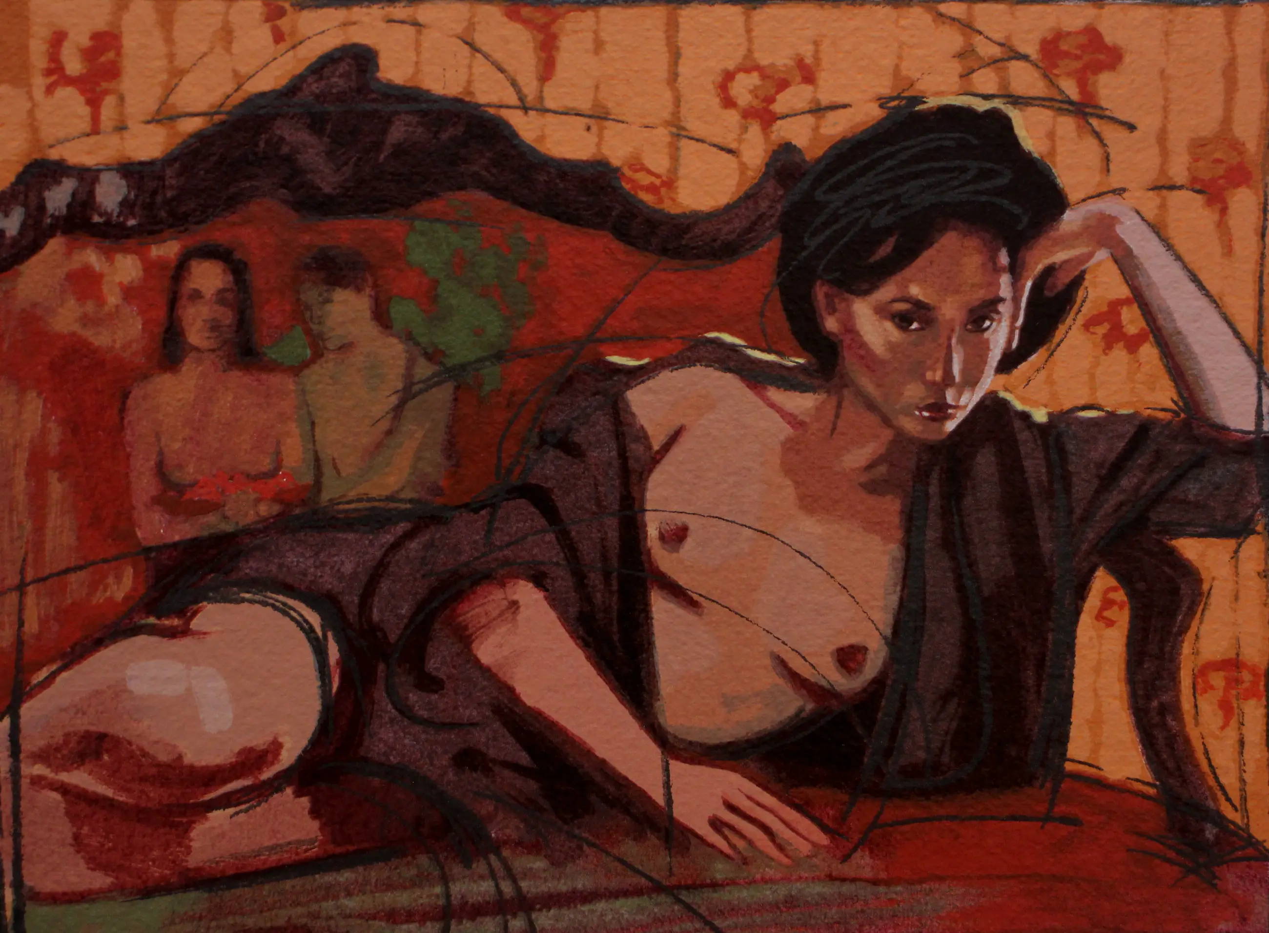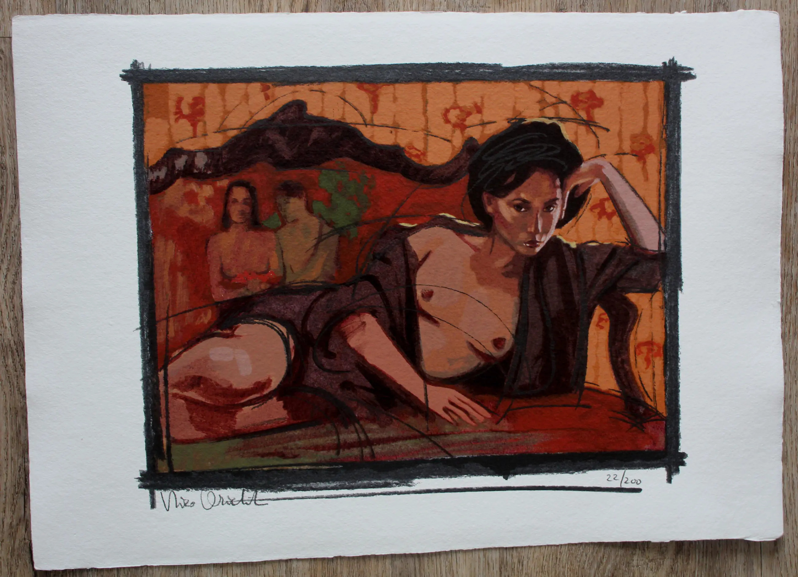 Zeefdruk van Nico Vrielink. Titel: Les seins aux fleurs rouges. Nummer: 22/200. Afmetingen blad: H39 x b55cm. Afmetingen voorstelling: H30 x b39cm. Het werk is links onderaan gesigneerd door de kunstenaar.