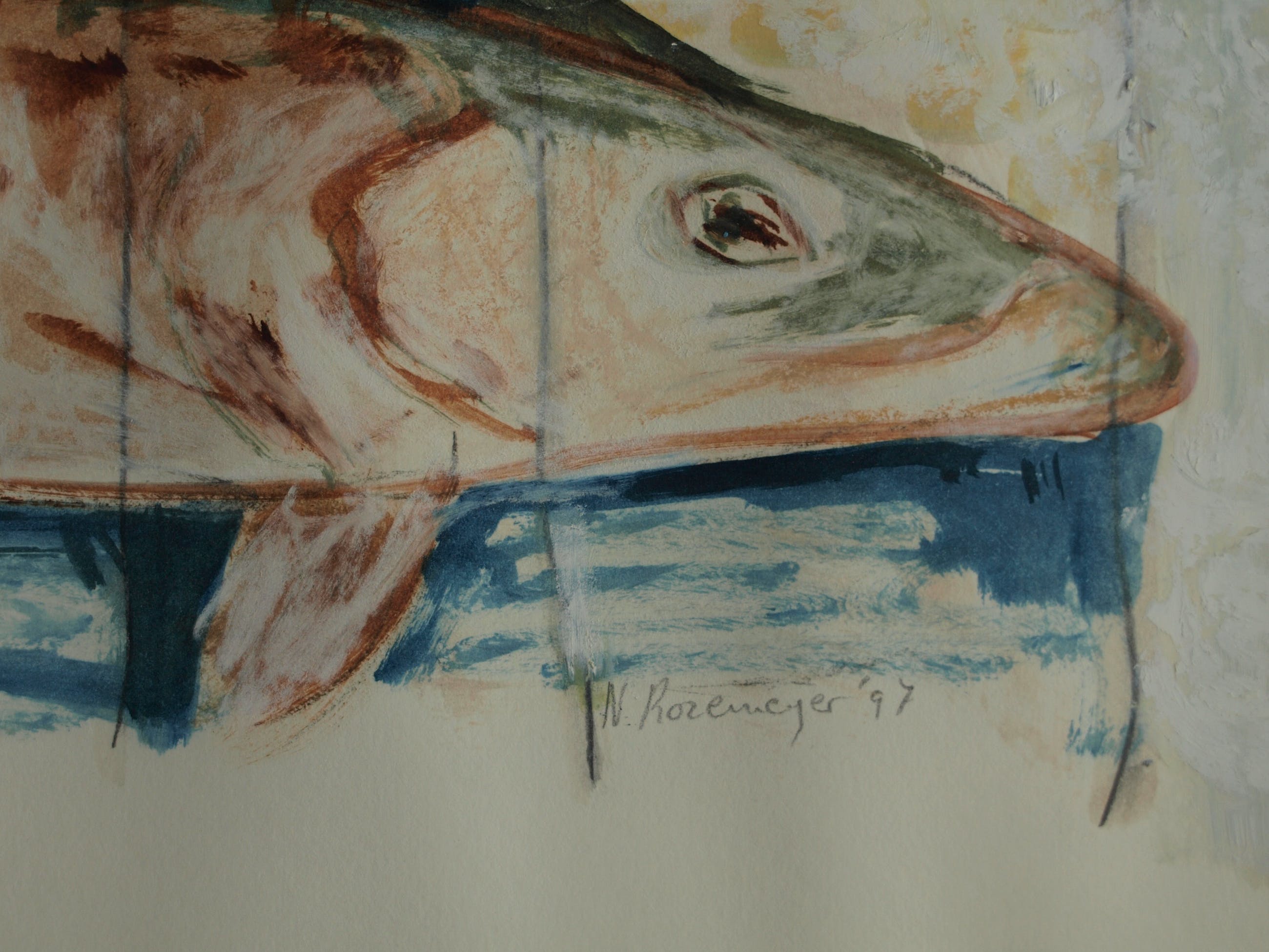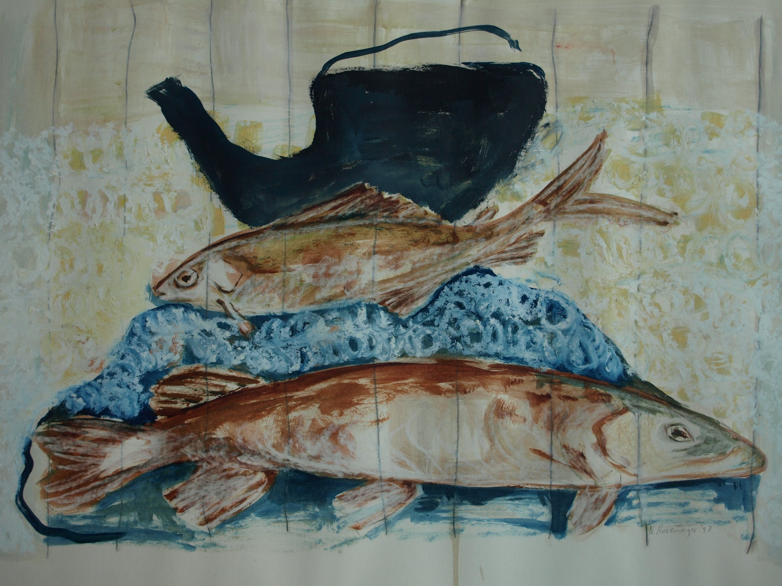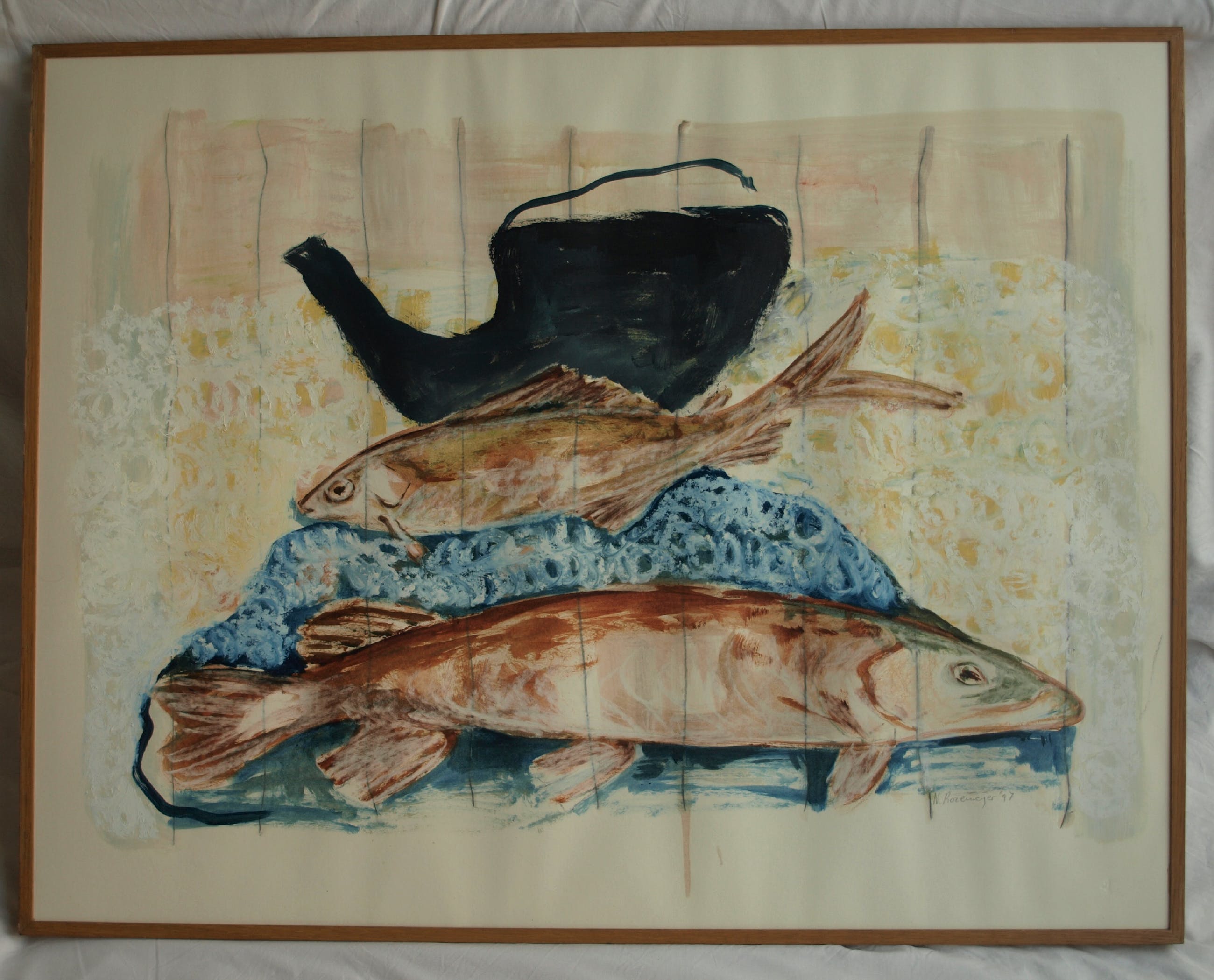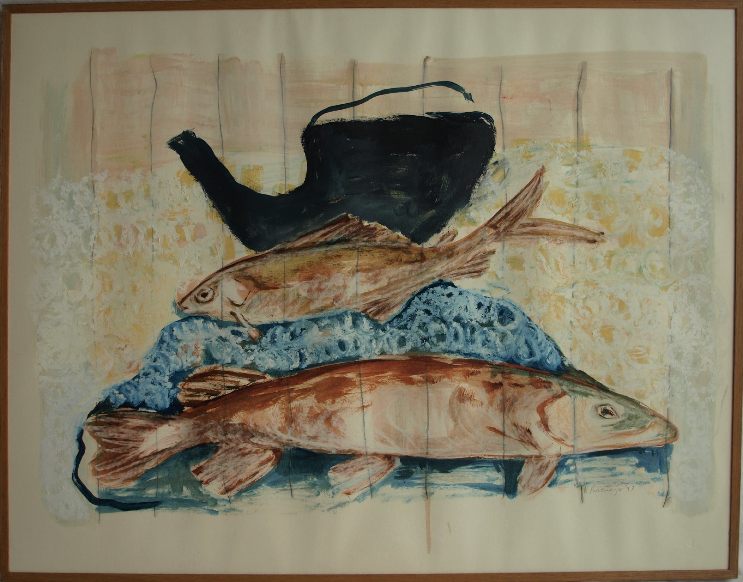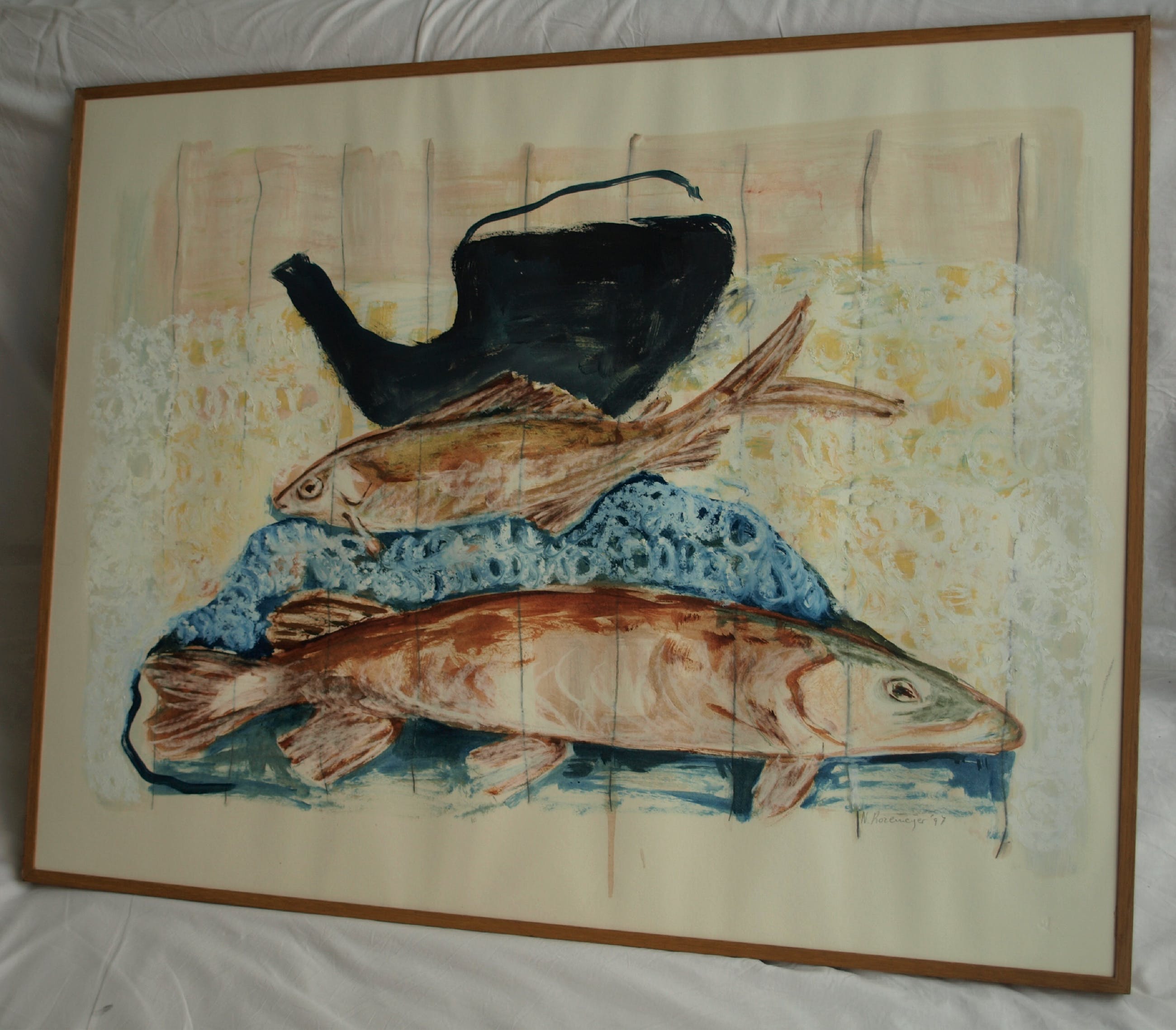 Een groot werk uit 1997 van de Nederlandse kunstenares Nicola Rozemeijer (1955) met een voorstelling van vissen op ijs.