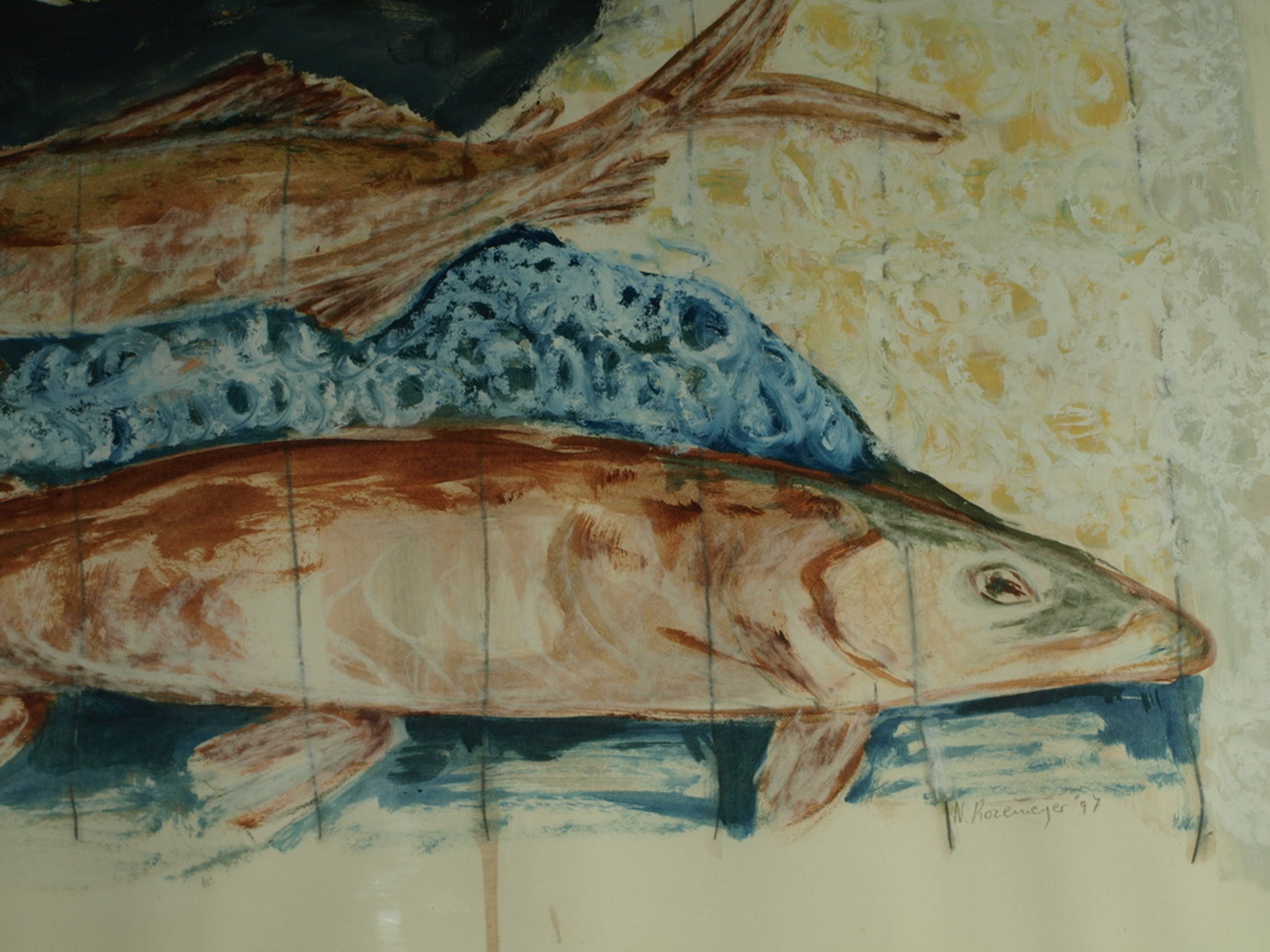 Een groot schilderij van de Nederlandse kunstenares Nicola Rozemeijer met een voorstelling van vissen op ijs.