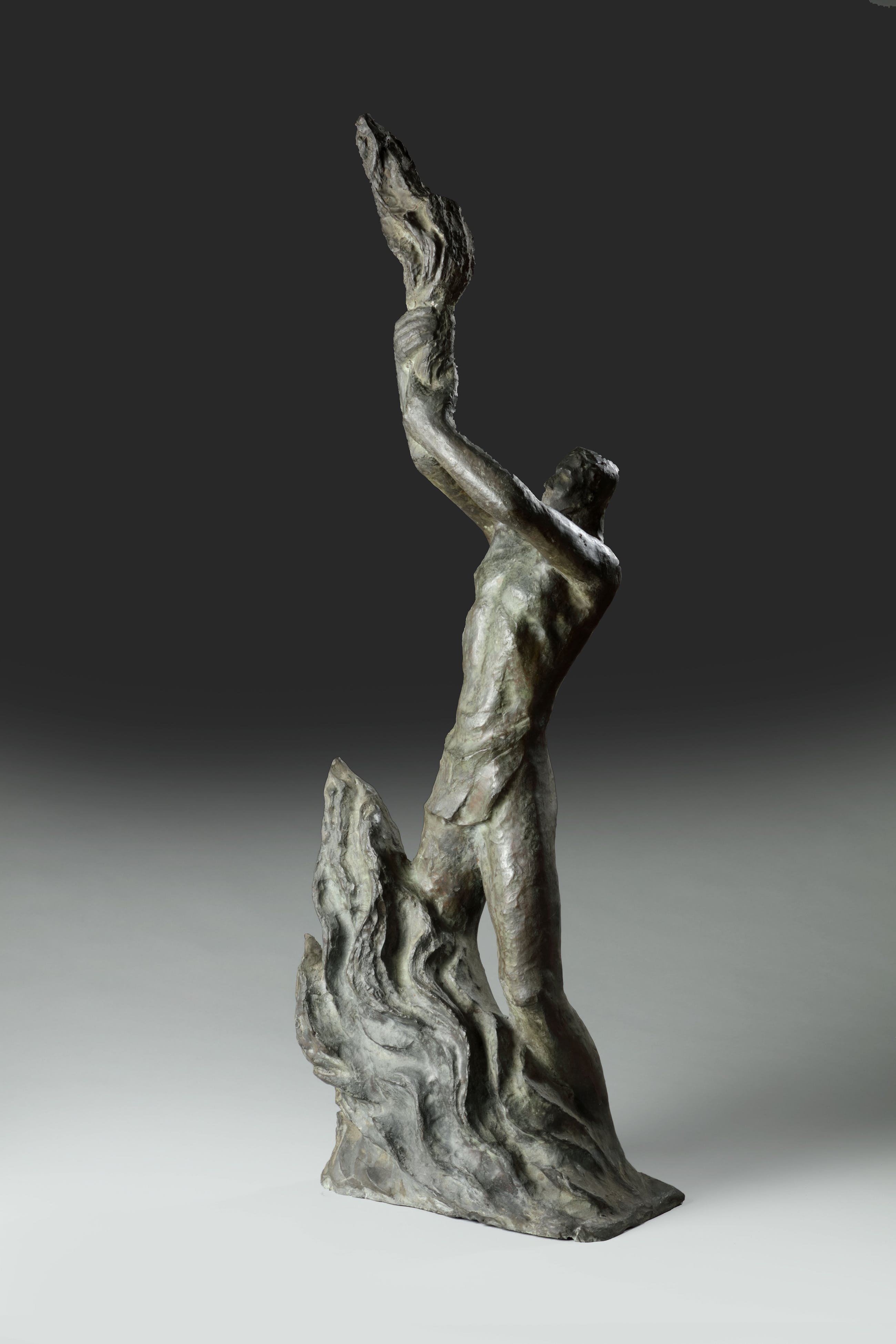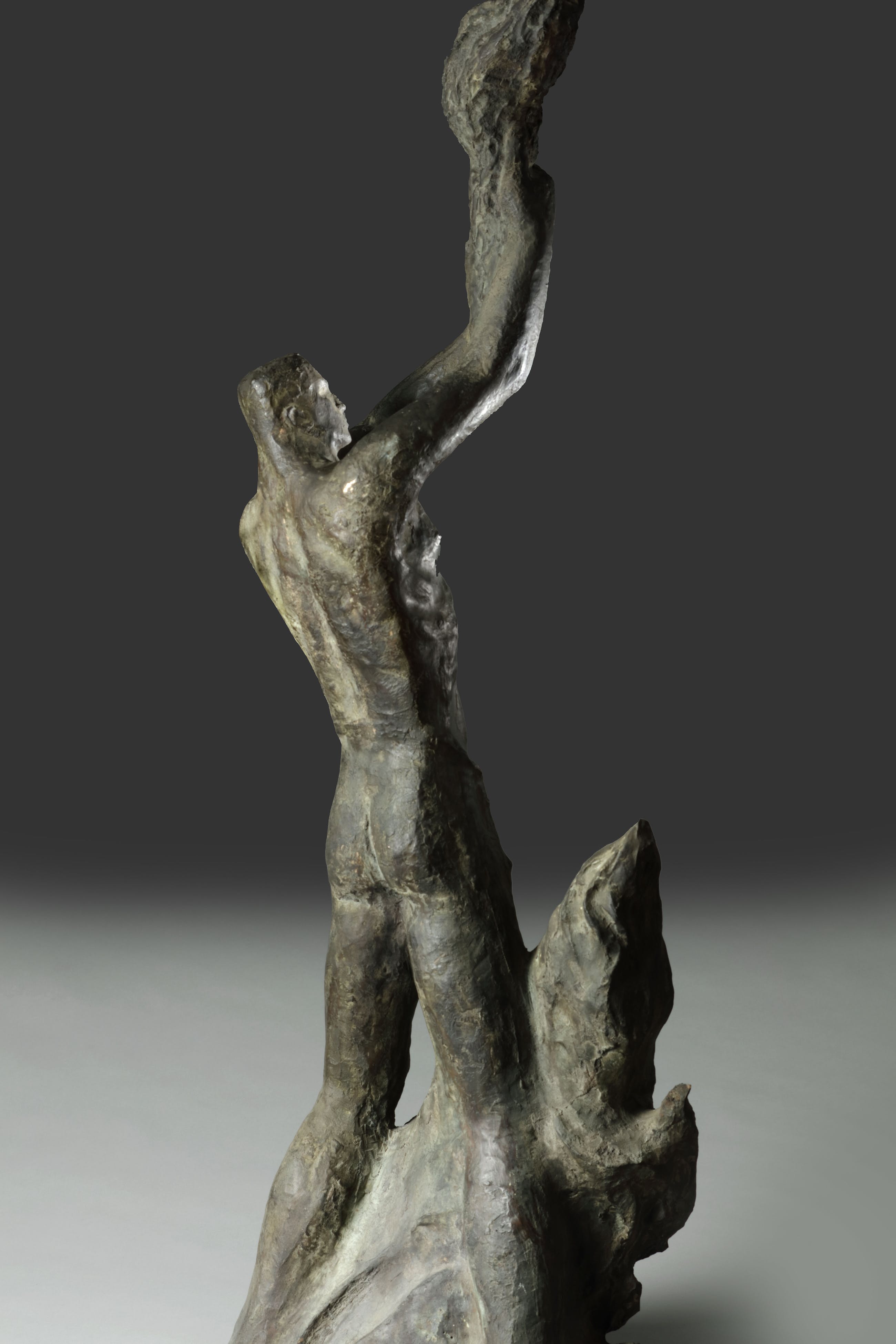 We zien Prometheus, die volgens de Griekse mythologie vuur steelt van de Goden en aan de mensen schenkt. De mens leerde hierdoor metaal bewerken en een technische beschaving te ontwikkelen.Volgens Rob Driessen (Tussen Kunst en Kitsch) kent dit beeld van Prometheus een waarde van 8.000 euro.