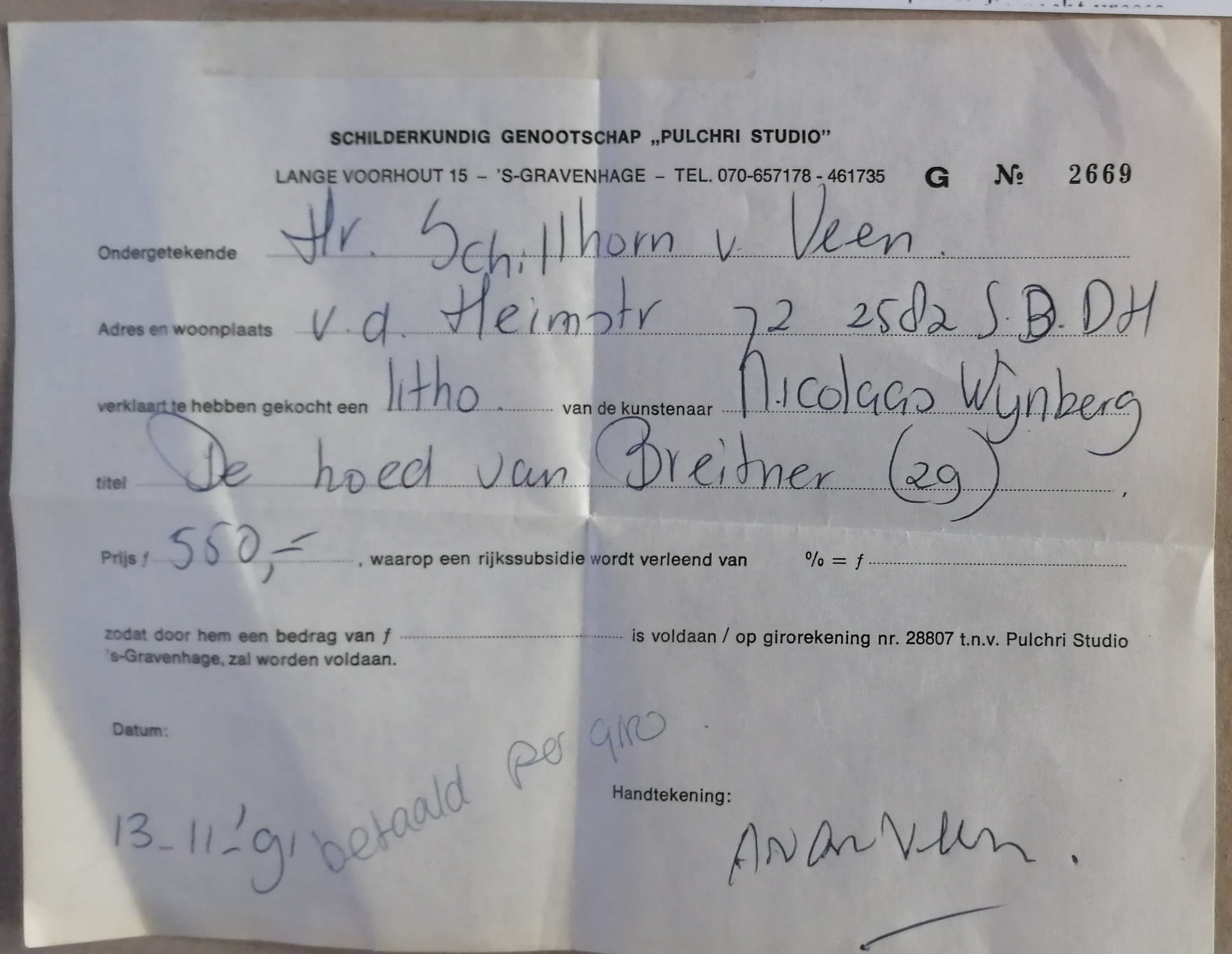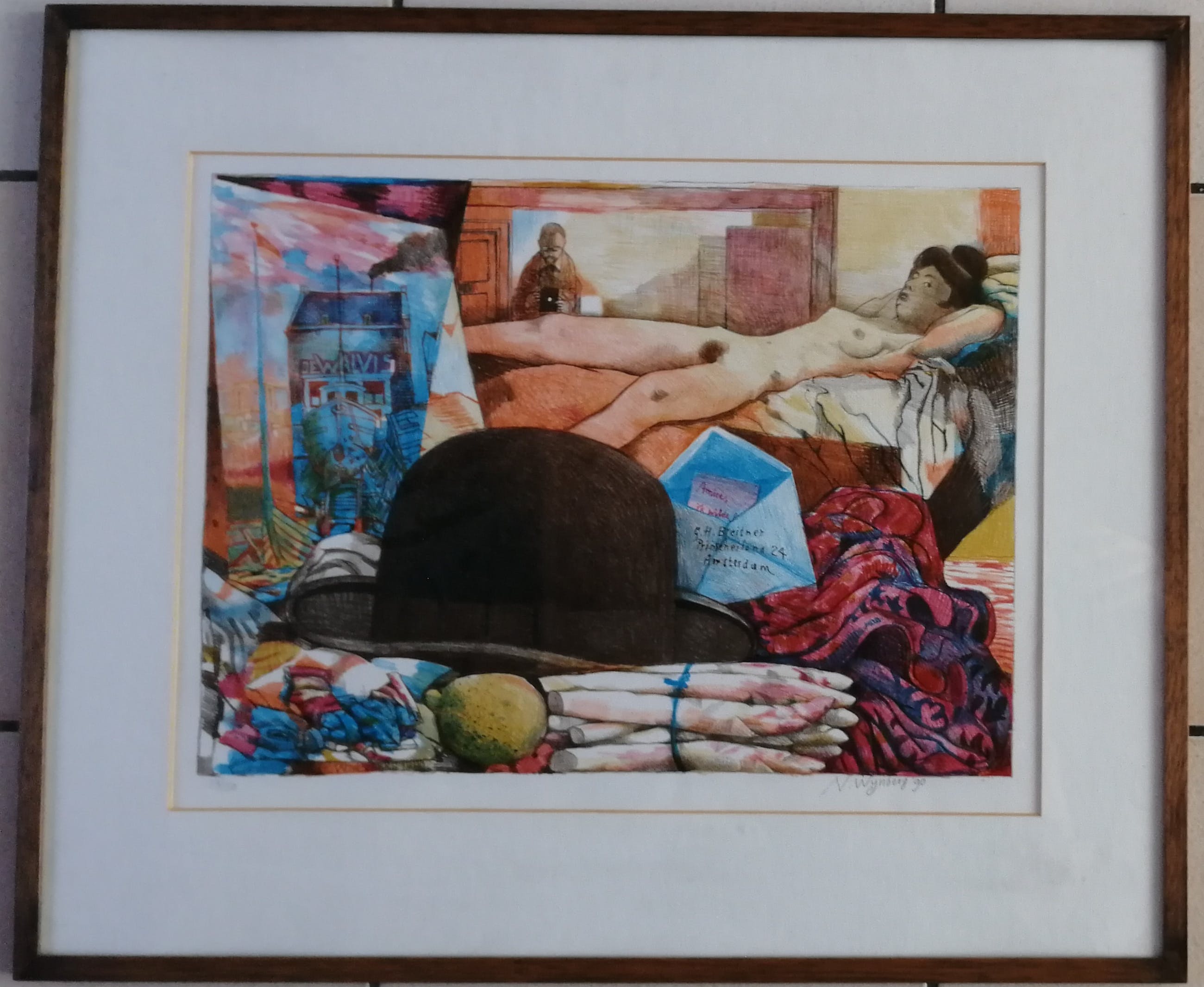 Kleurenlitho uit 1990. Potlood gesigneerd en gedateerd '90 rechtsonder en genummerd 13/50 linksonder. Beeldmaat 36x49,5 cm. Bladmaat 47x65 cm. Losbladig. Aankoopnota van Pulchri Studio d.d. 13-11-'91 wordt bijgeleverd. Nicolaas Wijnberg werd geboren te Amsterdam op 22 november 1918 en overleed te Laren (N-H) op 11 juni 2006. Opleiding aan de Grafische School en de Rijksacademie voor Beeldende Kunst te Amsterdam. Leerling van Jos Rovers en Heinrich Campendonk. Veelzijdig kunstenaar. Lid van Pulchri Studio, De Realisten en Sint Lucas.