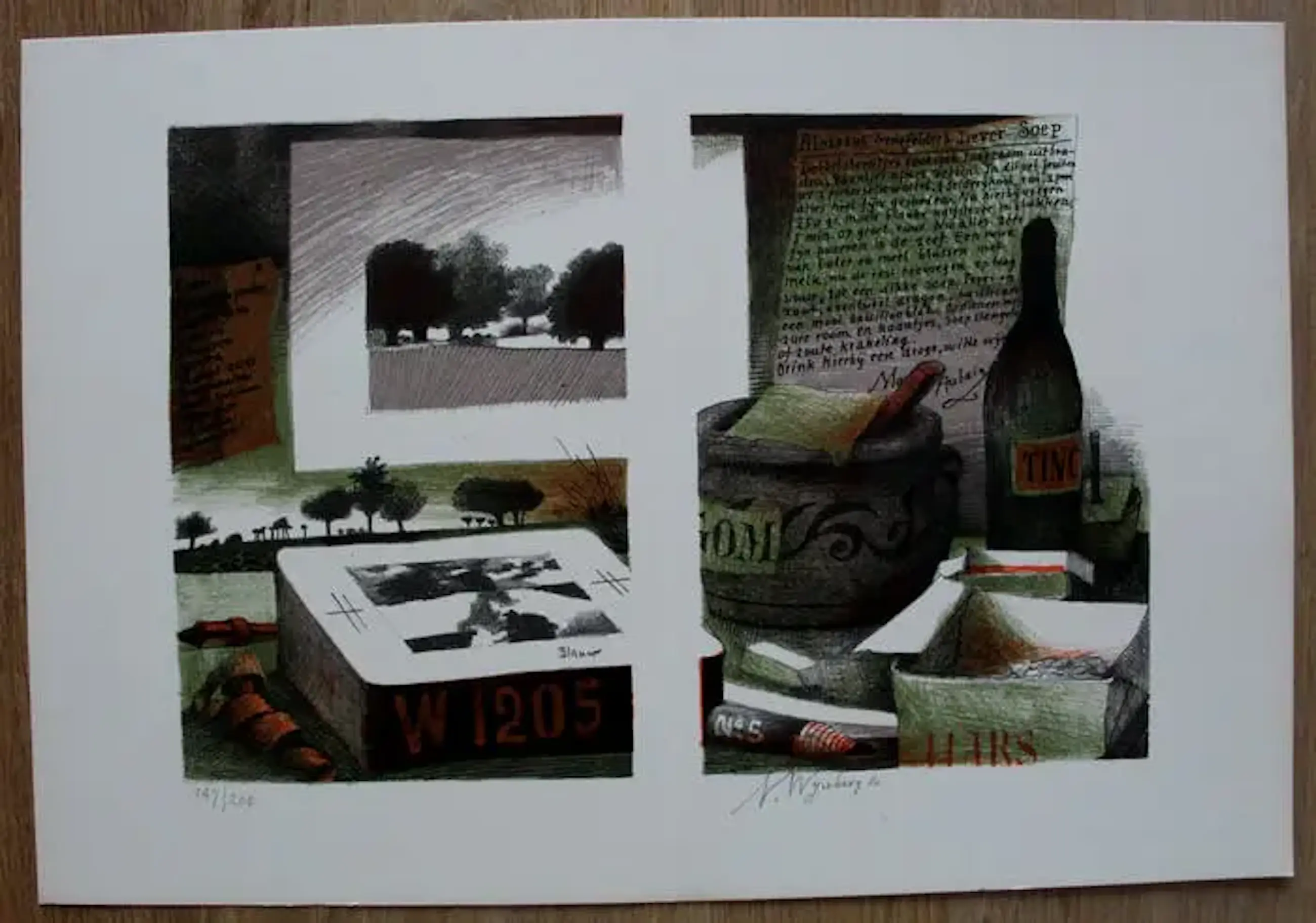Litho van Nicolaas Wijnberg. Jaar: 1979.Titel: Lof van het buiten tekenen. Nummer: 119/200(Nr kan afwijken, ivm meerdere in bezit). Afmetingen blad: H32 x b46cm. Afmetingen per voorstelling: H24 x b17cm. Onder het rechtse werk door de kunstenaar gesigneerd met potlood. De authenticiteit van het, aangeboden, werk wordt volledig gegarandeerd. Een certificaat van echtheid kan, op aanvraag, worden gemaild.
