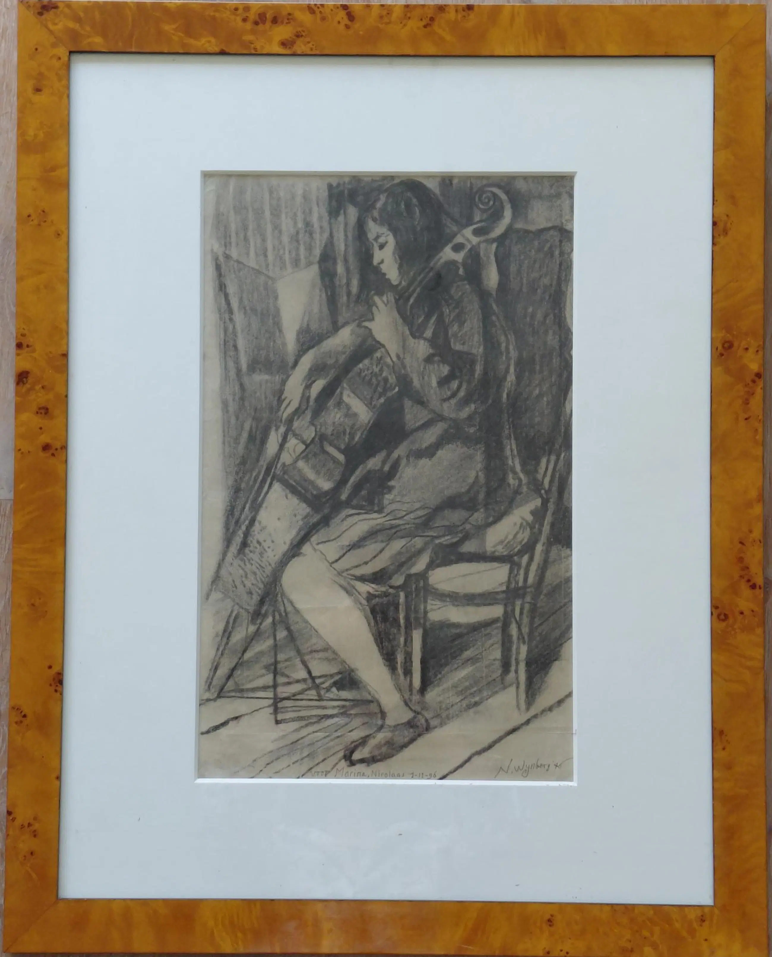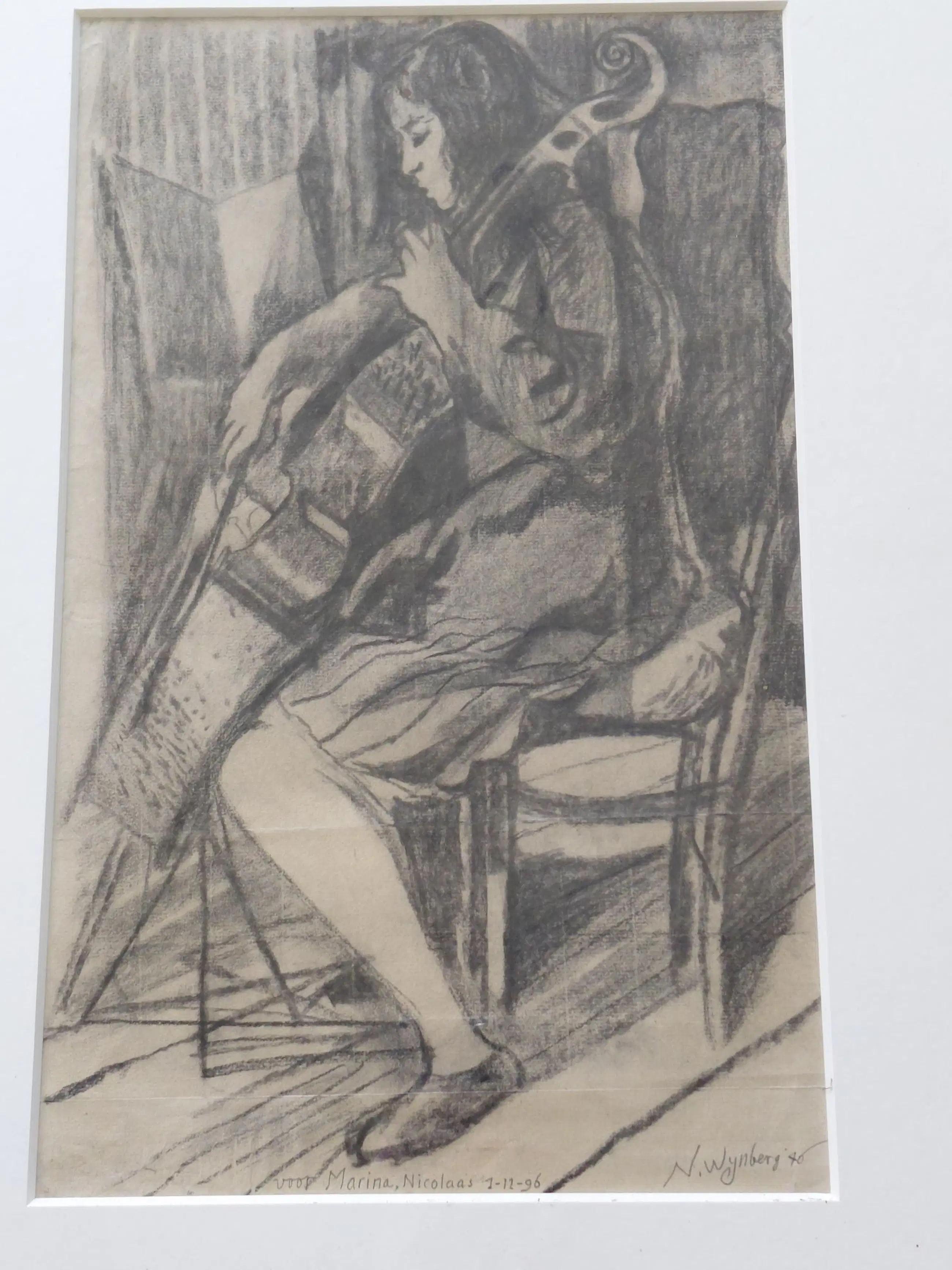 Houtskool tekening op Ingres papier. Cello spelende vrouw.