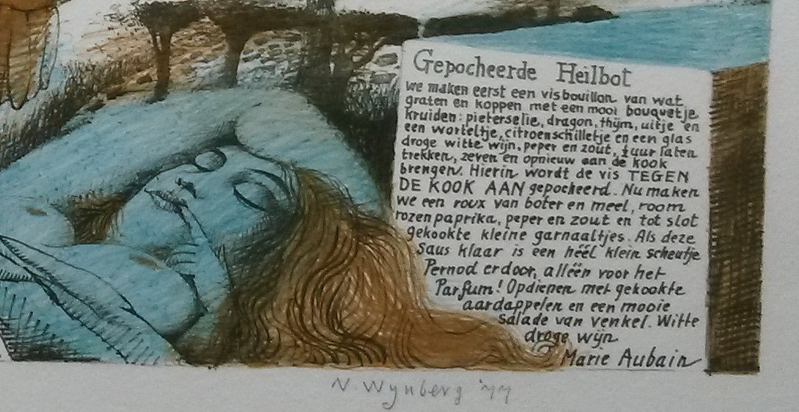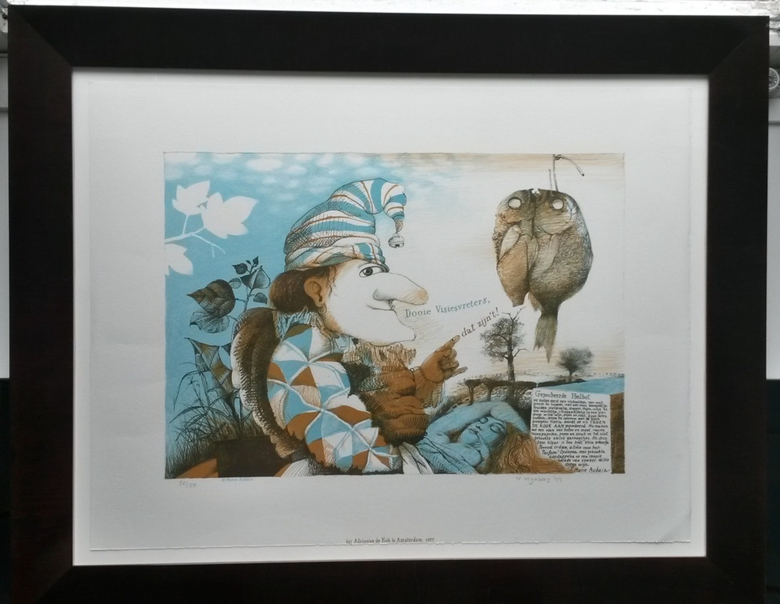 Prachtige kleurenlitho van Nicolaas Wijnberg, getiteld Pulchinella met vis, op geschept papier. Het werk is met potlood gesigneerd en gedateerd 1977. Het betreft nummer 50 van een oplage van 50. De afbeelding is 35 x 50 cm, het papier is 50 x 65 cm. Het werk is professioneel ingelijst in een schitterende houten lijst, het geheel kan zo aan de muur.