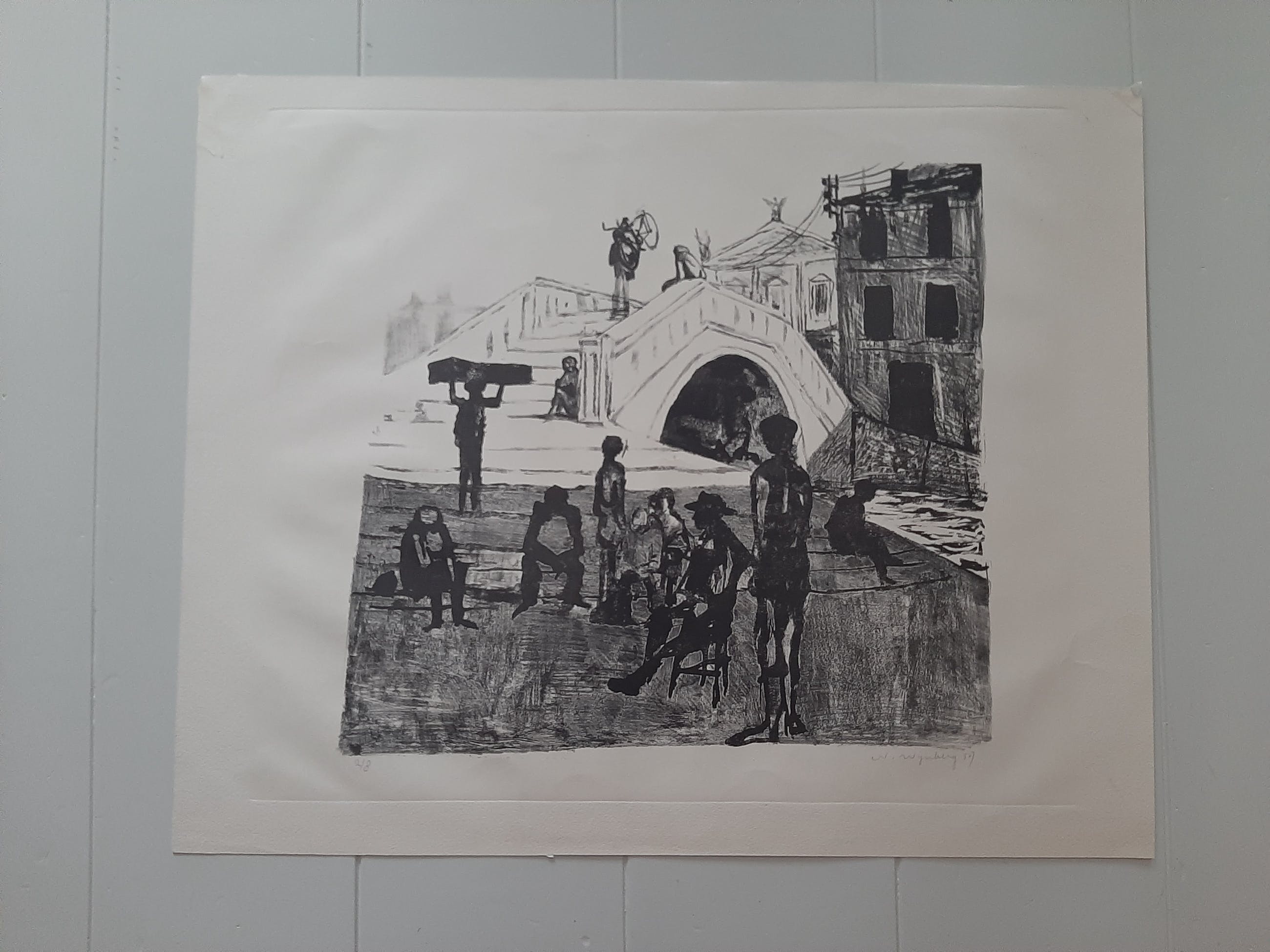 Vroege zwart wit litho. Voorstelling bestaat uit figuren die op een trap zitten die naar een brug leidt. Bovenop de brug een figuur met fiets op de nek. De vorm van de brug en de huizen doet aan Venetië denken maar het is geen portret van een stad, eerder een sfeertekening.