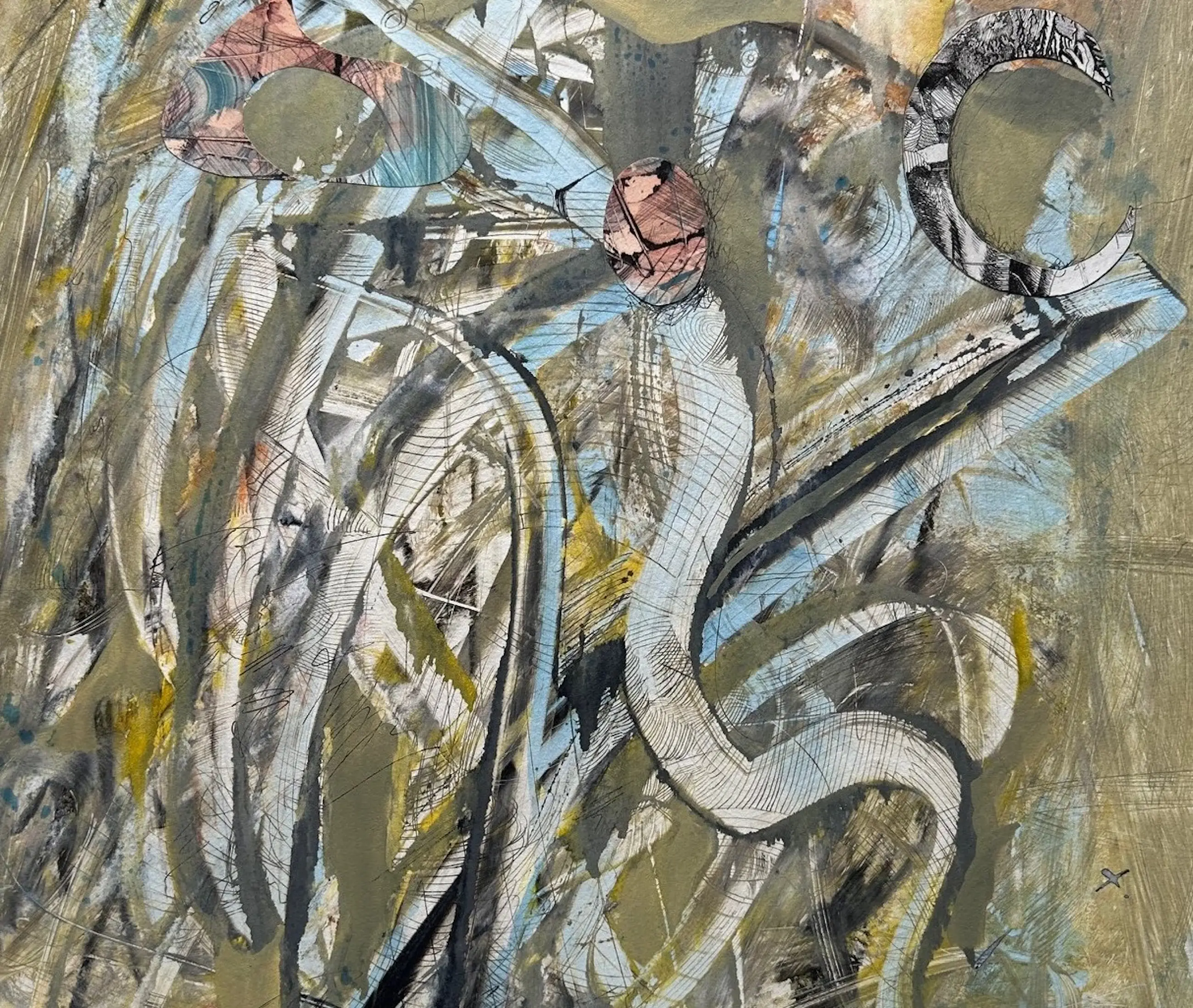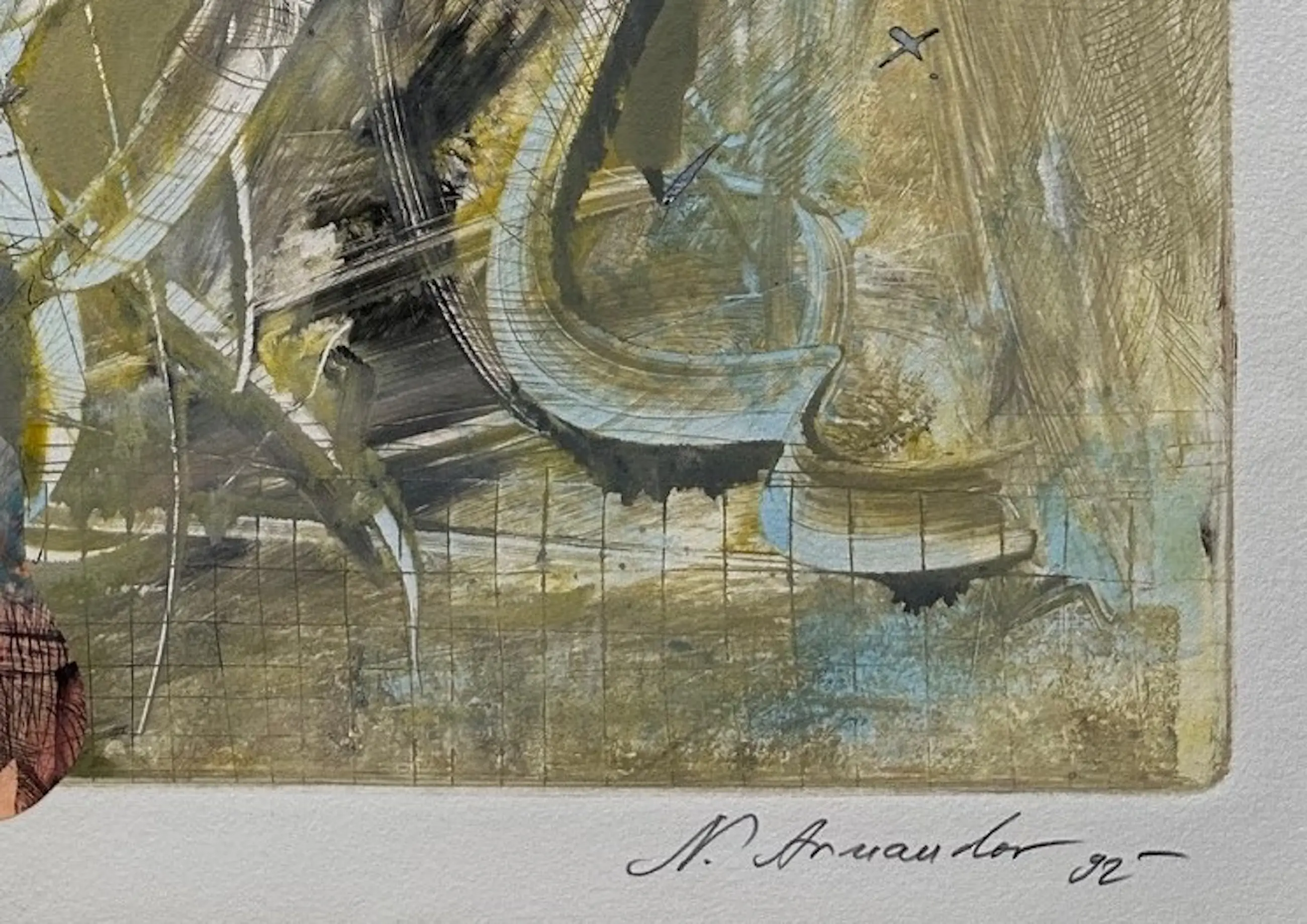 Nicolai Arnaudov (geb. 1960), The Game, Mischtechnik, 1992 Sehr guter Zustand, Unikat 1/1,Farbradierung mit Collage und Übermalung, betitelt unten links, handsigniert und datiert unten rechts. Maße Blatt: Höhe 73 cm, Breite 53 cm. Nikolai Arnaudov wurde in Varna, Bulgarien, geboren. Nach seinem Studium für Kunst- und Kunstgeschichte in St. Dimitrov und seiner Lehrtätigkeit für Kunst an einem bulgarischen Gymnasium siedelte er 1988 nach Deutschland über. Ab 1990 starteten seine zahlreichen Einzelausstellungen im In- und Ausland.