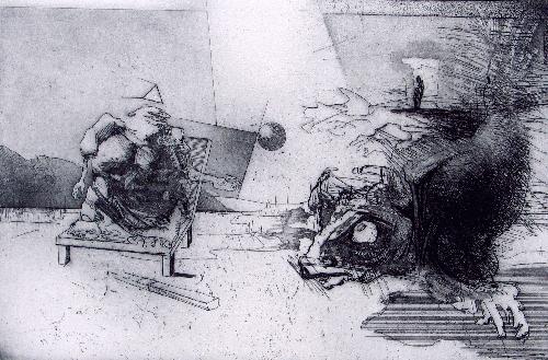 Nicolai Sarafov - Radierung, Schwarz/Weiss, 1985, "Feuchte Kuhgel" - Verkocht