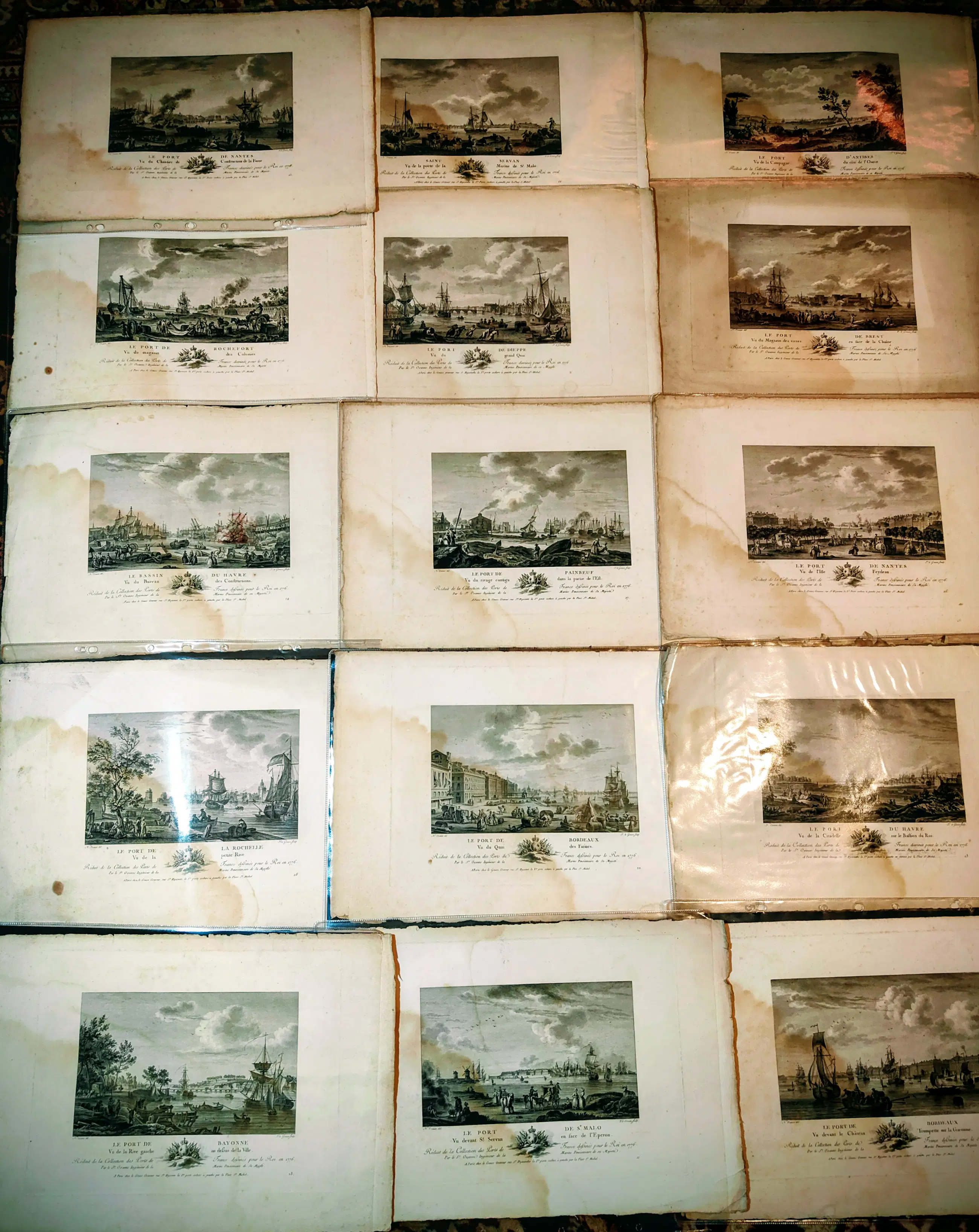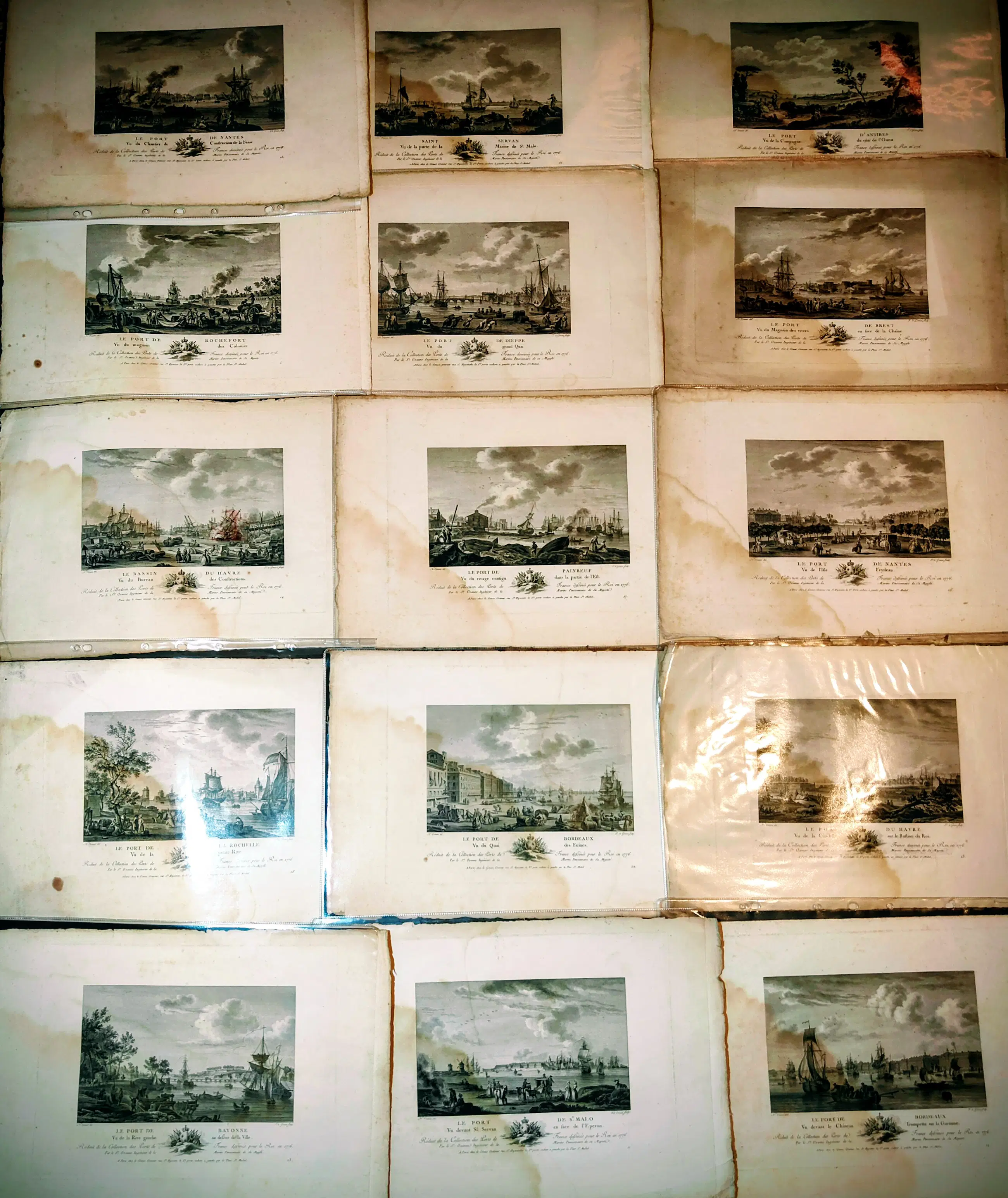 Een zeldzame en authentieke collectie originele 18e-eeuwse Franse gravures, met historische Franse havens en maritieme scènes.