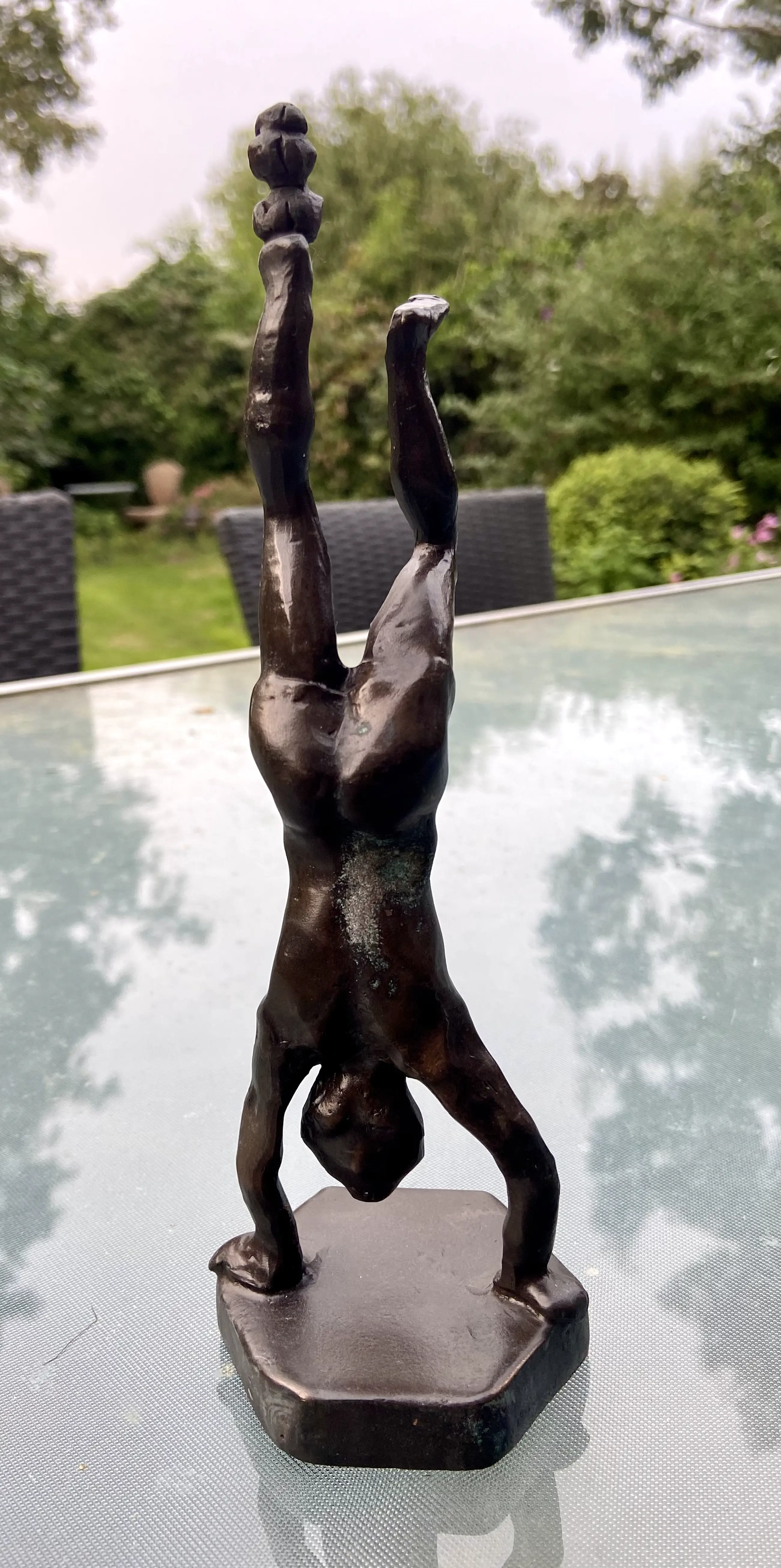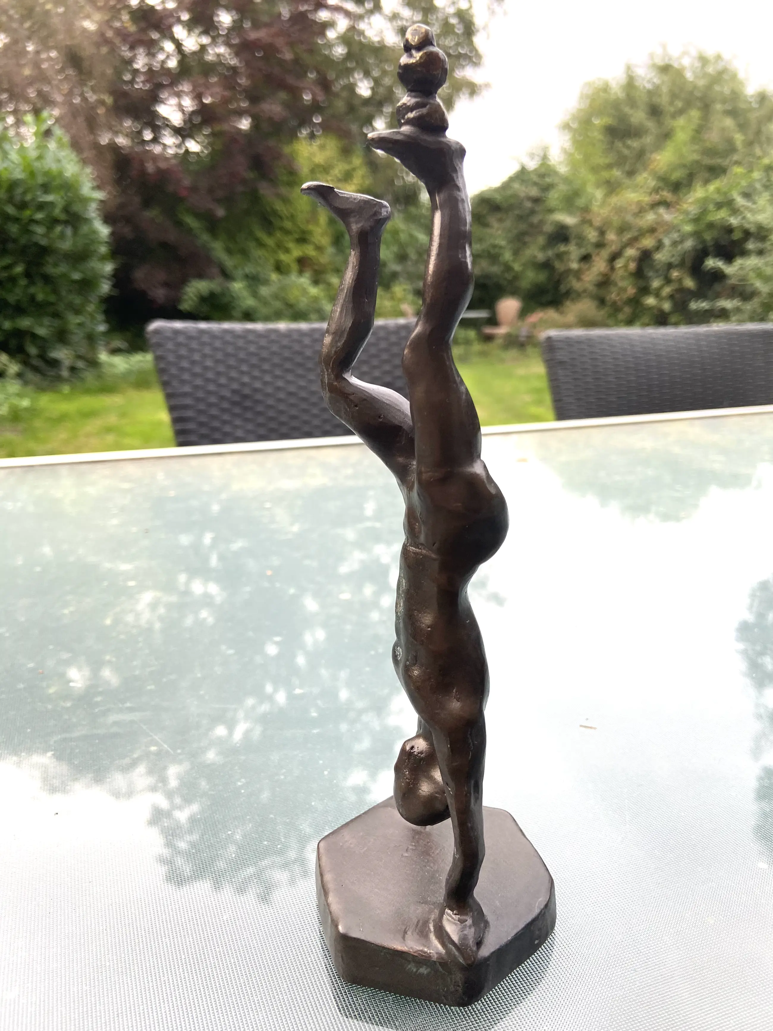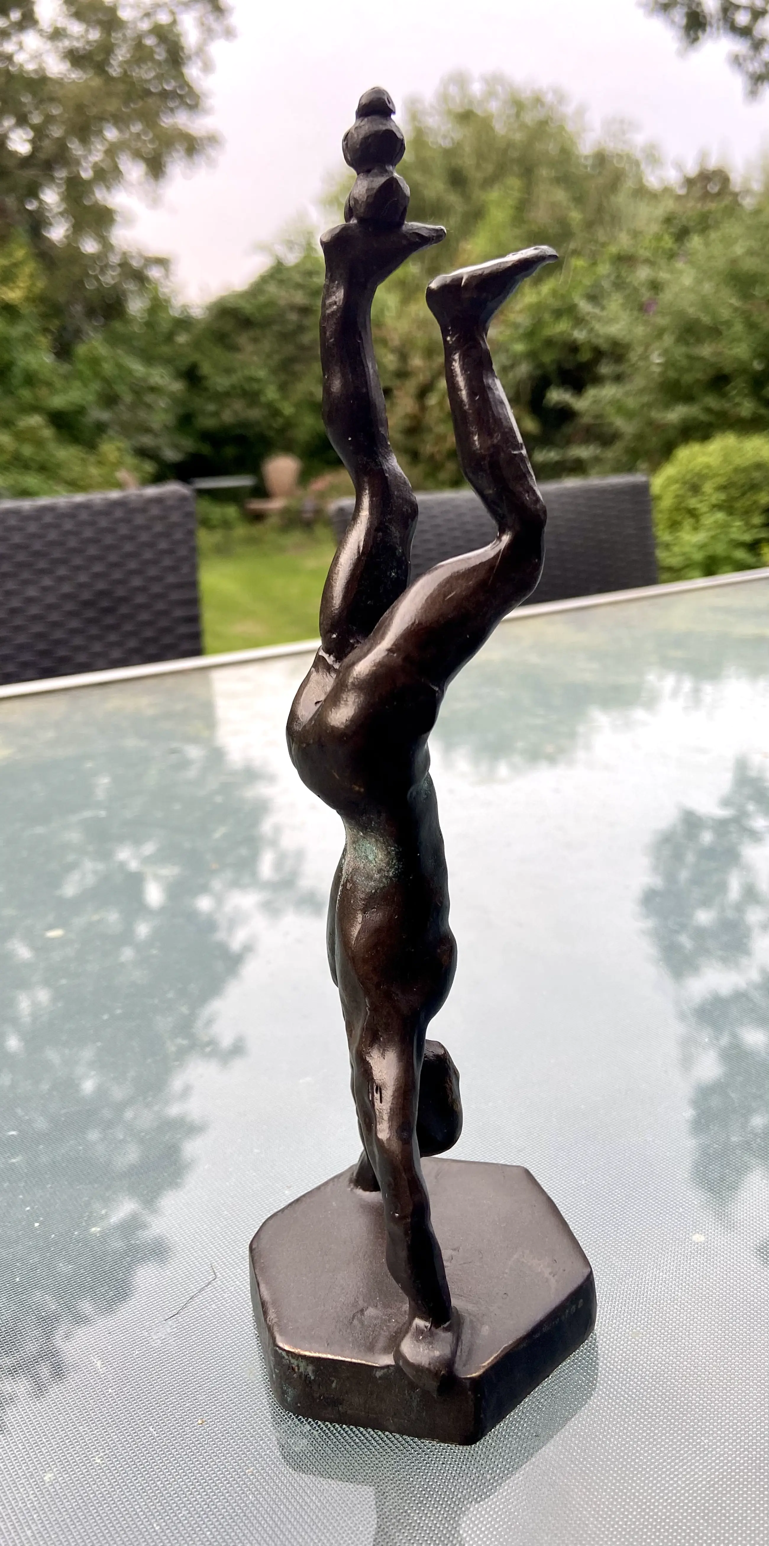 Bronzen beeldje van Nicolas Dings. Sportieve figuur van man die balans uitbeeldt. Zijn rechtervoet houdt 3 objecten in balans.