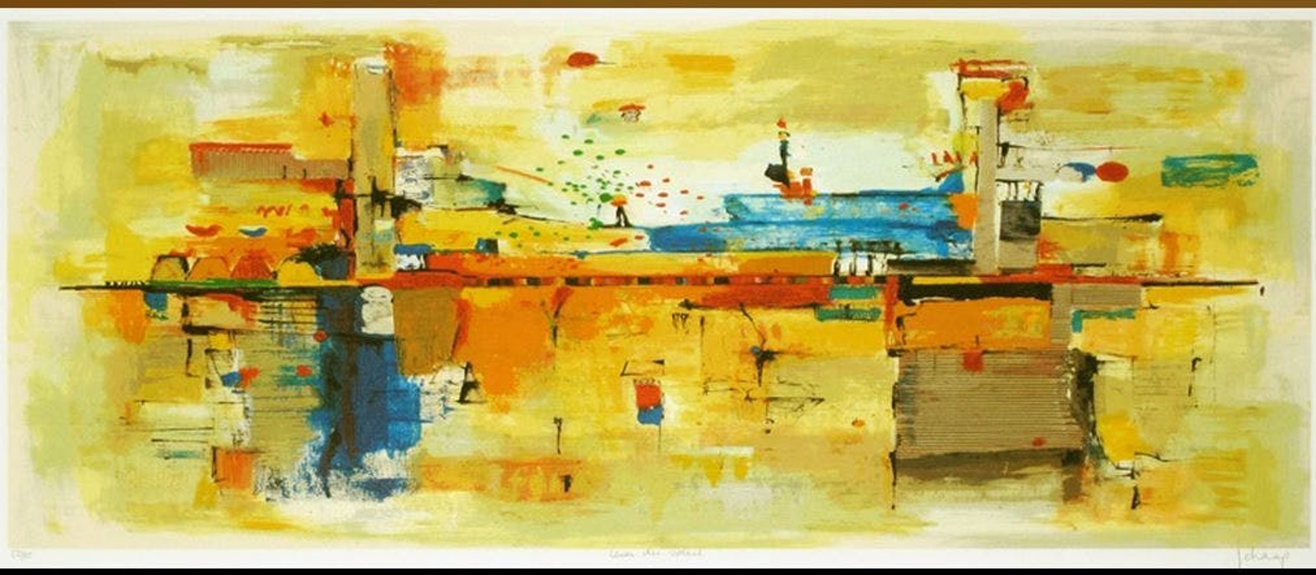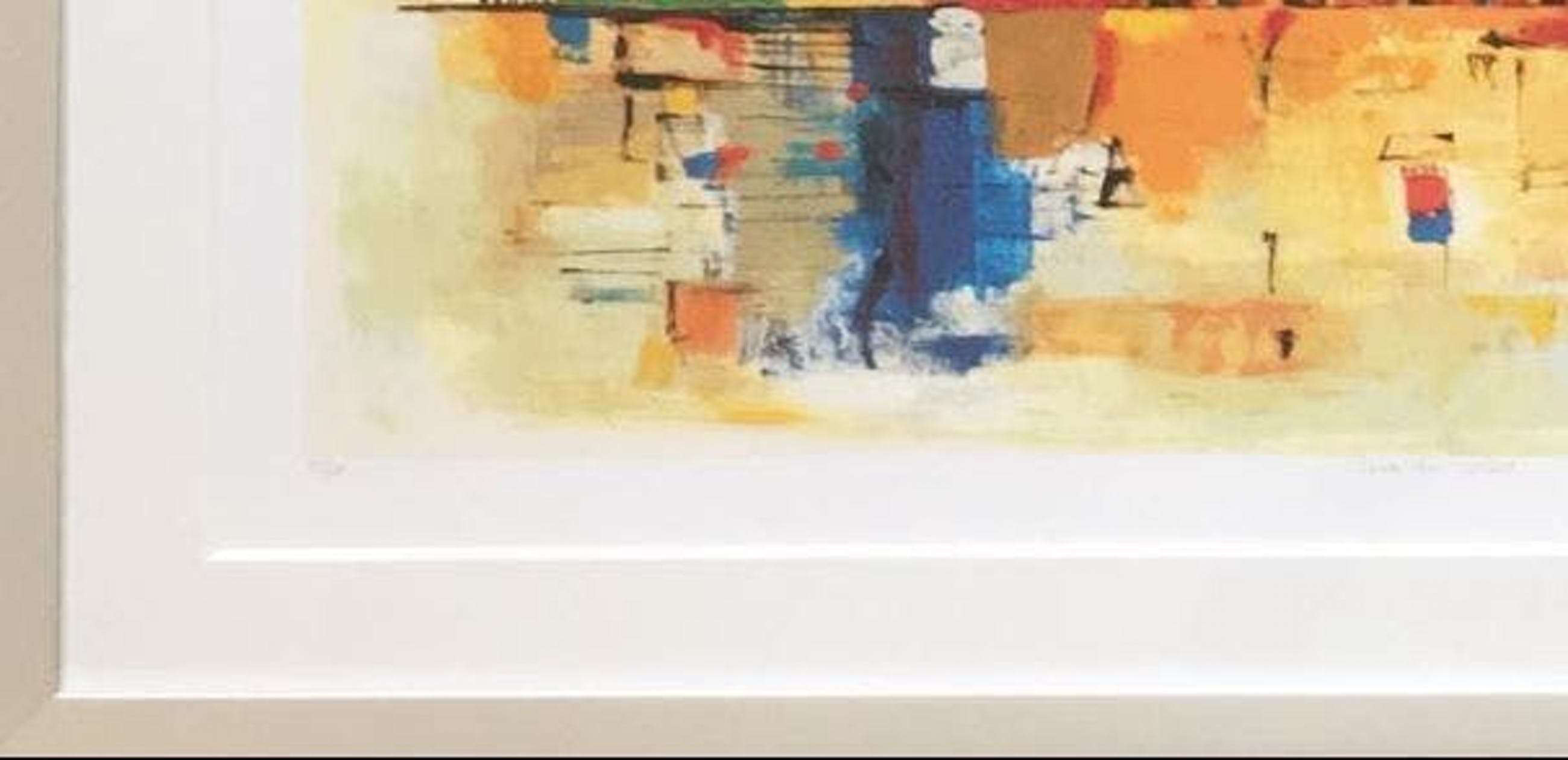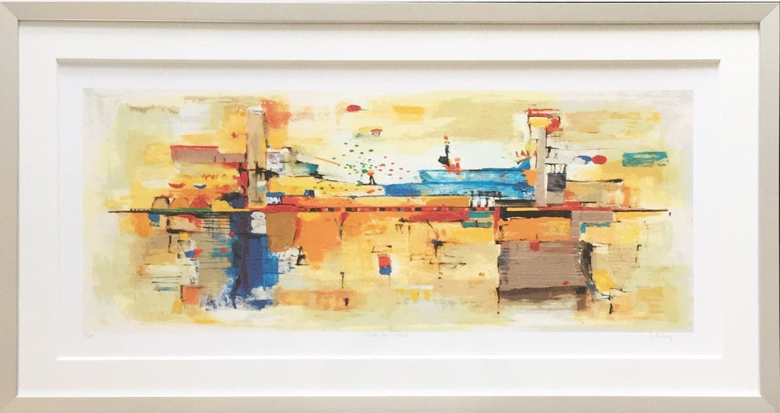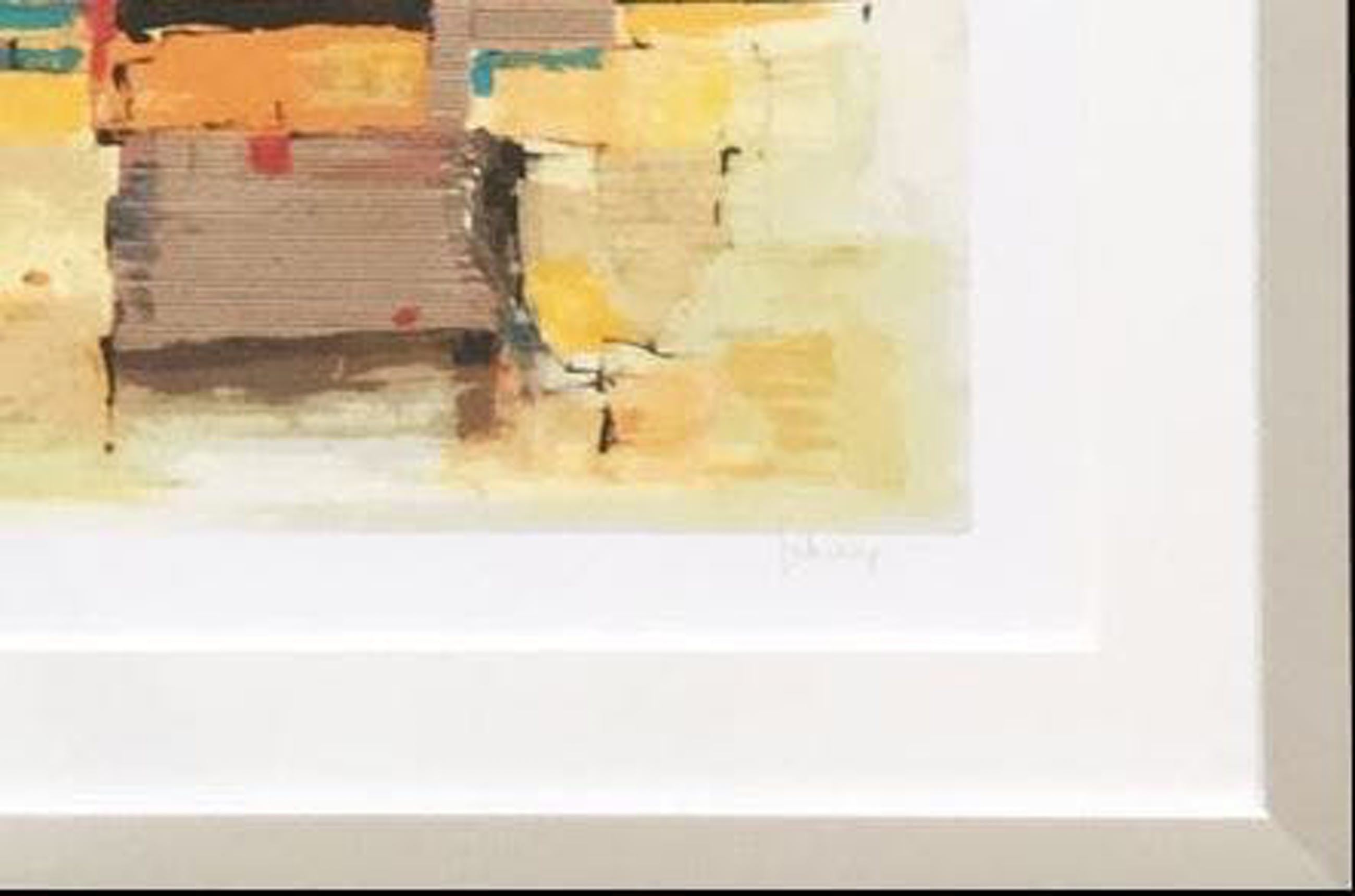 Nieuw ingelijst met dubbel passe-partoutNicole Schaap Titel: Lever du soleil. Hand Gesigneerd. Zeefdruk op stevig papier mooie Compositie. Afmetingen 120 x 65 cm. Oplage nummer 59 / 85. Conditie Perfect Nieuw