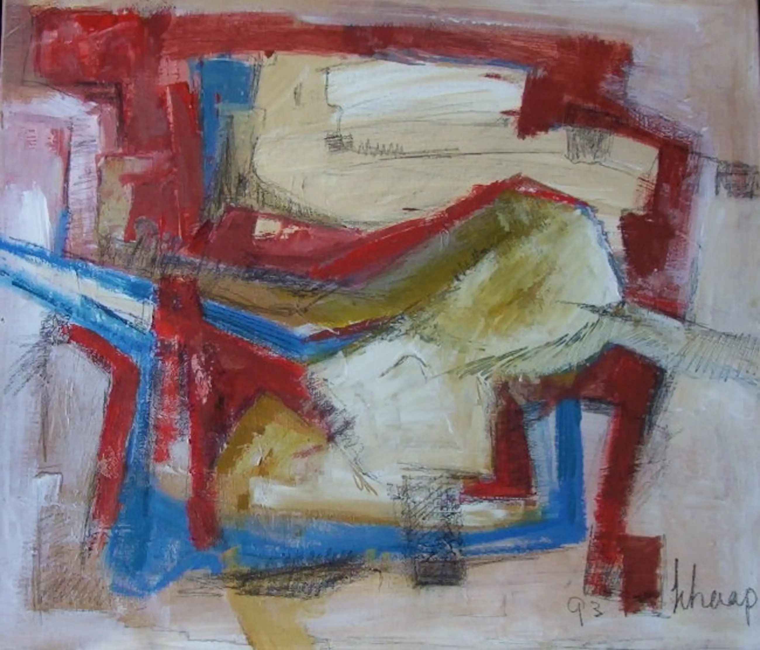Levendig olieverfschilderij in de haar kenmerkende stijl. Mooie heldere kleuren. In zwarte baklijst. Gesigneerd op voor- en achterzijde.